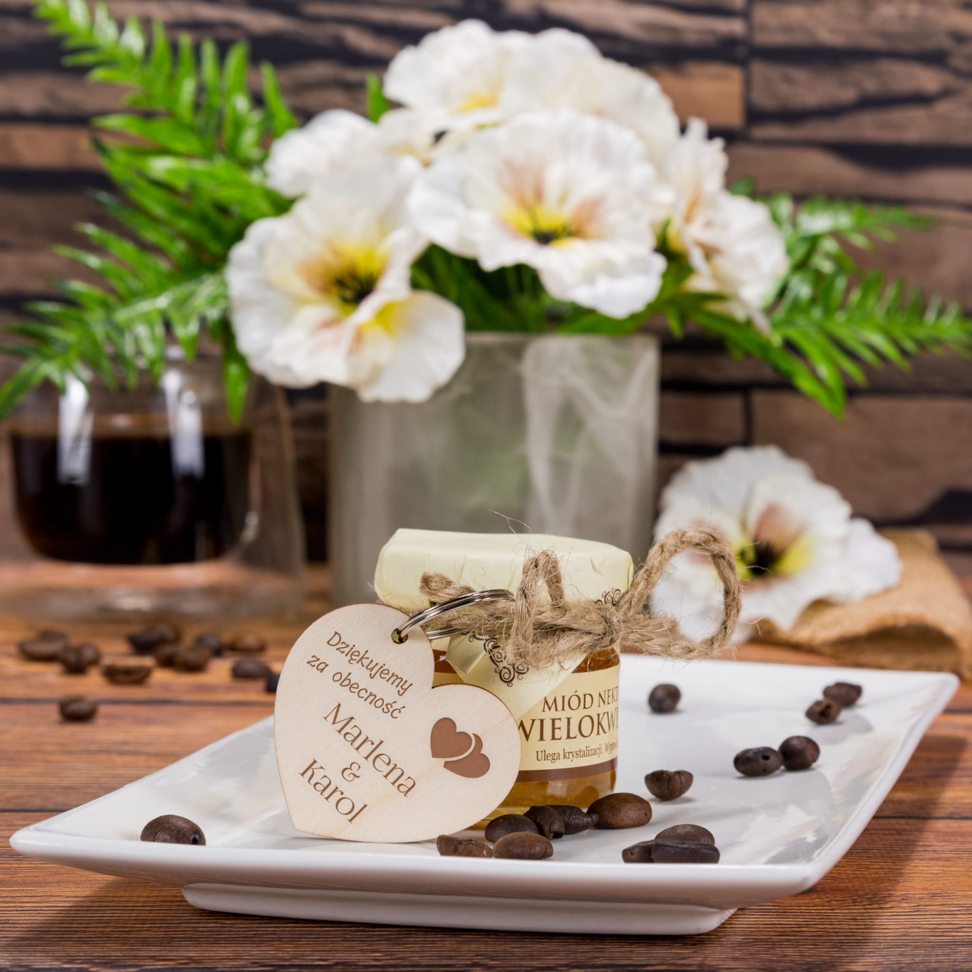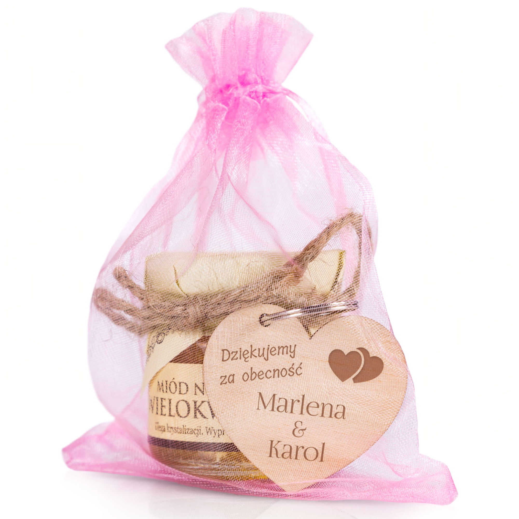 PODZIĘKOWANIA UPOMINKI DLA GOŚCI miodzik i breloczek serce grawer