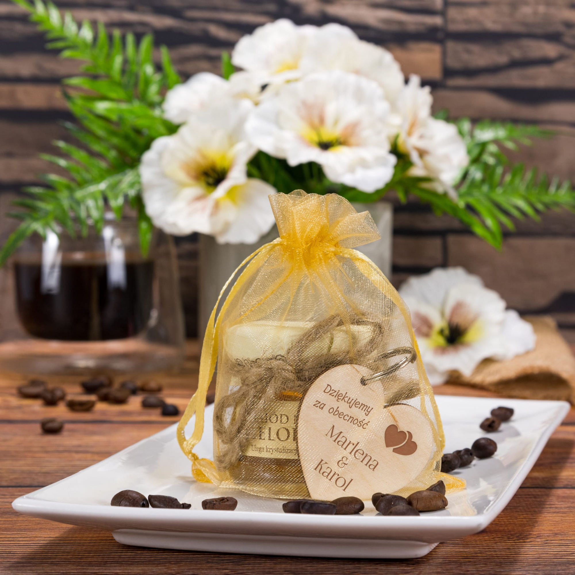 Drewniany breloczek Twój grawer i miodzik w ozdobnym woreczku super upominek dla gości na ślub