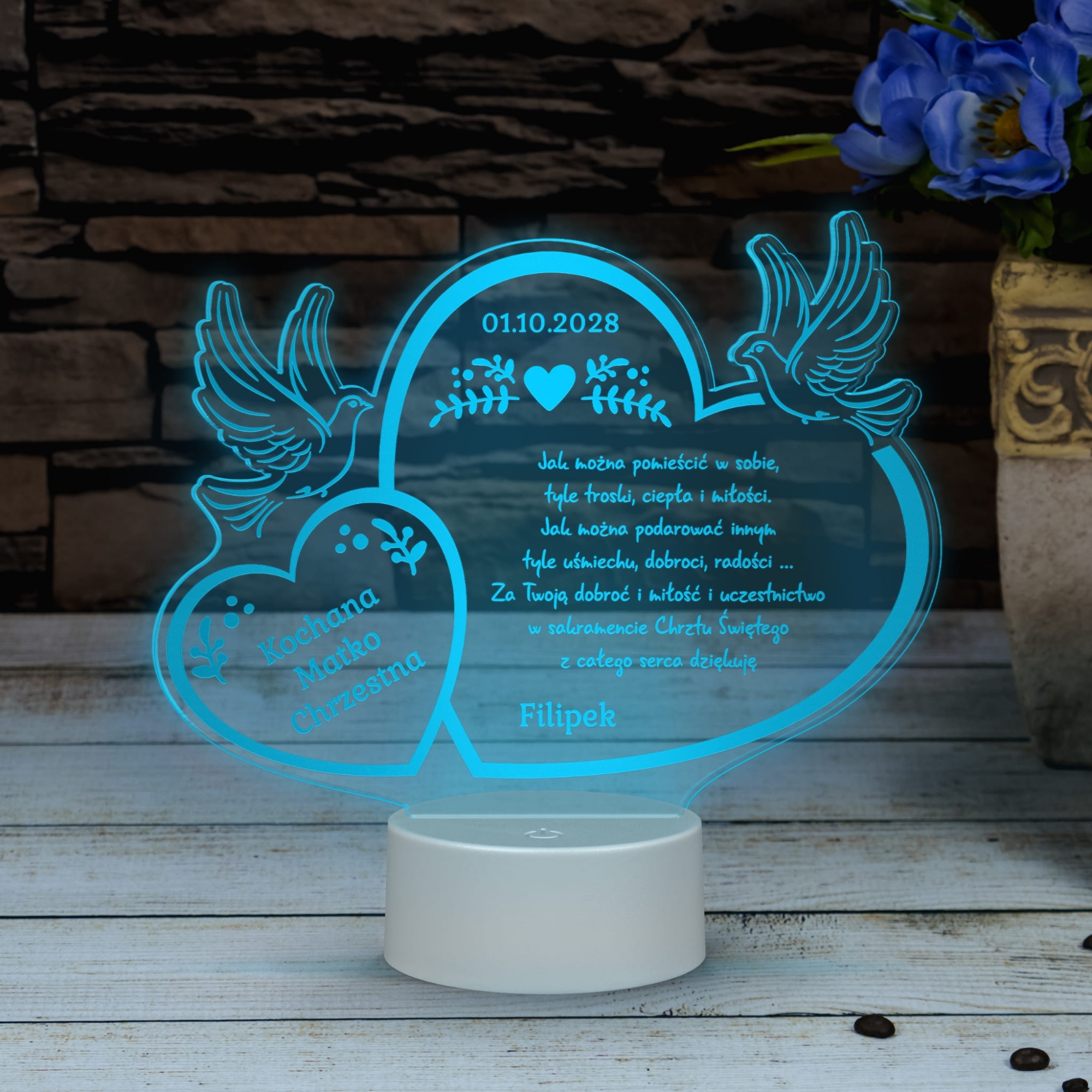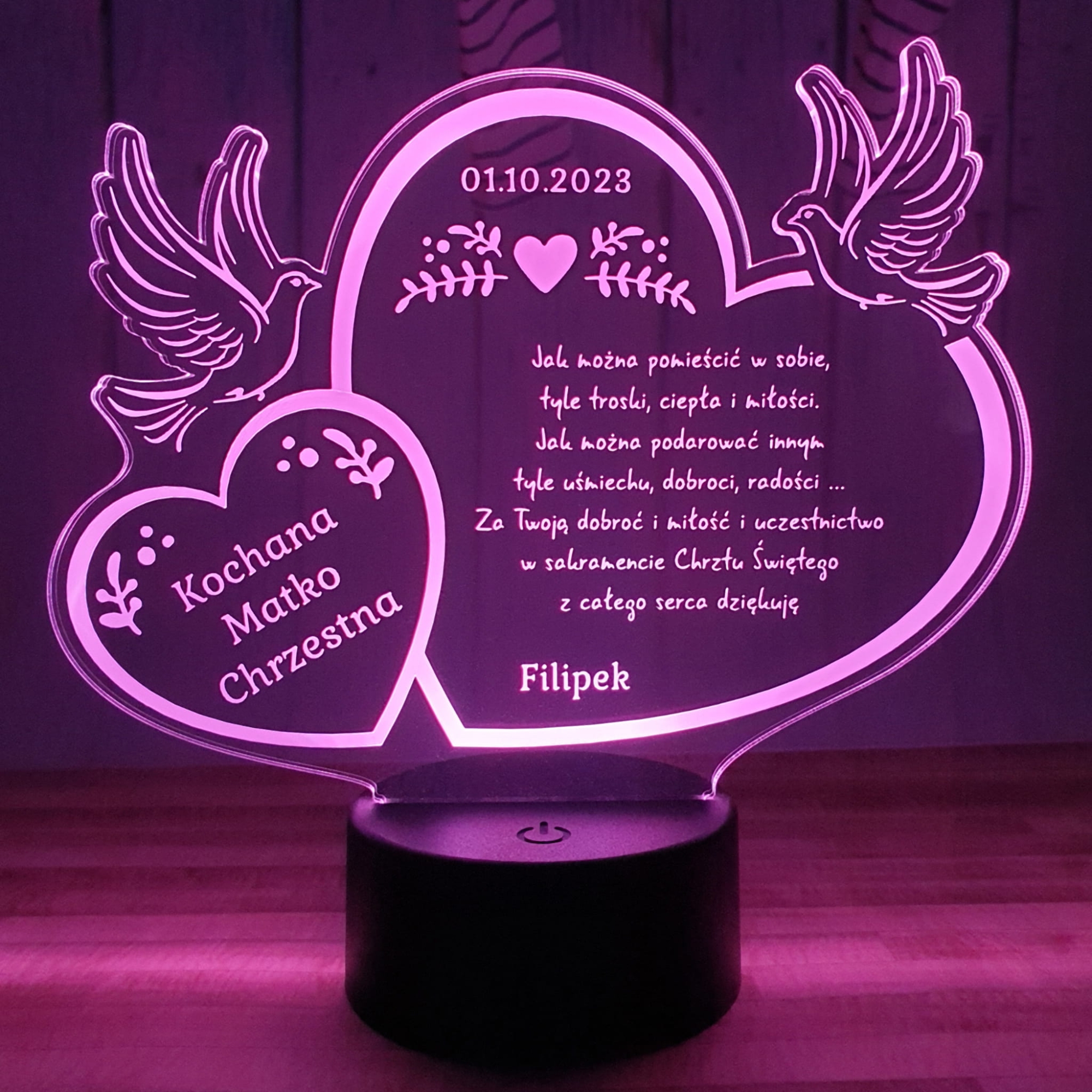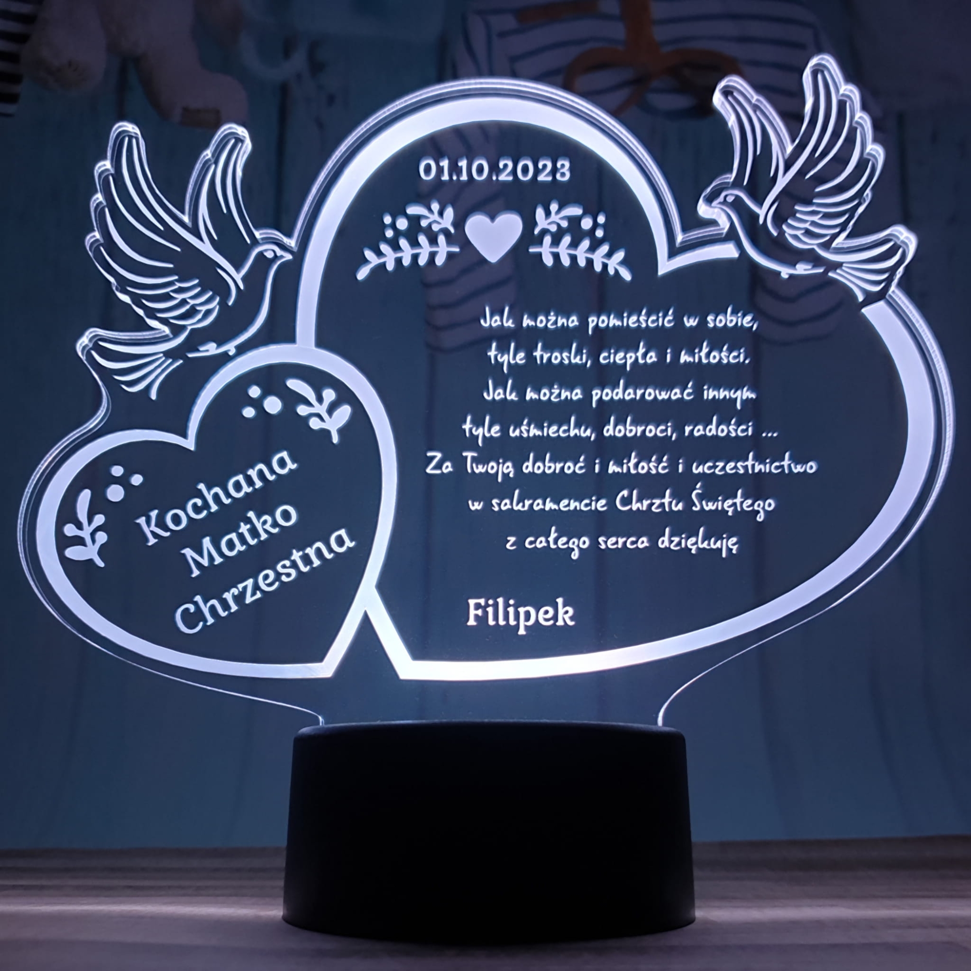 Szukasz wyjątkowego prezentu dla Chrzestnych Waszego maleństwa? Statuetka LED Podziękowania dla Chrzestnych to idealny wybór. Ta grawerowana statuetka jest nie tylko pięknym elementem dekoracyjnym, ale także wyrazem wdzięczności za podjęcie się tej ważnej roli w życiu dziecka. Statuetka jest wyposażona w subtelne oświetlenie LED, które nadaje jej blasku i magii. Możesz dostosować kolor światła, tworząc unikalny nastrój. Ta wyjątkowa statuetka podziękowanie na chrzest będzie pamiątką z tego szczególnego dnia dla rodziców chrzestnych na wiele lat.