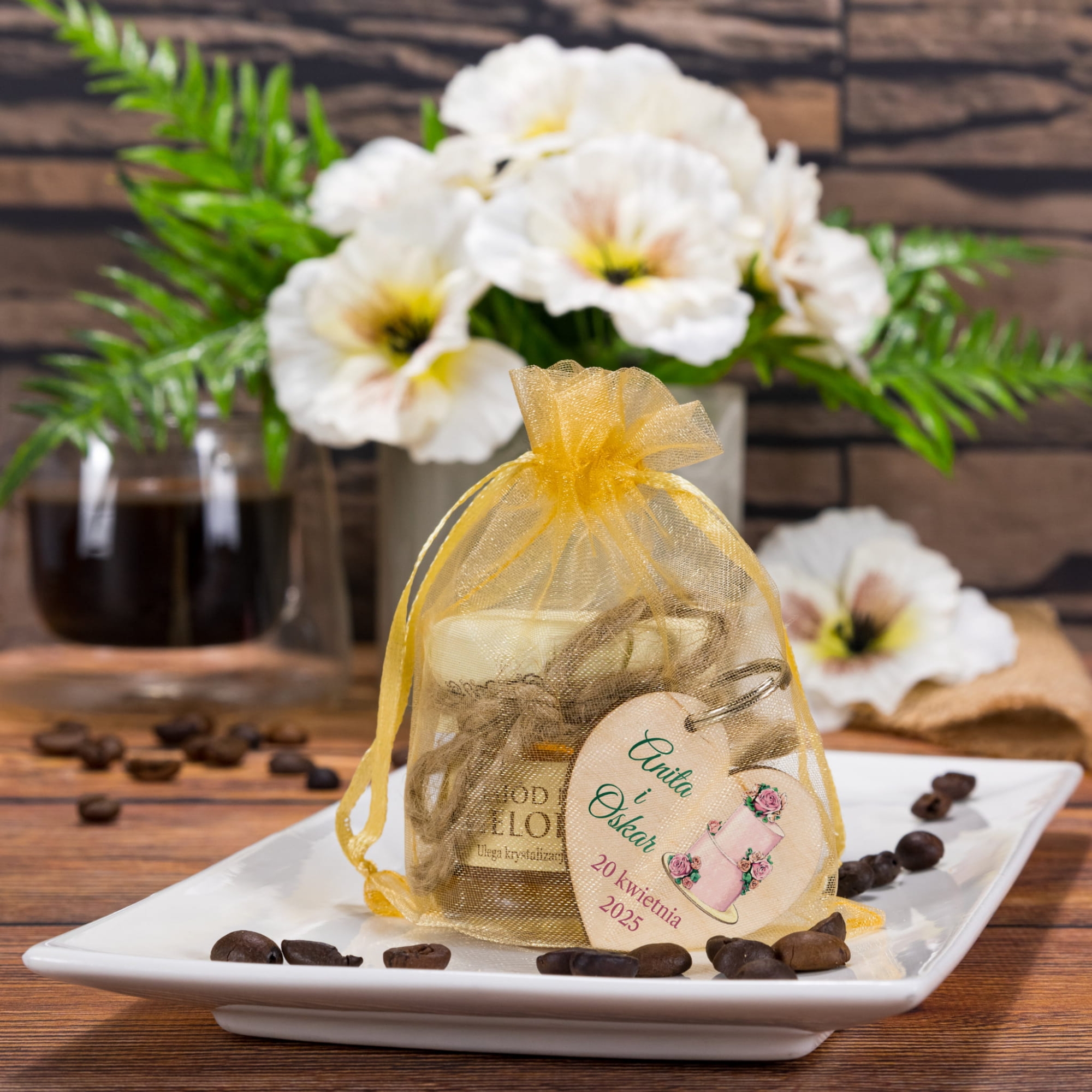 Miód i brelok serce w ozdobnym woreczku pomysł na upominki dla gości na wesele