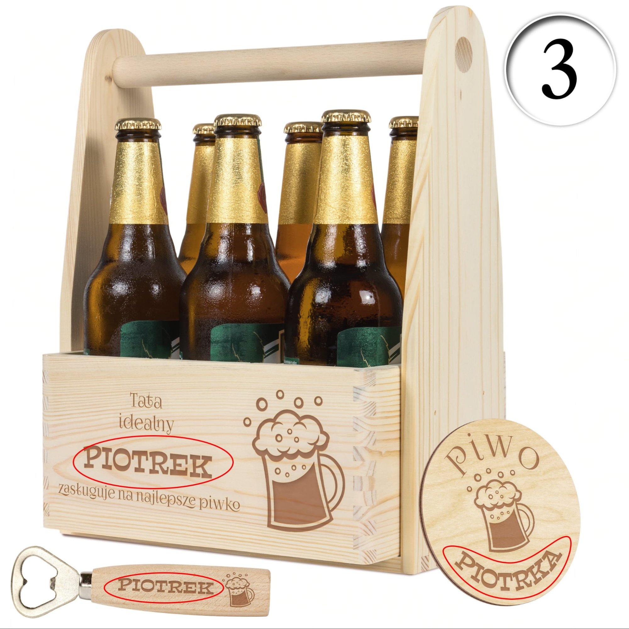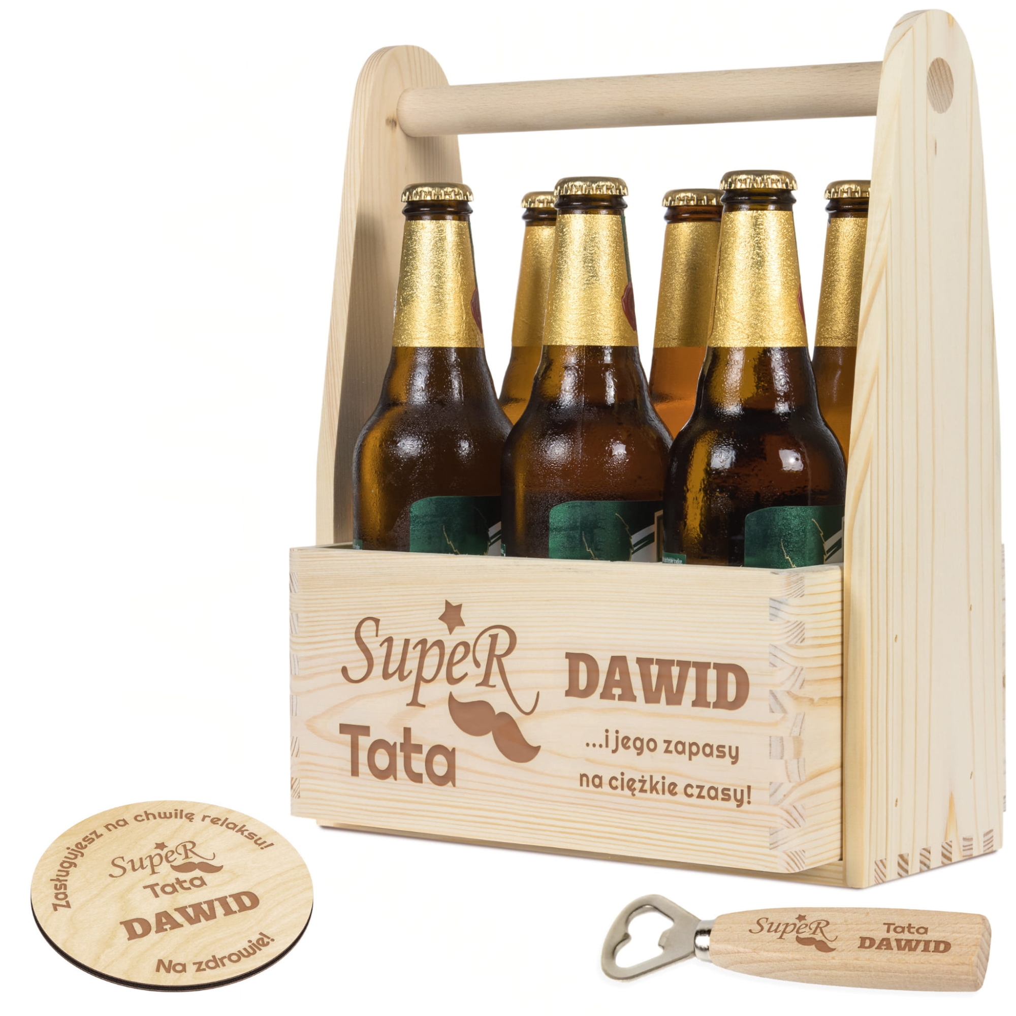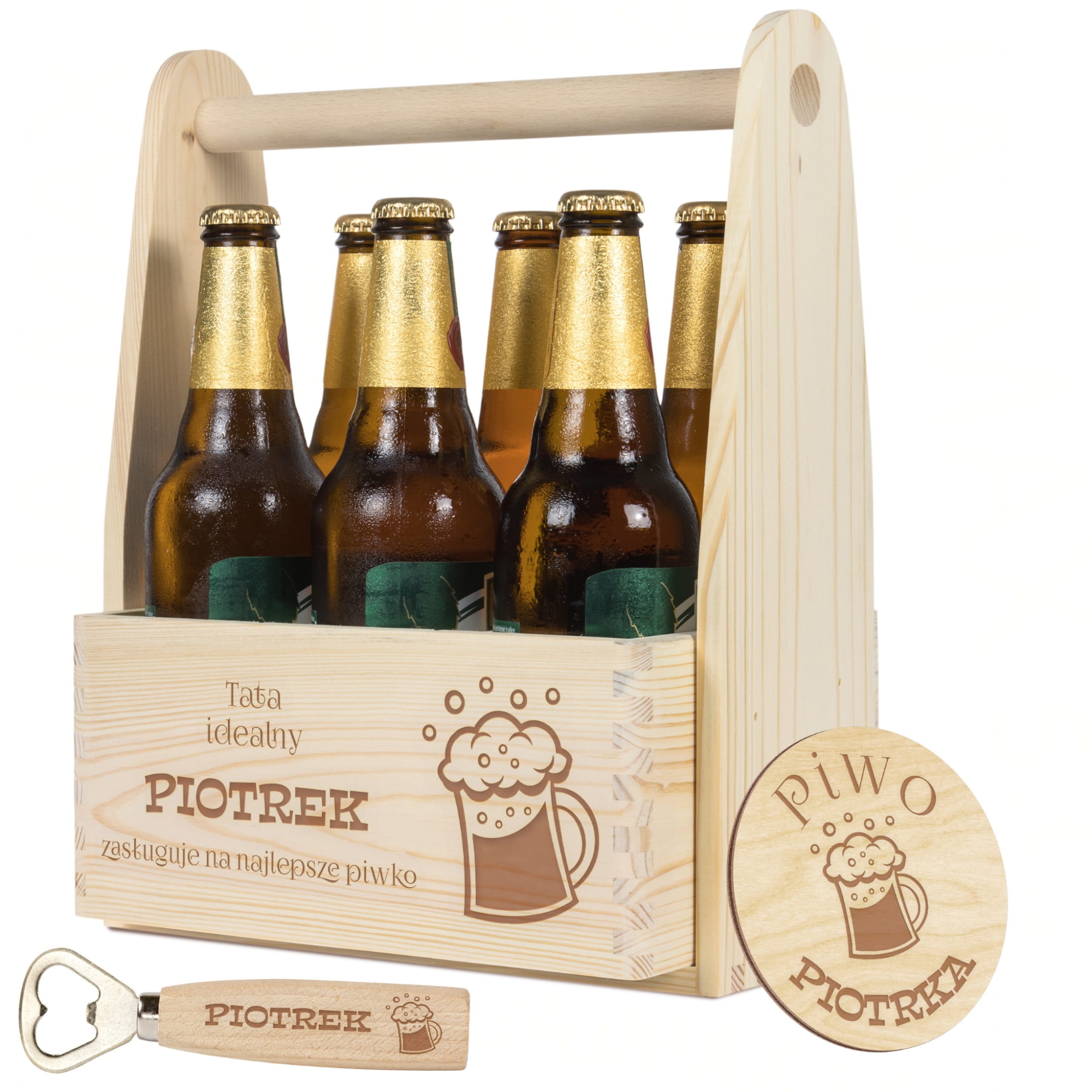 - W zestawie: drewniane nosidło, otwieracz do butelek, podkładka pod kufel/butelkę
