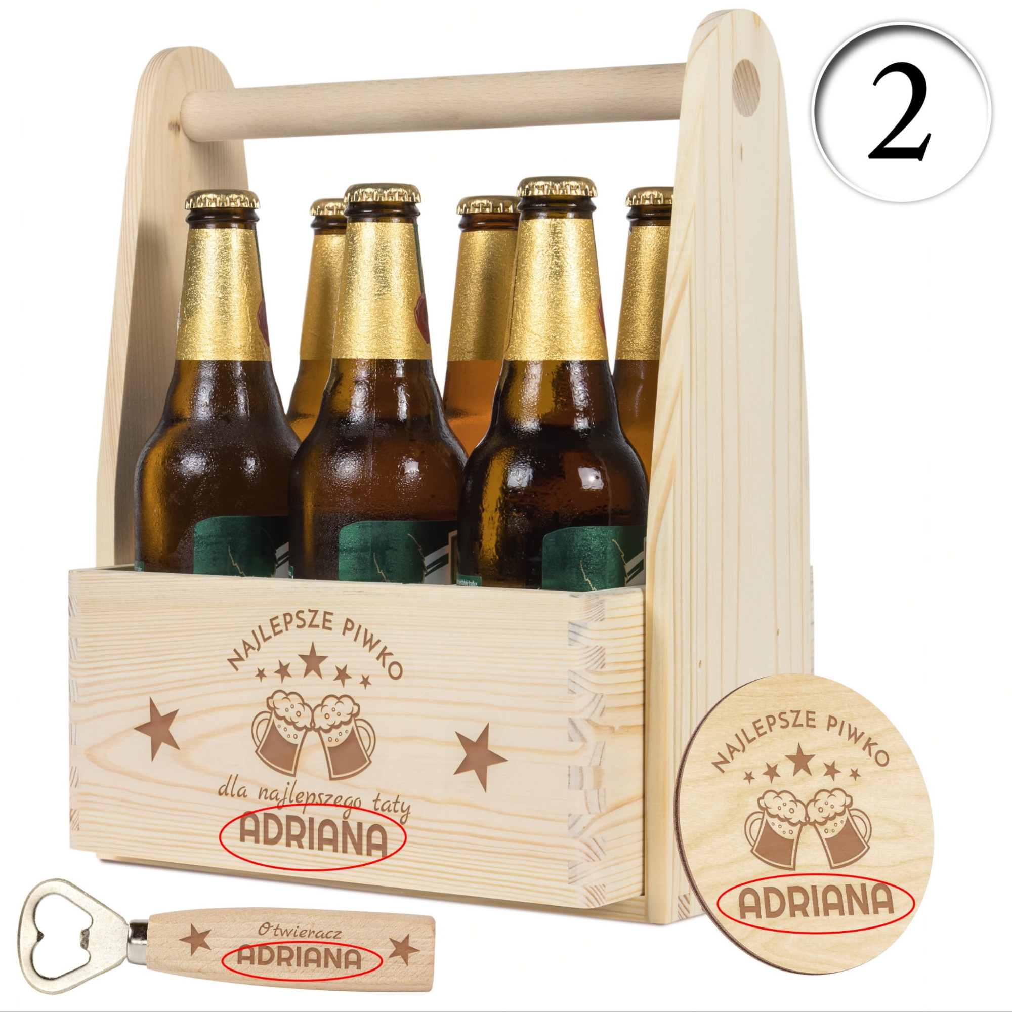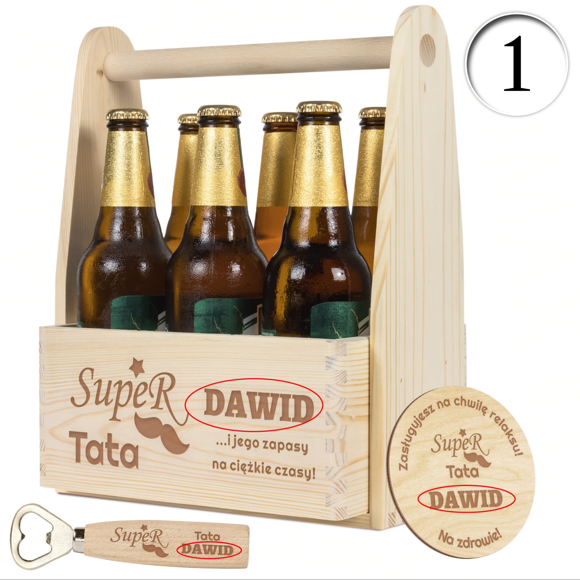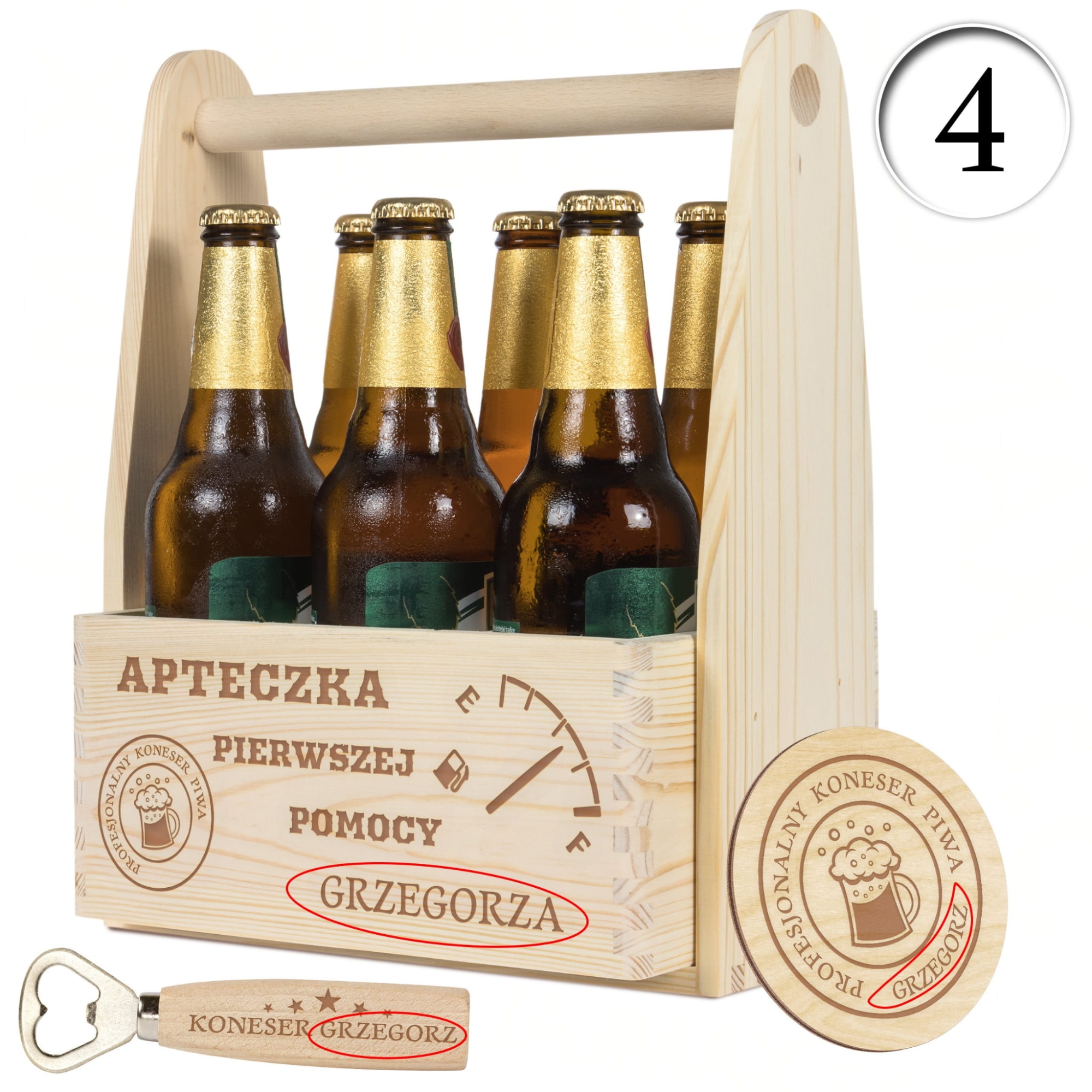 - W zestawie: drewniane nosidło, otwieracz do butelek, podkładka pod kufel/butelkę