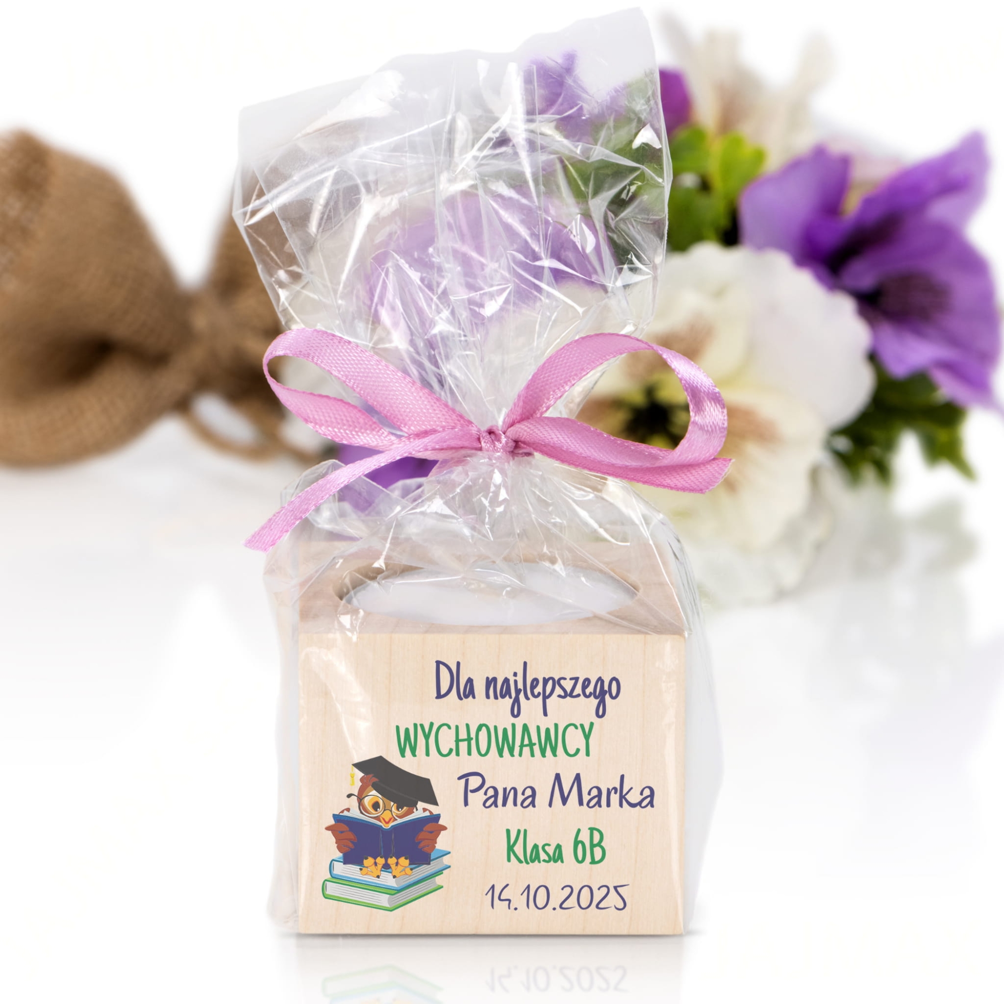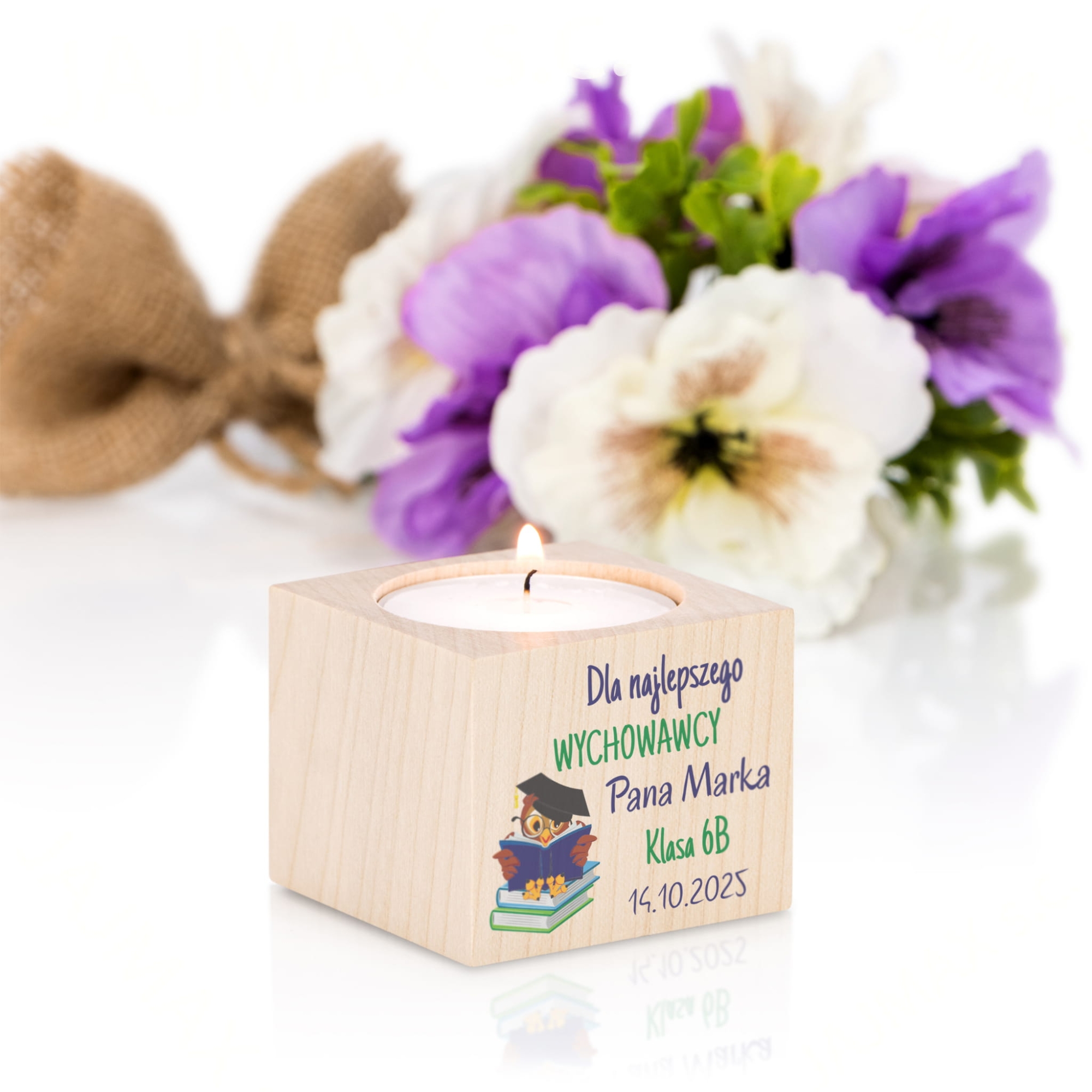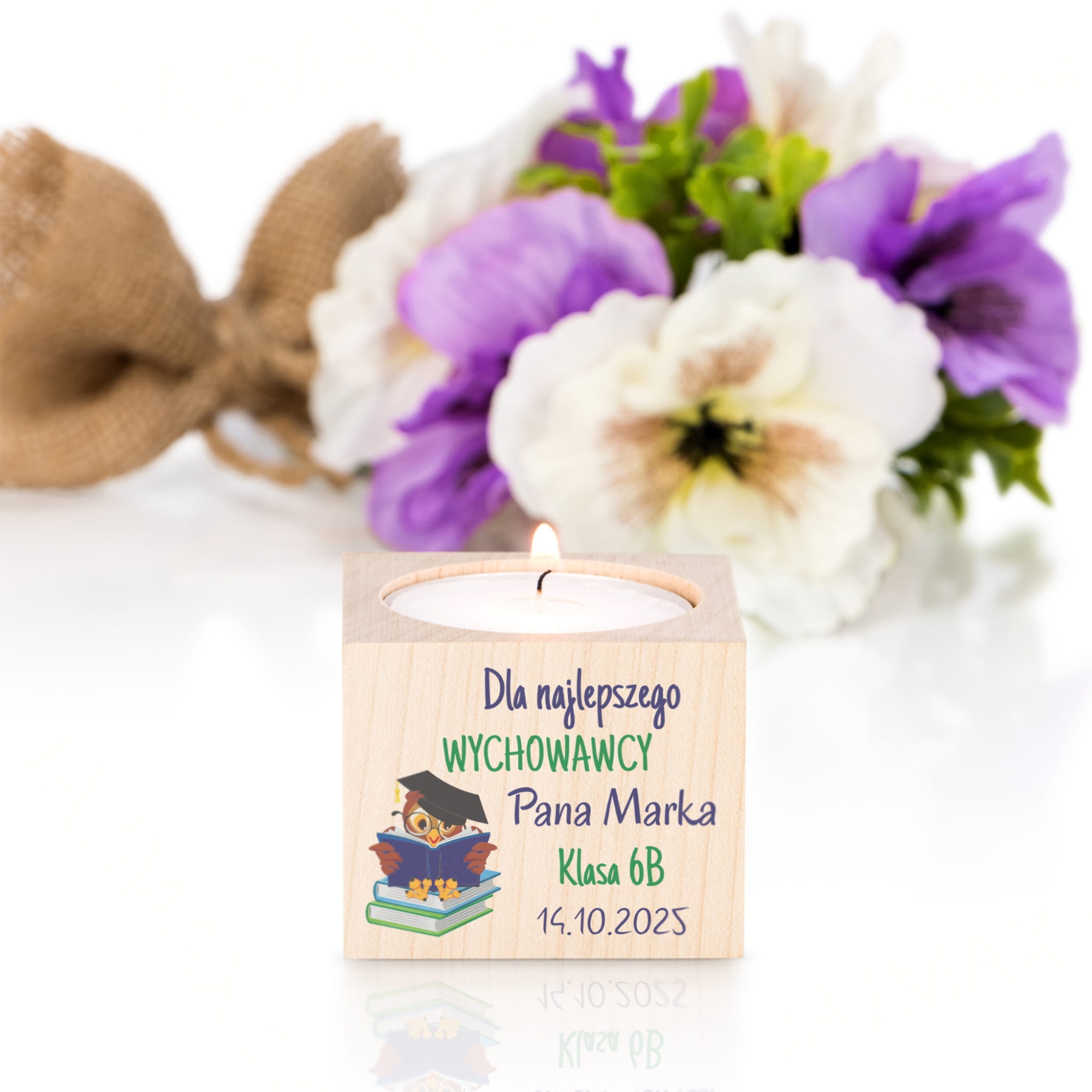POMYSŁ NA UPOMINEK DLA WYCHOWAWCY świecznik drewno z podpisem
