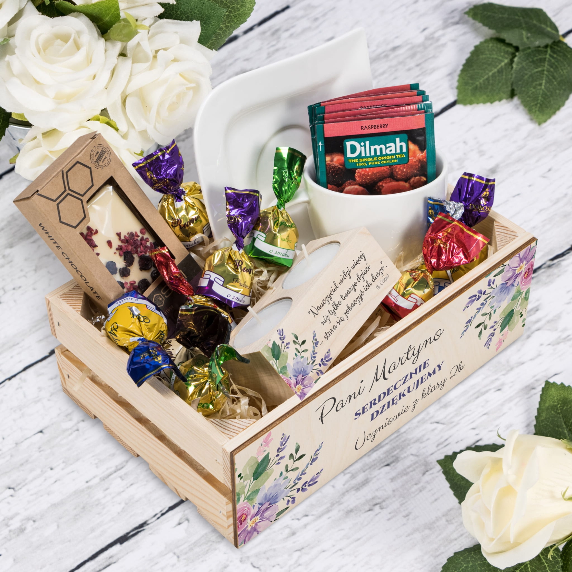 - drewniana skrzyneczka z dedykacją z wełną drzewną,