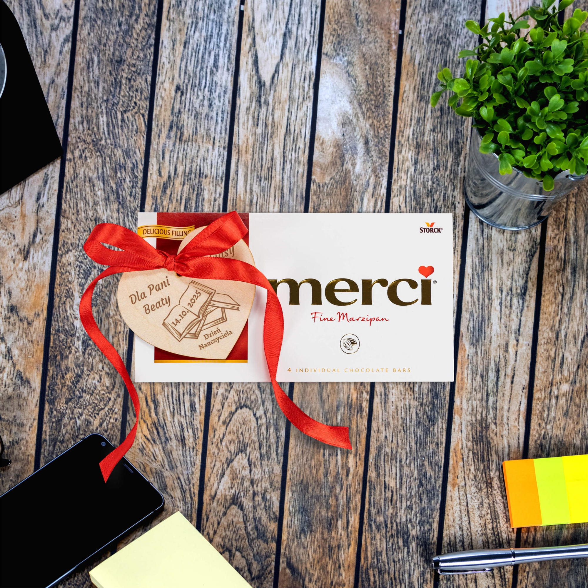 | Zawartość zestawu: | czekolada Merci 100 g, drewniane serce z taśmą dwustronną i wstążką |