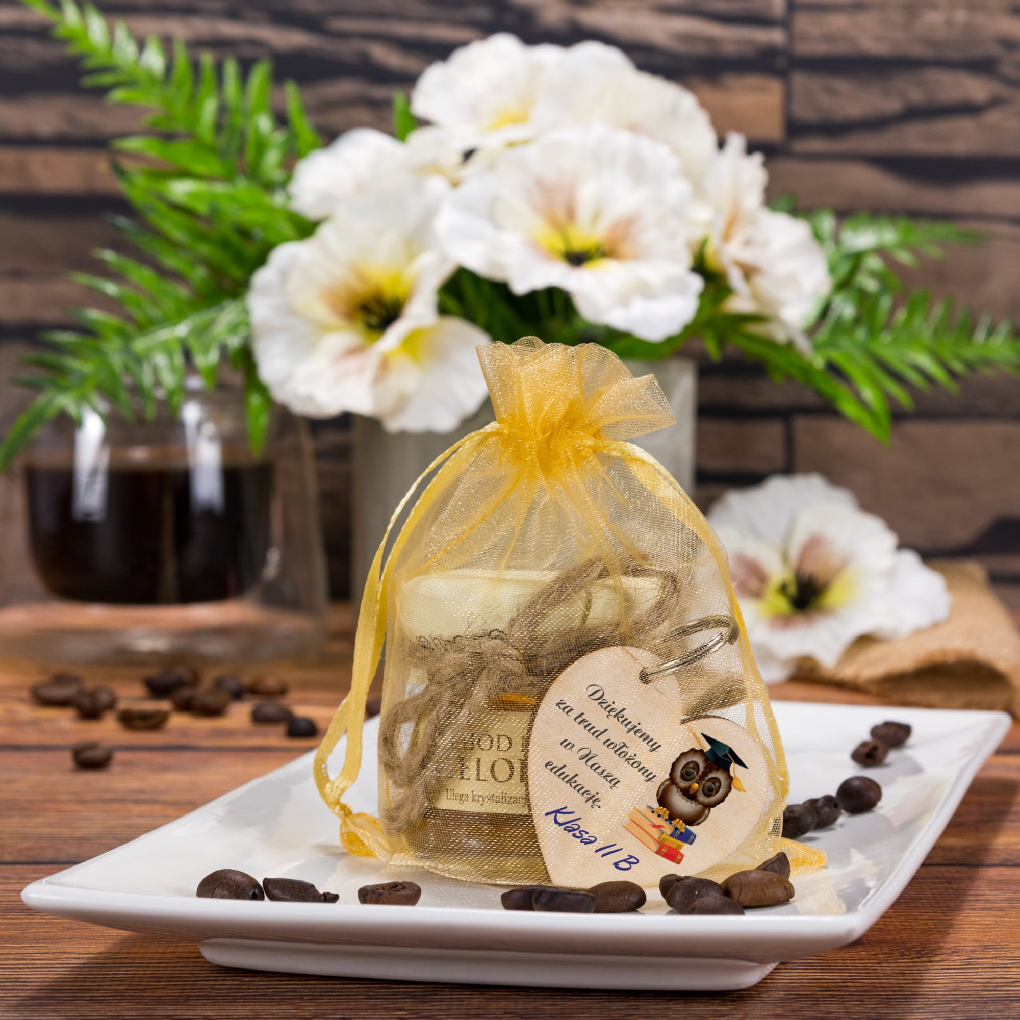 Podziękowanie na Dzień Nauczyciela zestaw miodzik i breloczek z dedykacją