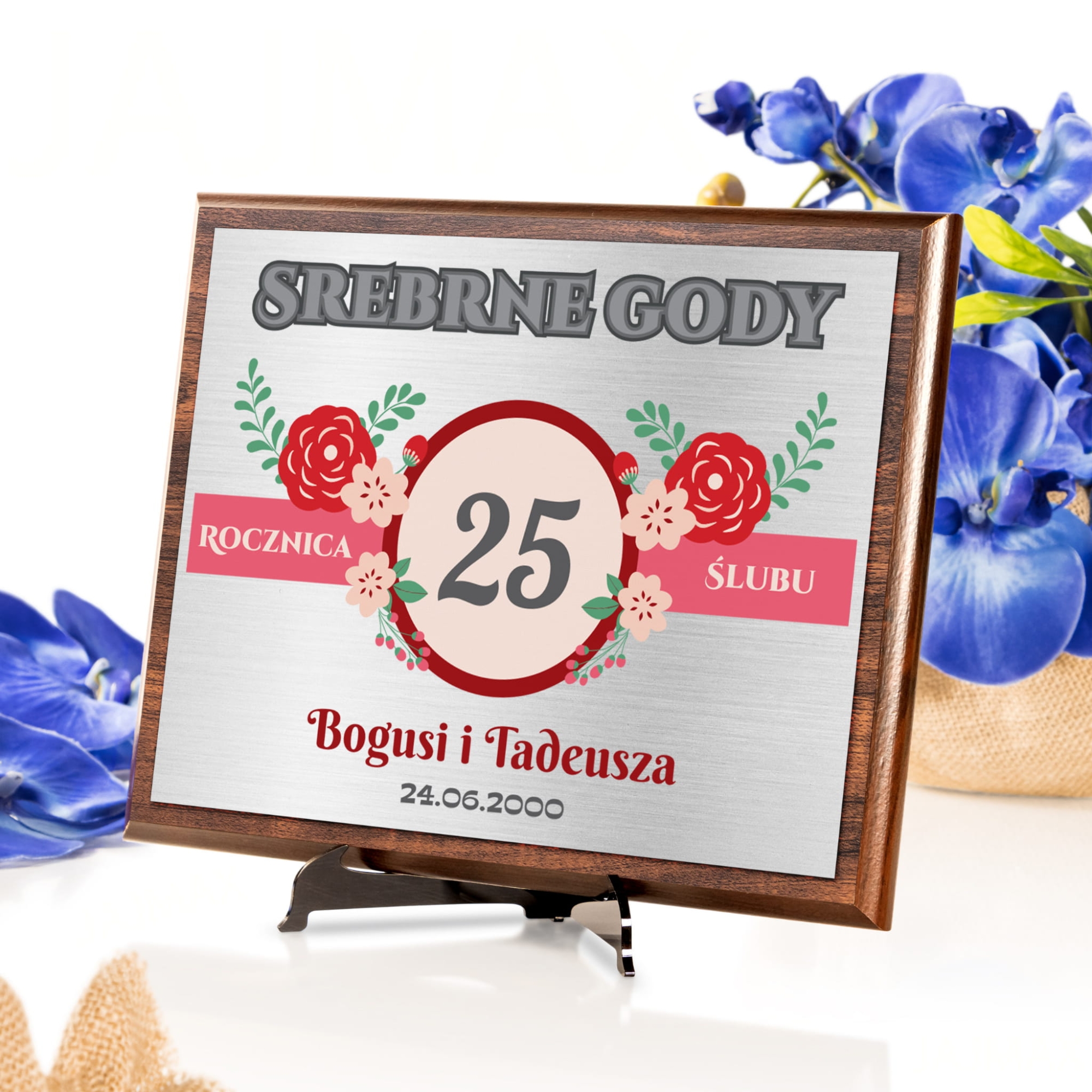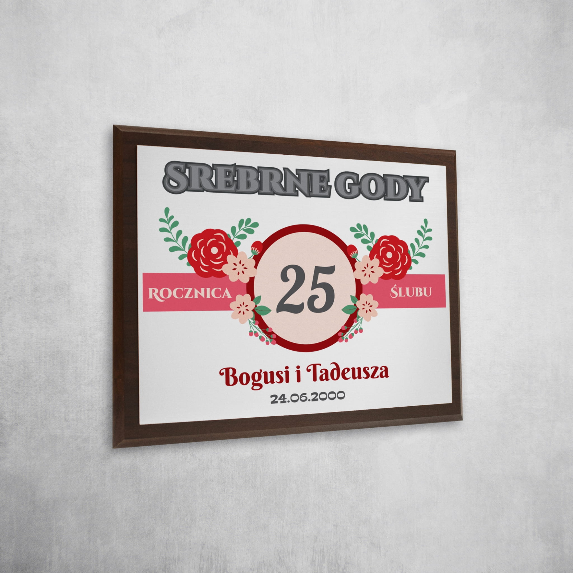 Życzenia rocznicowe srebrne gody 25 rocznica ślubu drewniany obrazek z nadrukiem