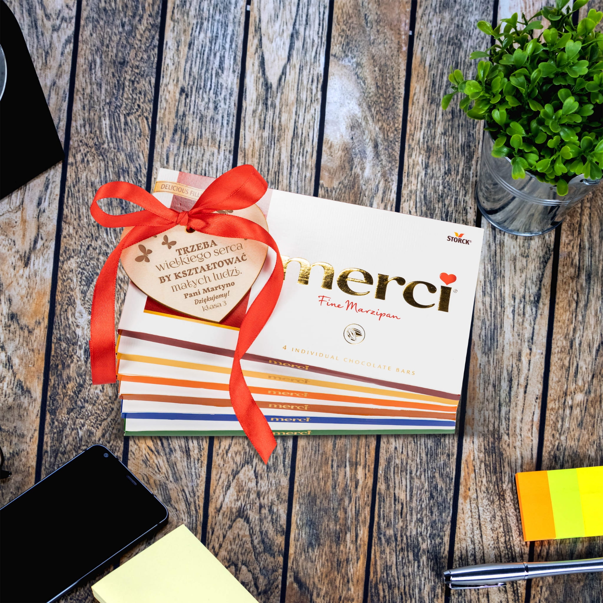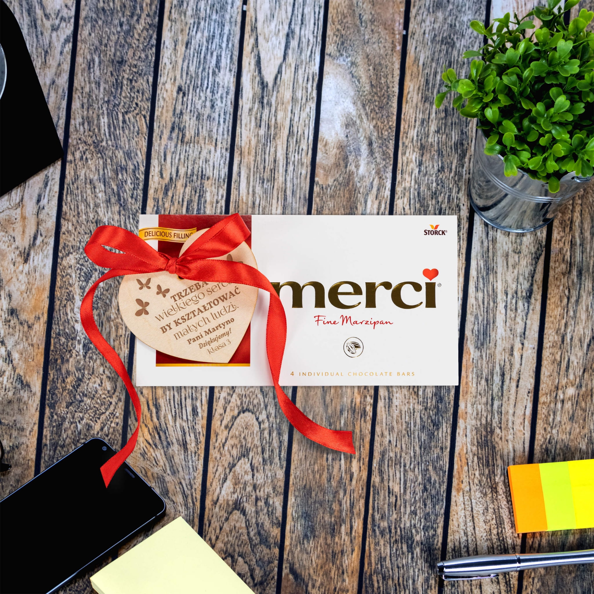 PREZENT Z CYTATEM DLA NAUCZYCIELA czekoladki Merci i serce z grawerem
