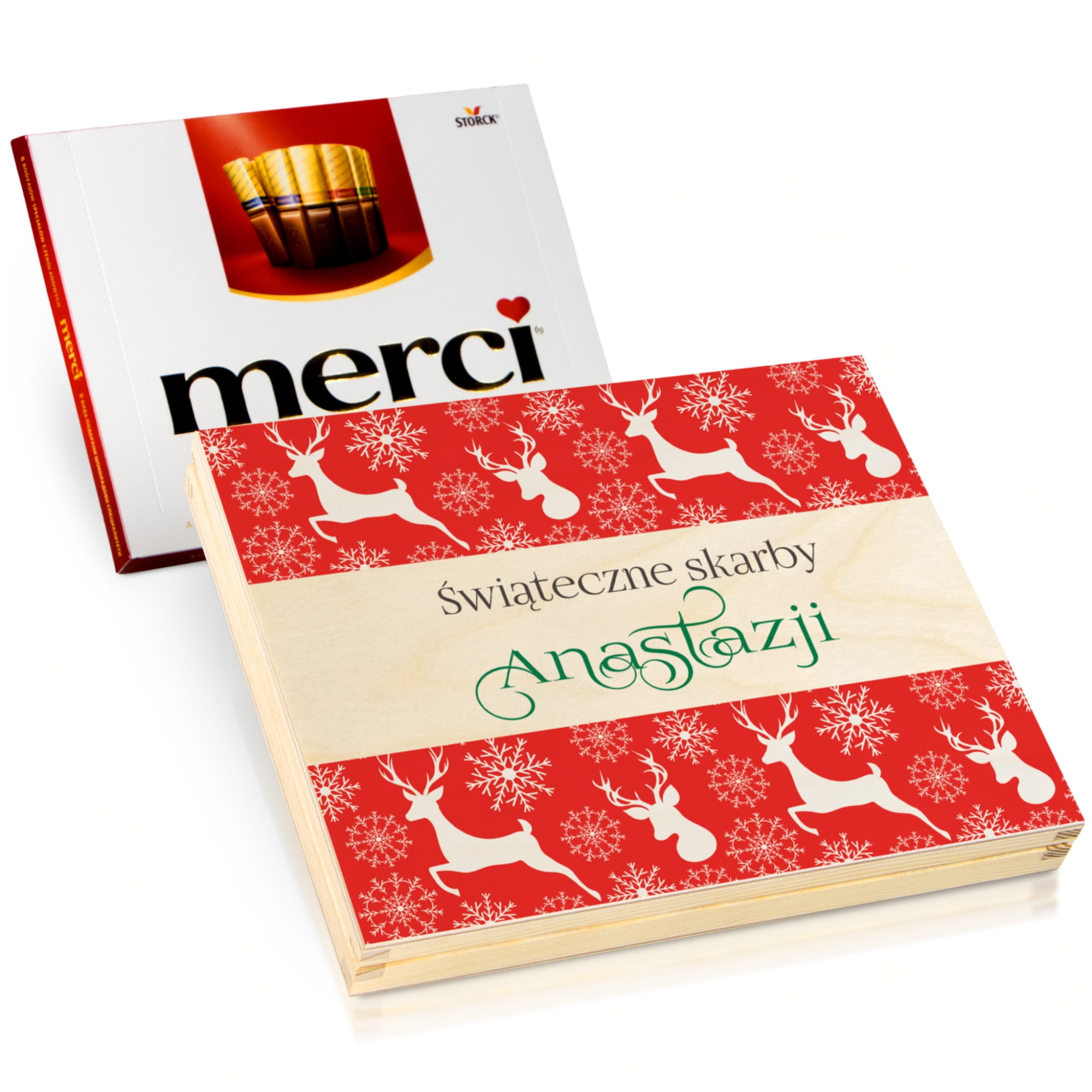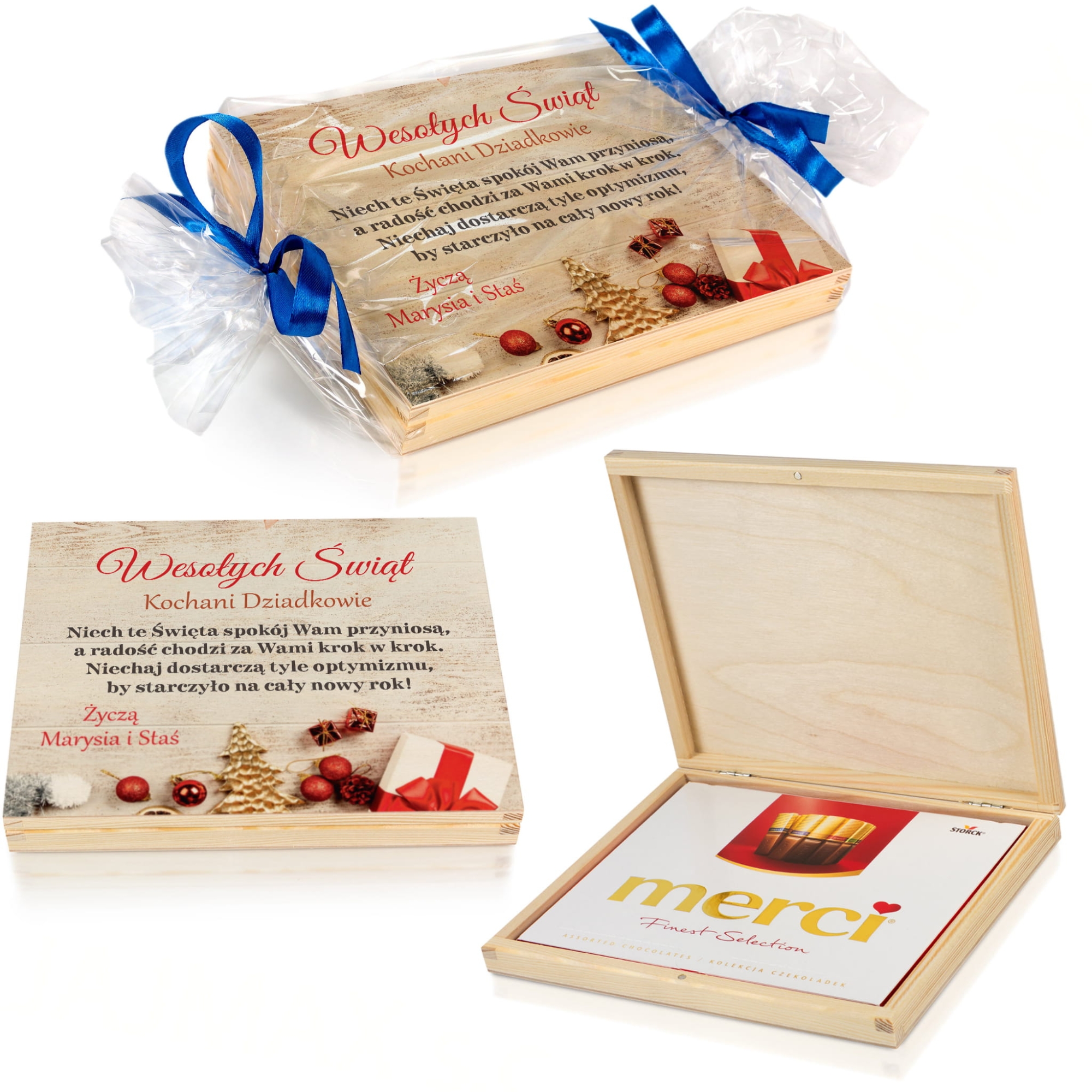 Kupujesz drewniane pudełeczko z nadrukiem. Czekoladki Merci są tylko częścią ekspozycji i nie należą do zestawu.
