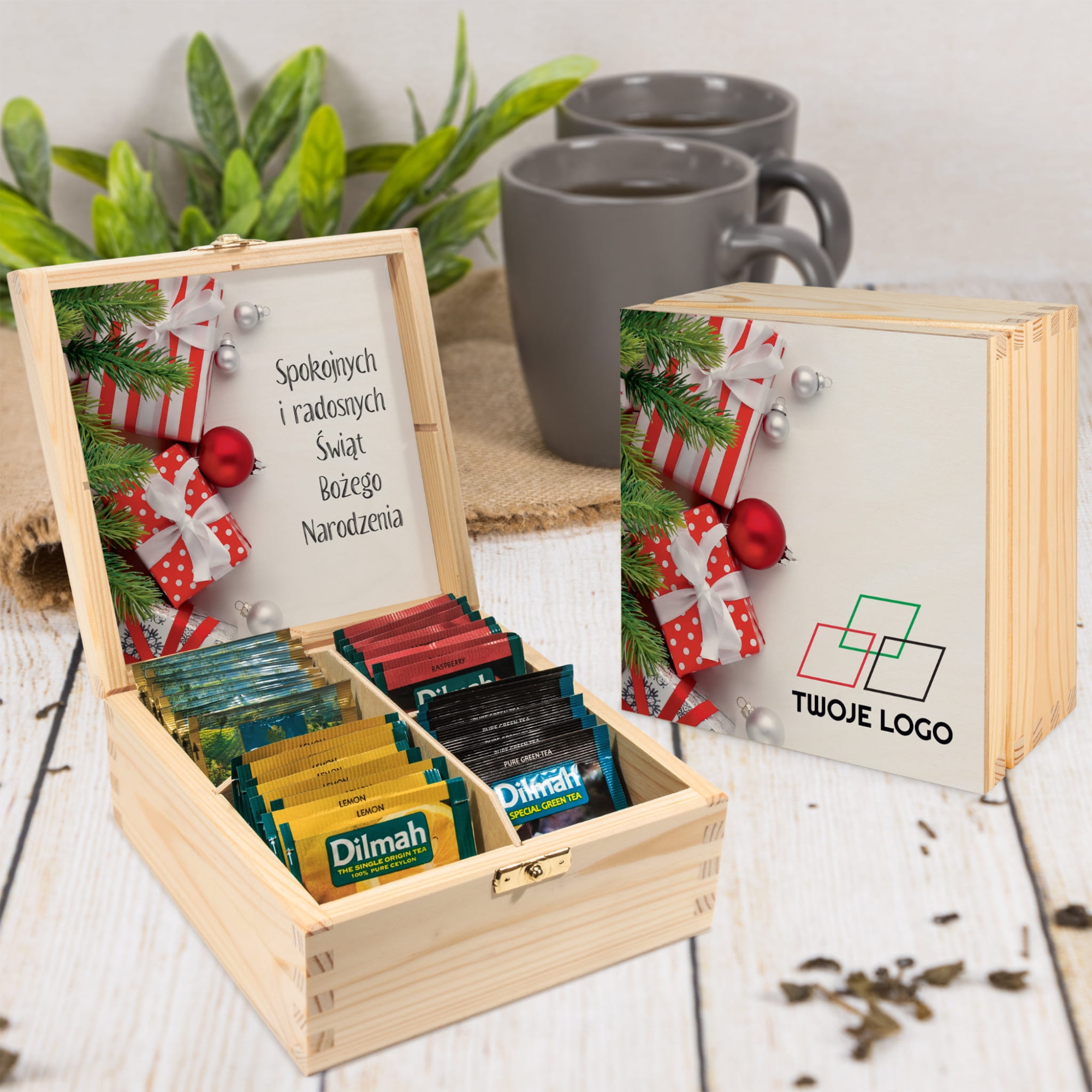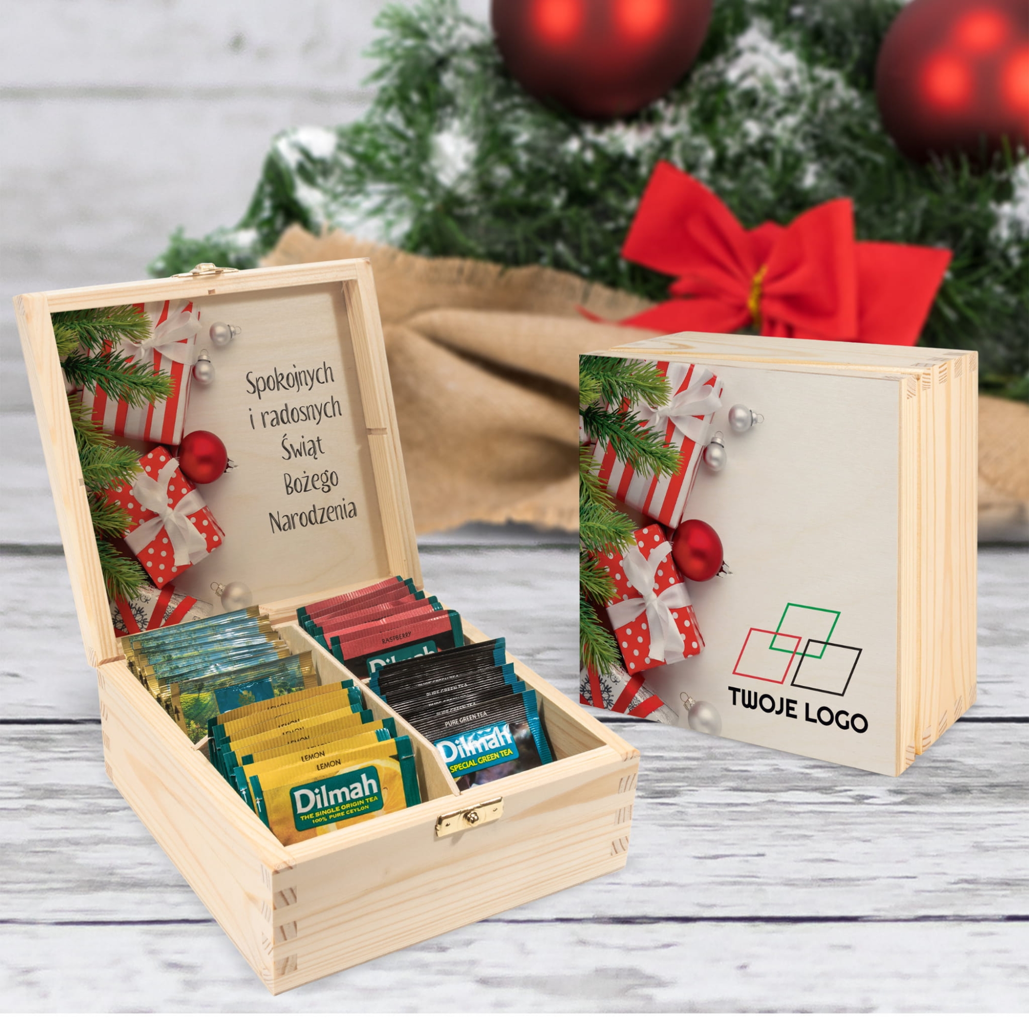 - drewniane pudełko na herbatę z logo firmy i życzeniami,