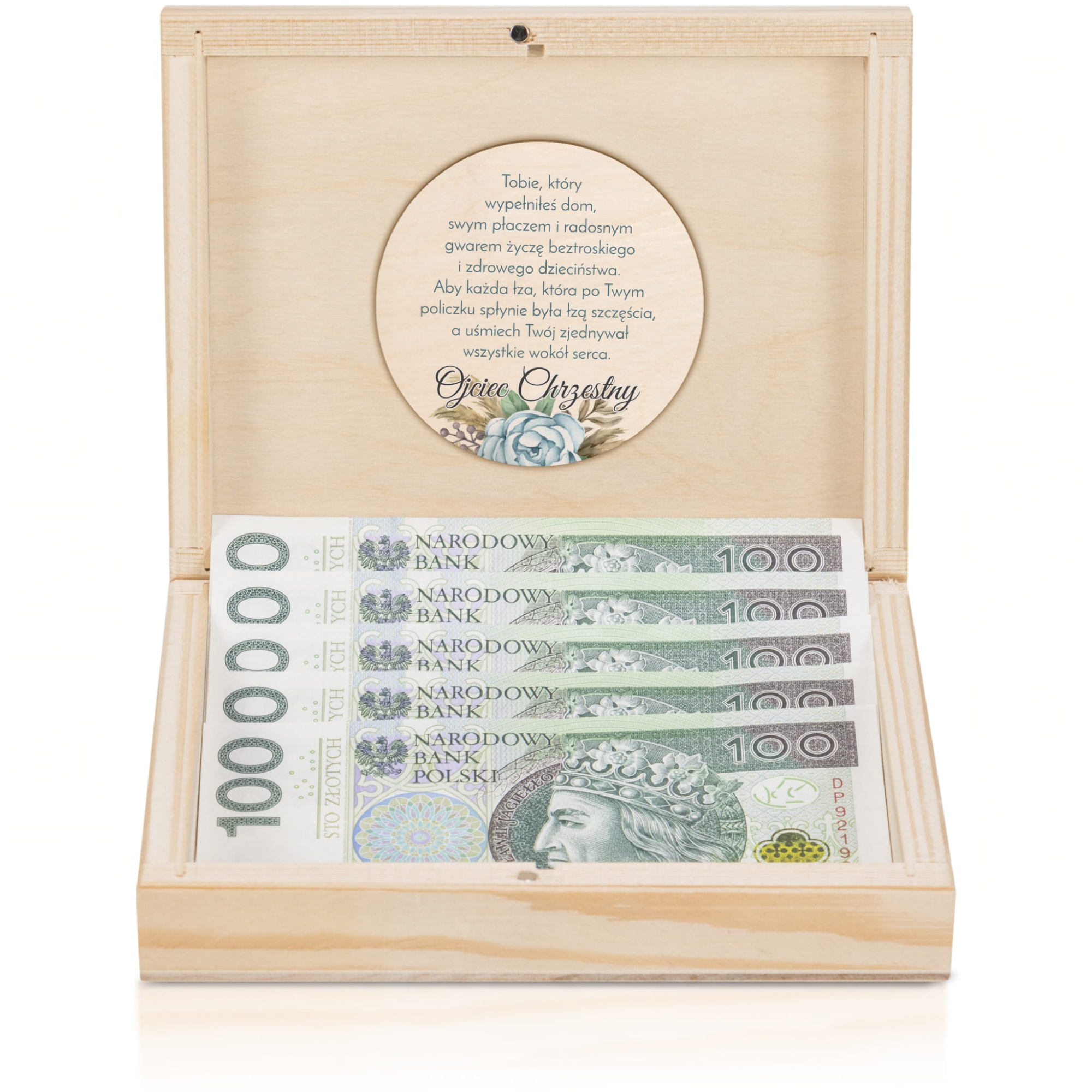 Niebawem będziesz gościem na Chrzcinach i chciałbyś w wyjątkowy sposób podarować gotówkę jako prezent na chrzest dla dziecka? Jeśli tak to doskonale trafiłeś. Drewniane pudełko na pieniądze z naszej oferty jest niezwykle poręczne i idealnie mieści 5 strzykawek, które są częścią zestawu. Plusem naszego pudełka jest dyskretne zamykanie na magnes, które zabezpiecza je przed przypadkowym otwarciem. Wewnątrz pudełka znajduje się koło z nadrukiem, dzięki temu również po otwarciu prezentuje się znakomicie. Pudełko na pieniądze 'zastrzyk gotówki' to produkt, który zastępuje tradycyjną kopertę i kartkę z życzeniami. Możesz w oryginalny sposób podarować pieniądze jako prezent na chrzest. Na szczególną okazję Chrztu Świętego do naszych projektów wykorzystaliśmy zarówno motywy dziecięce jak i symbole religijne. Z łatwością znajdziesz wzór na prezent na chrzest dla dziewczynki i prezent na chrzest dla chłopca. Indywidualne życzenia z dedykacją sprawiają, że takie pamiątki chrztu są jeszcze bardziej unikatowe.