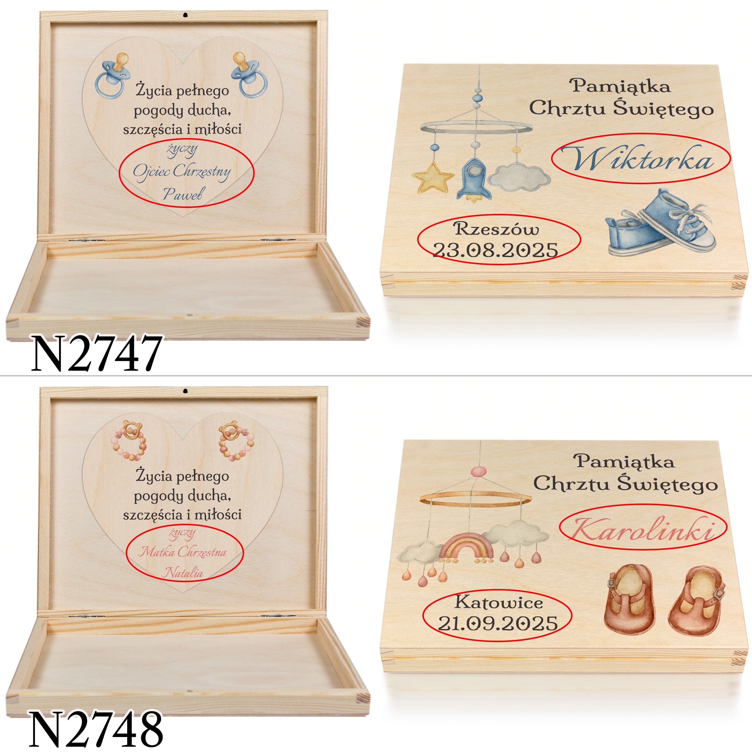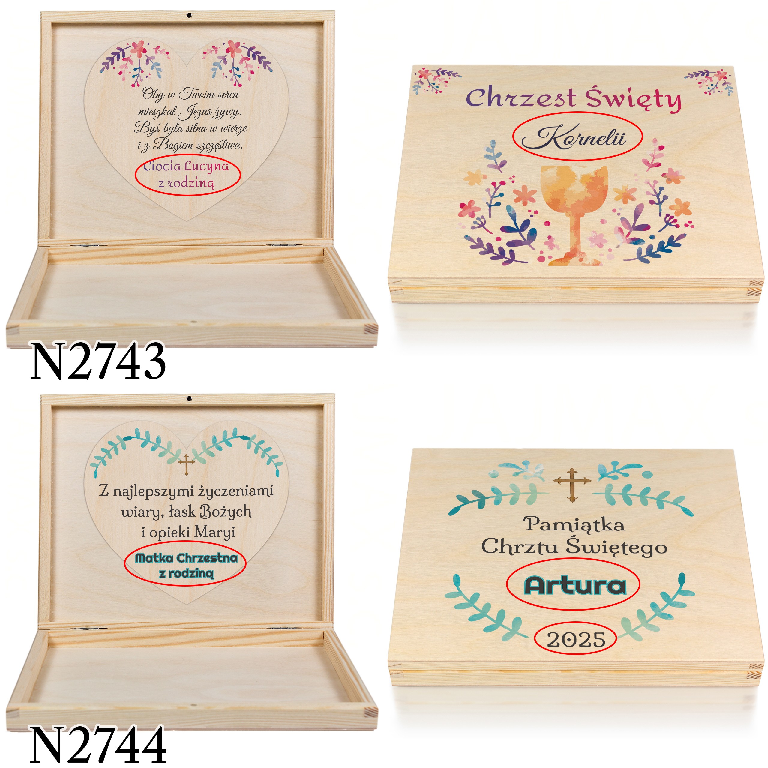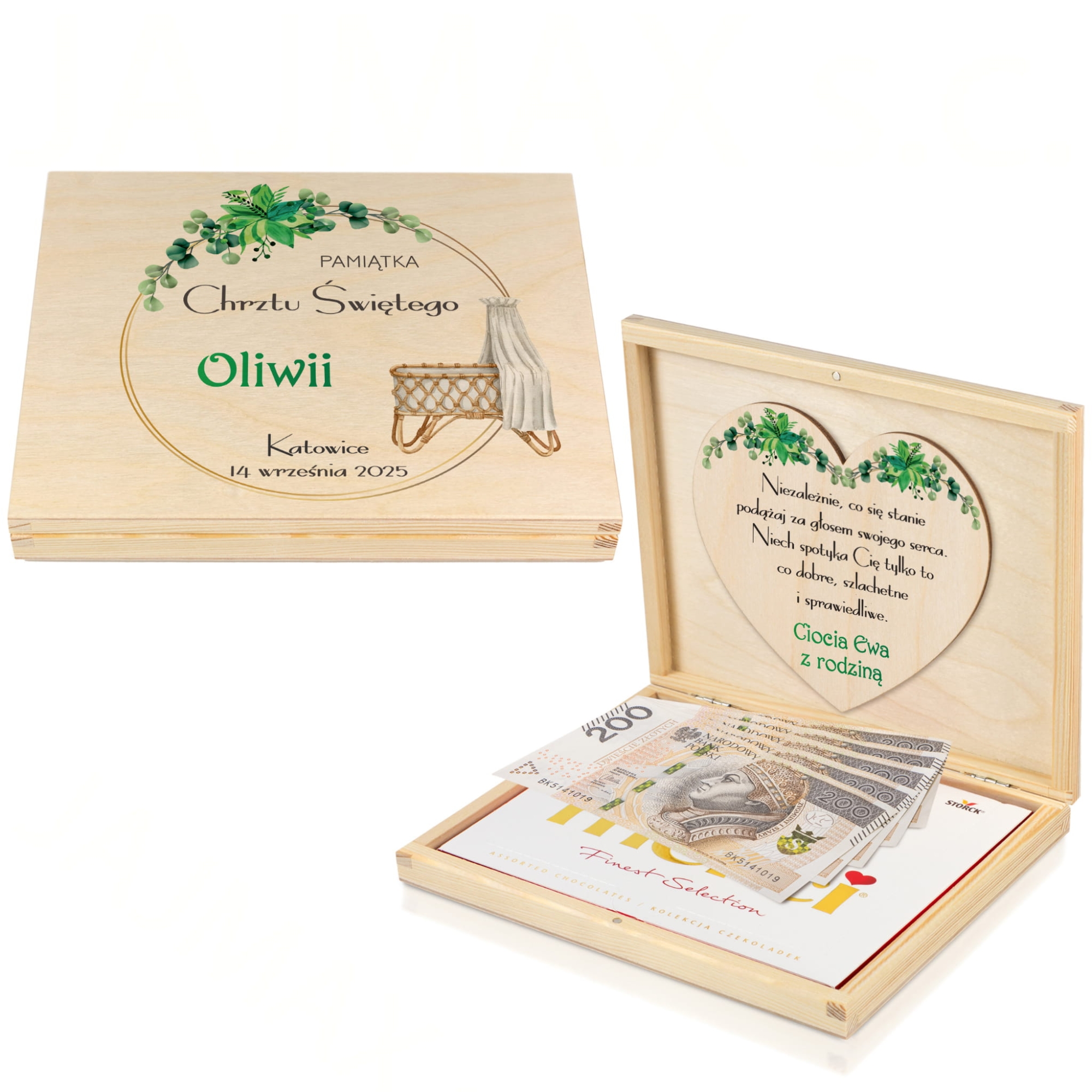 Wkrótce wybierasz się na Chrzest Święty i zastanawiasz się jaki prezent na chrzest dla dziecka wybrać? Mamy dla Ciebie doskonałą propozycję. Pudełko drewniane na czekoladki z Merci w zestawie z kolorowym nadrukiem. Wewnątrz pudełka umieściliśmy duże serce z życzeniami po to, aby pudełko również po otwarciu prezentowało się wyjątkowo. W pudełku możesz podarować jako prezent na chrzest dla dziewczynki lub prezent na chrzest dla chłopca np. łańcuszek. Do naszego spersonalizowanego pudełka możesz dołączyć pieniądze, które przecież bardzo często stanowią prezent na chrzest. Dzięki temu zastąpisz tradycyjną kopertę na nowoczesne pudełko na pieniądze z życzeniami. Pudełko jest zamykane na mały, dyskretny magnes wewnętrzny, który zabezpiecza je przed niespodziewanym otwarciem. Indywidualny nadruk według Twojego zamówienia sprawia, że takie pamiątki na chrzest dla dziecka wyróżniają się na tle innych. Piękne dziecięce motywy graficzne, które wykorzystaliśmy w naszych projektach z pewnością przypadną Ci do gustu. Z łatwością wybierzesz wzór idealny na prezent na chrzest dla dziewczynki i prezent na chrzest dla chłopca.