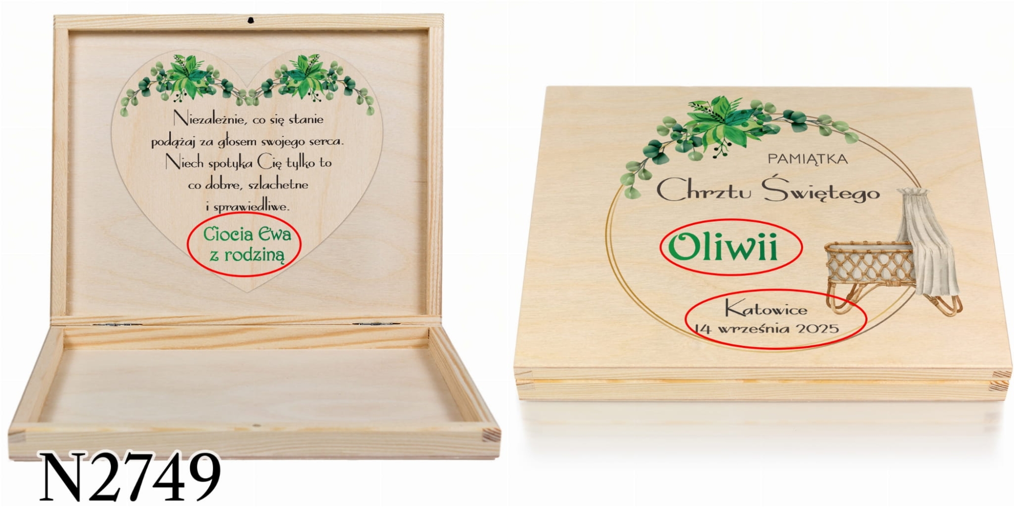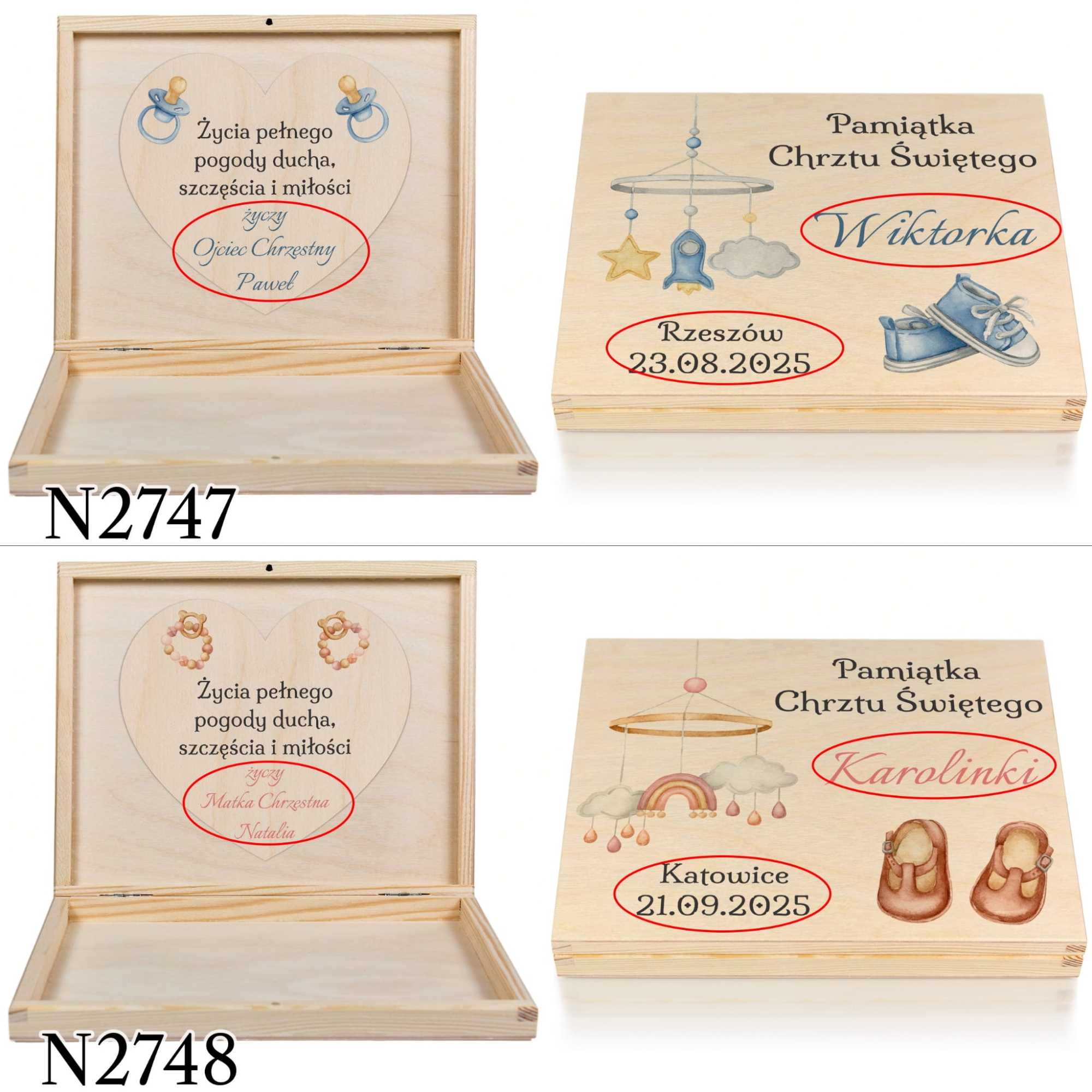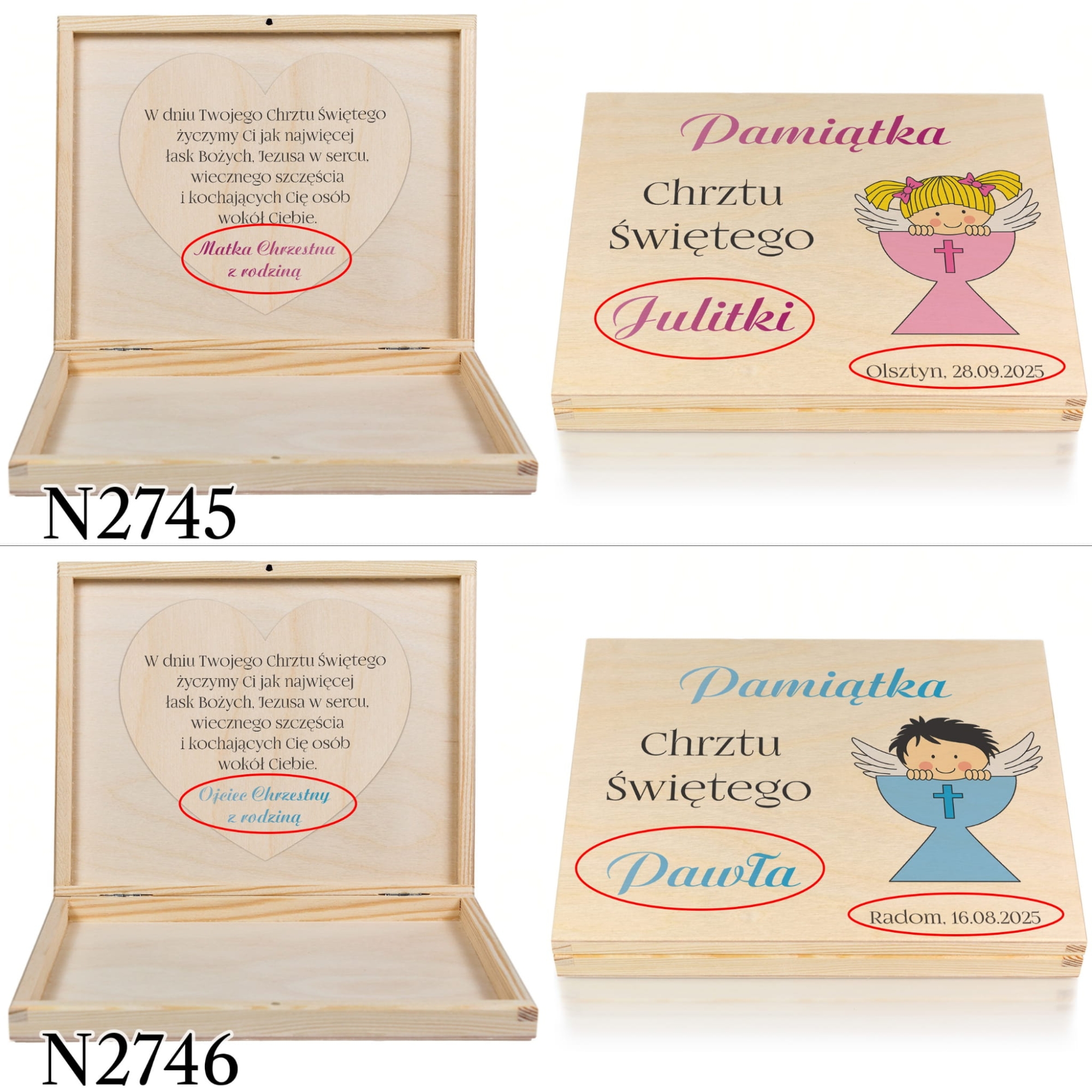 Wkrótce wybierasz się na Chrzest Święty i zastanawiasz się jaki prezent na chrzest dla dziecka wybrać? Mamy dla Ciebie doskonałą propozycję. Pudełko drewniane na czekoladki z Merci w zestawie z kolorowym nadrukiem. Wewnątrz pudełka umieściliśmy duże serce z życzeniami po to, aby pudełko również po otwarciu prezentowało się wyjątkowo. W pudełku możesz podarować jako prezent na chrzest dla dziewczynki lub prezent na chrzest dla chłopca np. łańcuszek. Do naszego spersonalizowanego pudełka możesz dołączyć pieniądze, które przecież bardzo często stanowią prezent na chrzest. Dzięki temu zastąpisz tradycyjną kopertę na nowoczesne pudełko na pieniądze z życzeniami. Pudełko jest zamykane na mały, dyskretny magnes wewnętrzny, który zabezpiecza je przed niespodziewanym otwarciem. Indywidualny nadruk według Twojego zamówienia sprawia, że takie pamiątki na chrzest dla dziecka wyróżniają się na tle innych. Piękne dziecięce motywy graficzne, które wykorzystaliśmy w naszych projektach z pewnością przypadną Ci do gustu. Z łatwością wybierzesz wzór idealny na prezent na chrzest dla dziewczynki i prezent na chrzest dla chłopca.