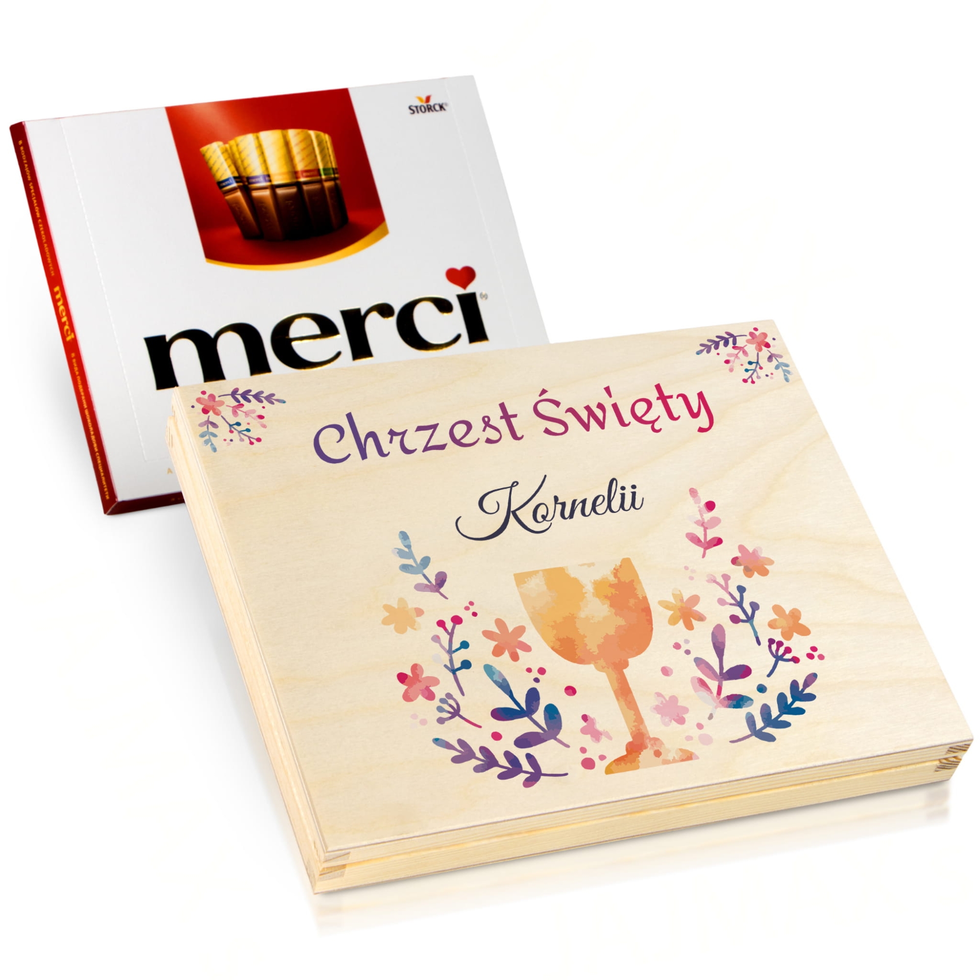 Pudełko z bombonierką Merci prezent na Chrzest z dedykacją