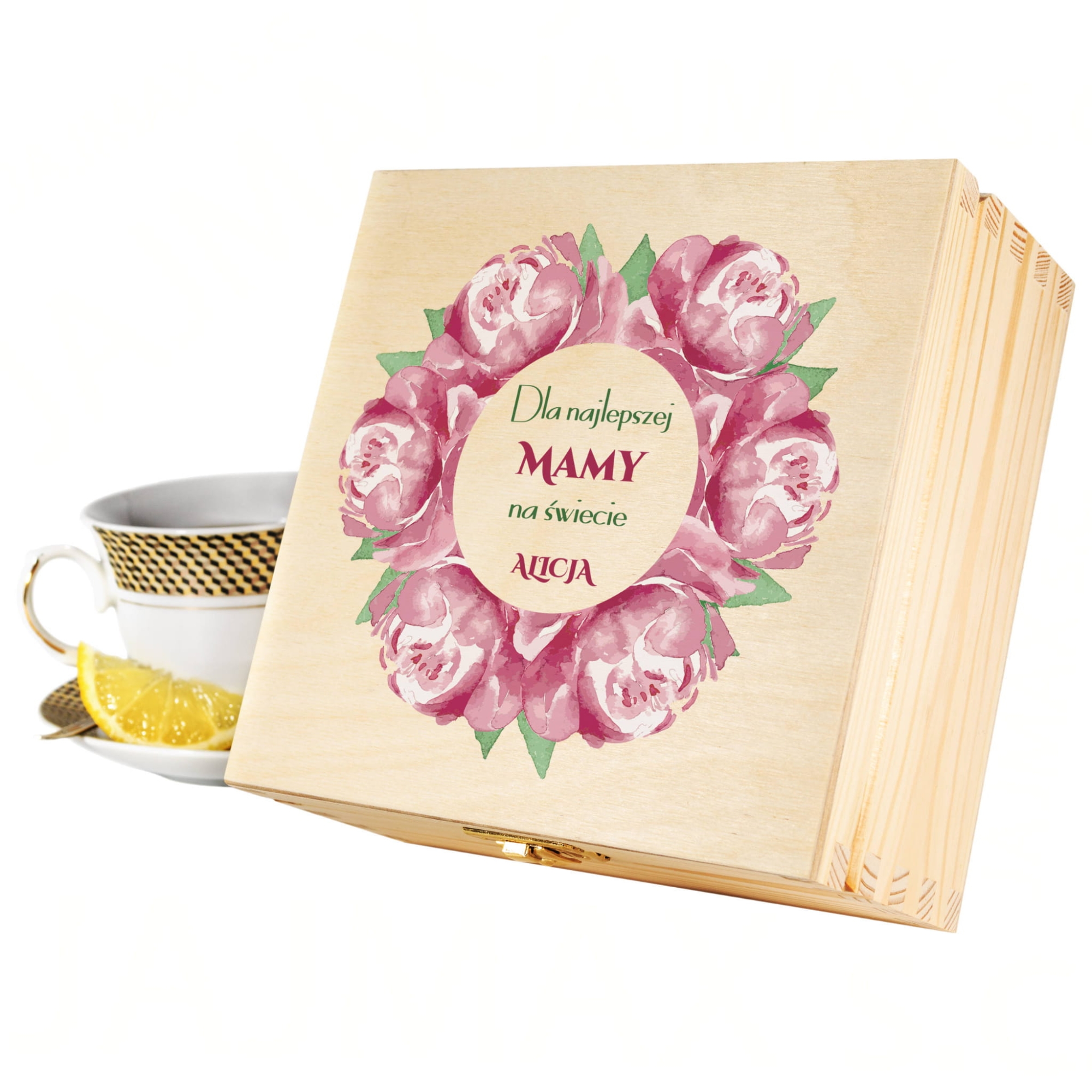 - W zestawie: drewniane pudełko, herbata Dilmah 32 koperty w 4 różnych smakach.