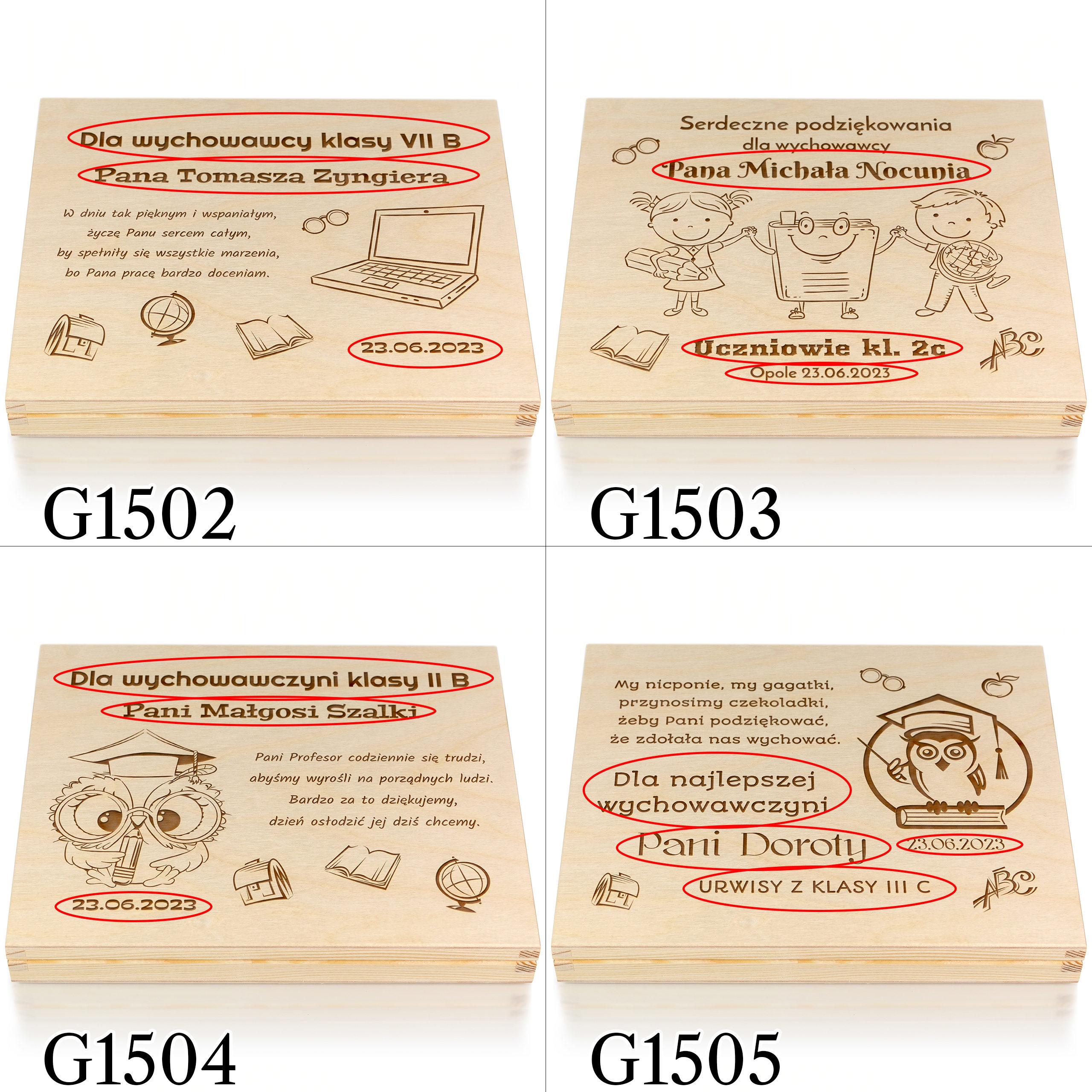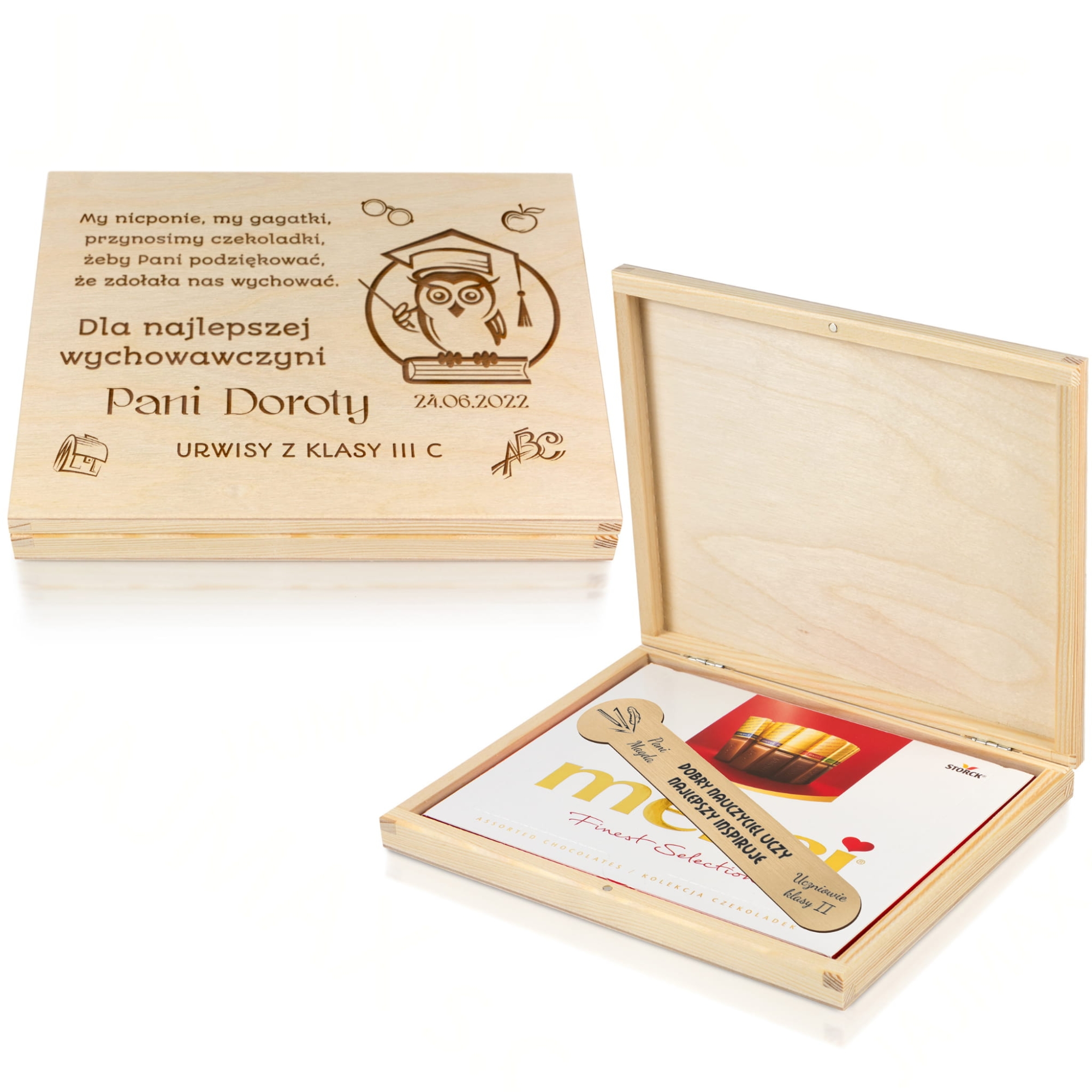 Jeśli jako uczeń lub rodzic szukasz wyjątkowego prezentu dla nauczyciela na zakończenie roku szkolnego lub na Dzień Nauczyciela doskonale trafiłeś. Przedstawiamy piękny zestaw prezentowy dla nauczyciela z grawerem. Jest to drewniane pudełko z bombonierką Merci oraz złota zakładka do książki. Na wieczku pudełka oraz zakładce wykonany Twój indywidualny grawer. Do wybory kilka motywów zarówno pudełka jak i zakładki do książki, odpowiednie dla dzieci na różnym etapie edukacji. Taka kompozycja to unikatowa pamiątka dla wychowawcy, pamiątka dla nauczyciela, która pozostawi wspomnienie po uczniach przez wiele lat. Nasze drewniane pudełko posiada mały, wewnętrzny magnes co zapobiega przypadkowemu otwarciu. Pamiętaj, że zawsze warto zamiast kwiatów czy czekoladek podarować nauczycielowi bardziej wyjątkowy upominek po to, aby podziękować za trud włożony w edukację i wychowanie uczniów.