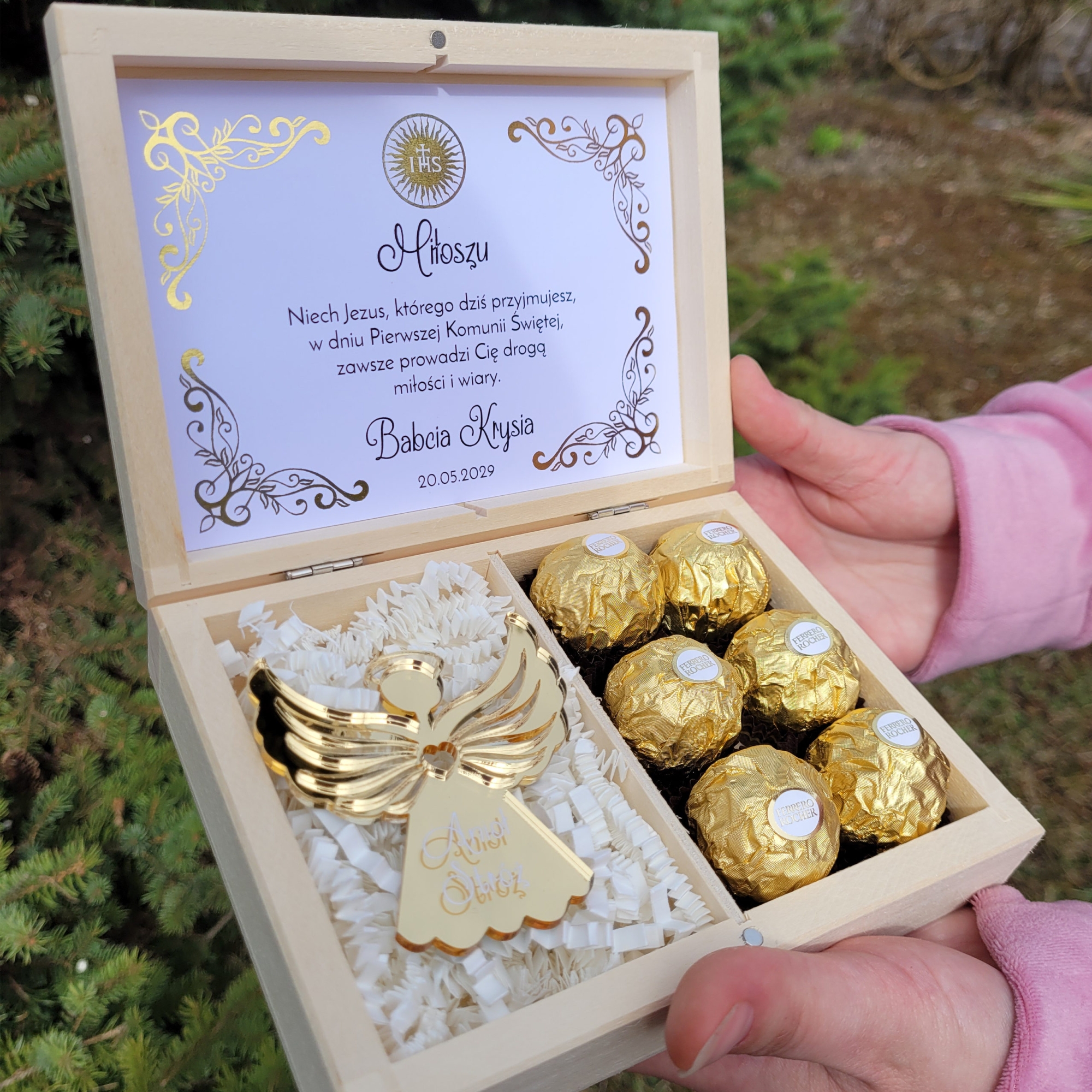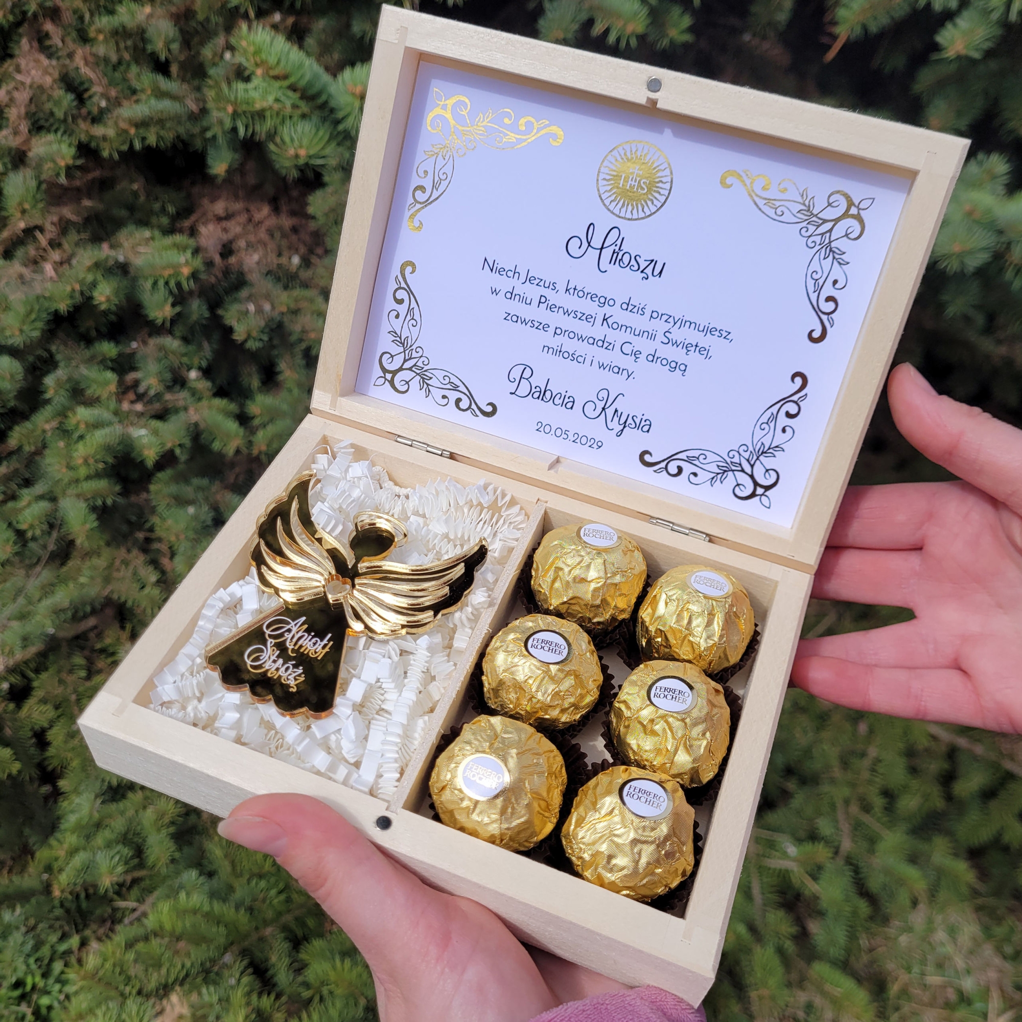 | Zawartość zestawu: | drewniane pudełko, figurka aniołka, ozdobne wypełnienie, praliny Ferrero Rocher |