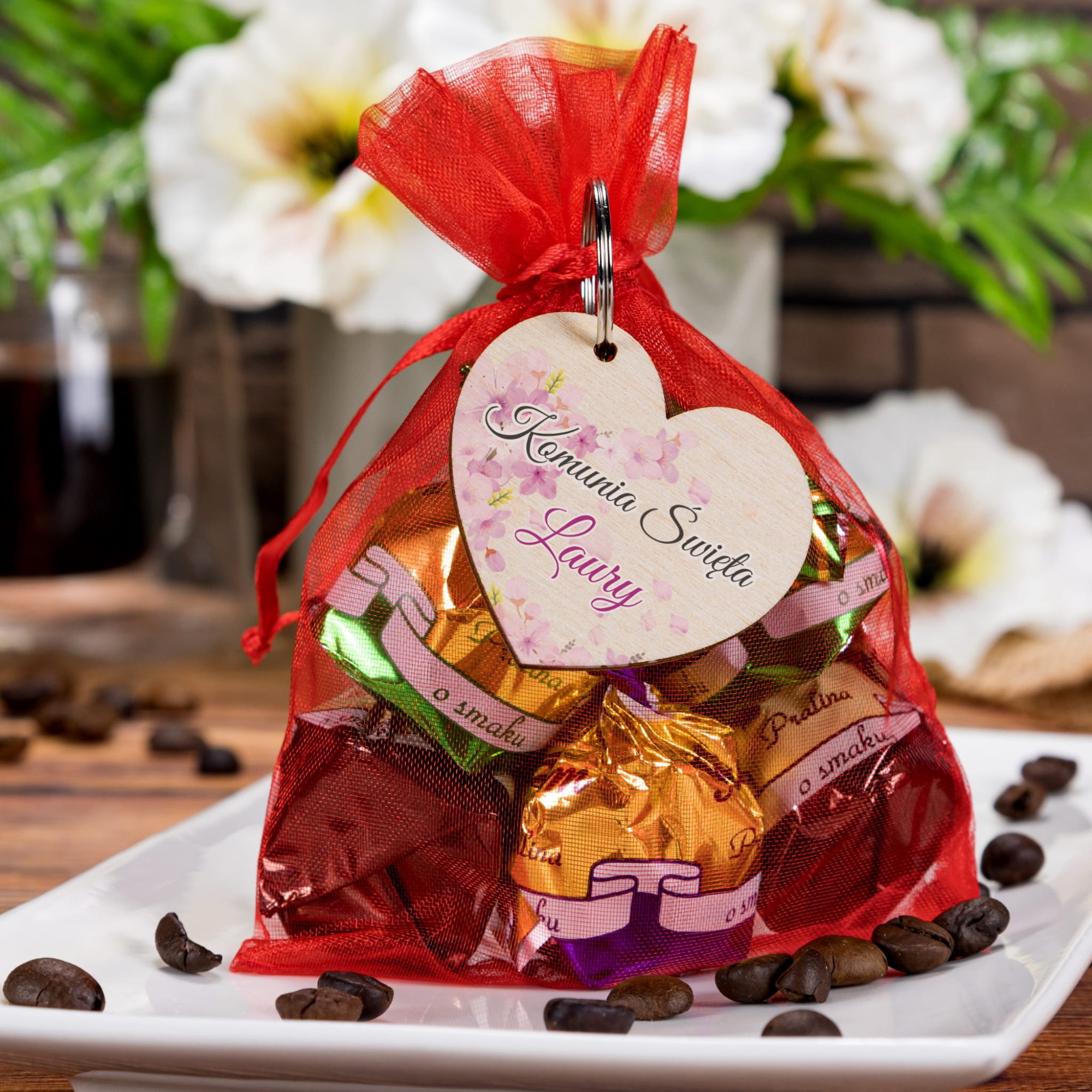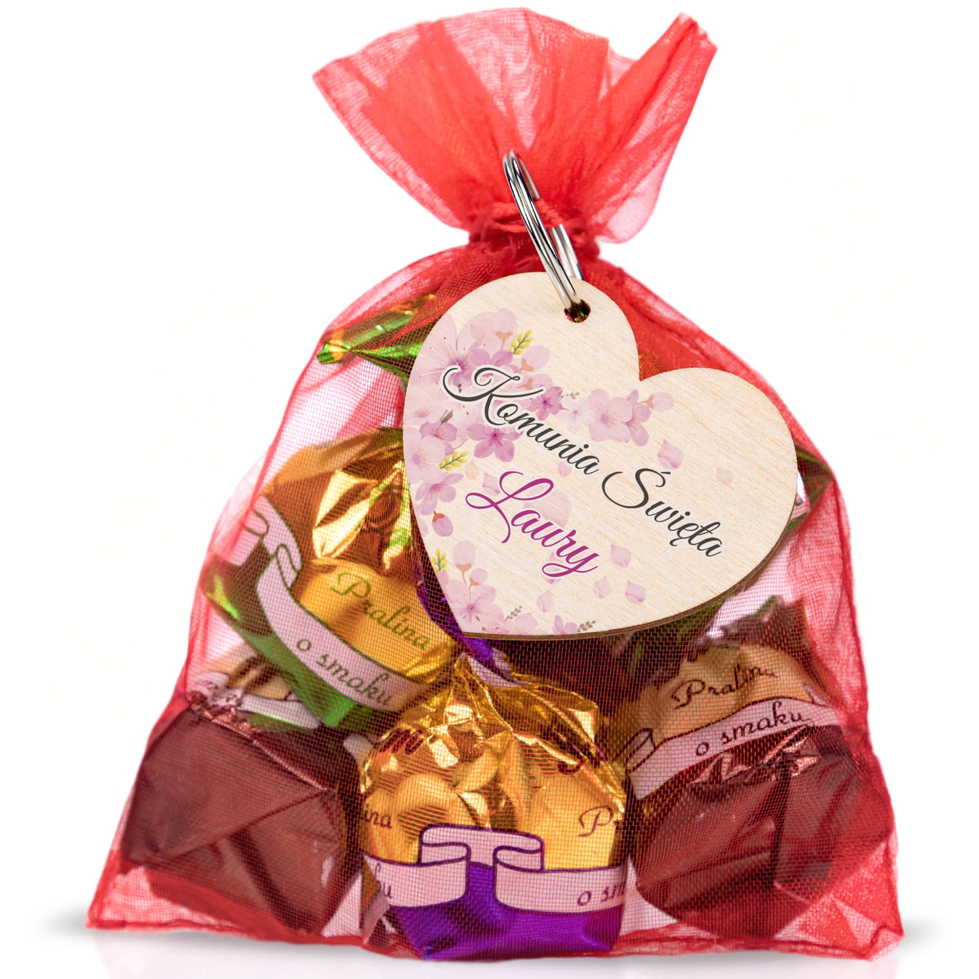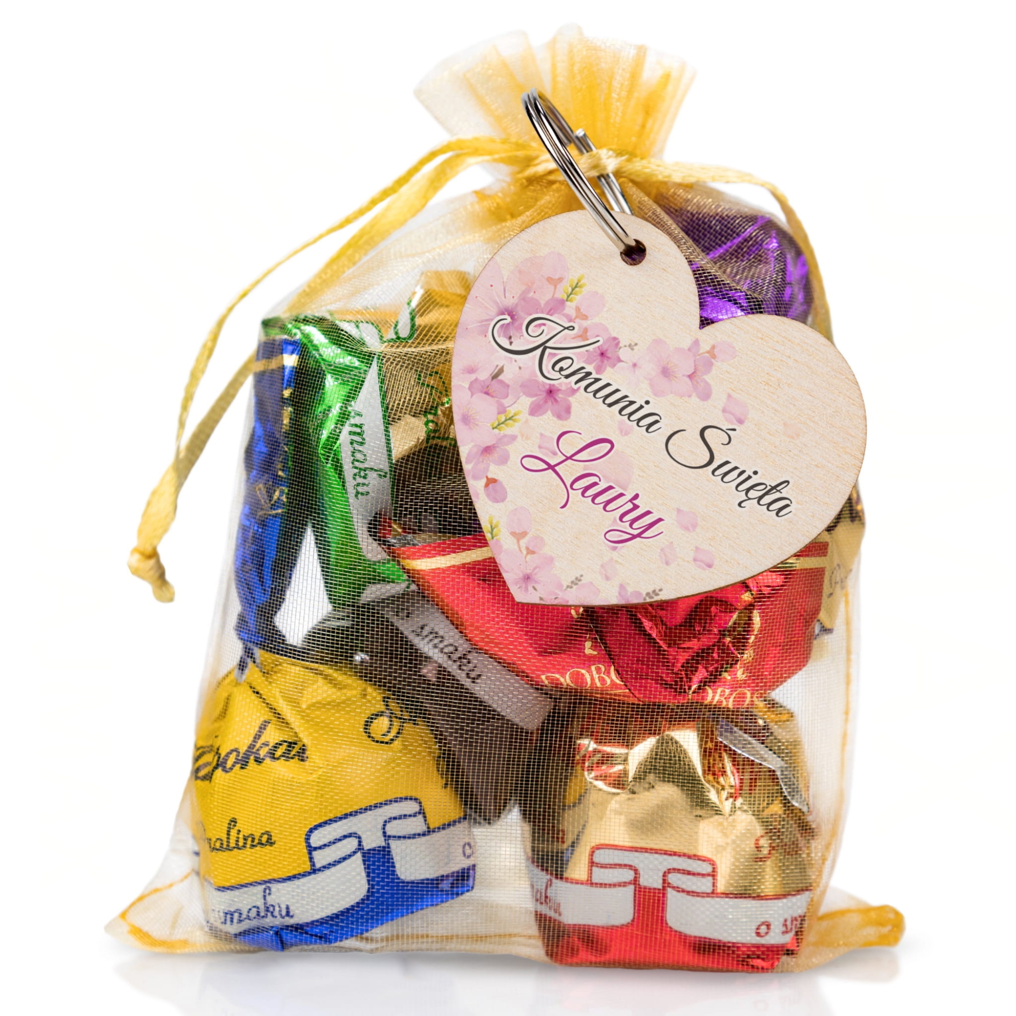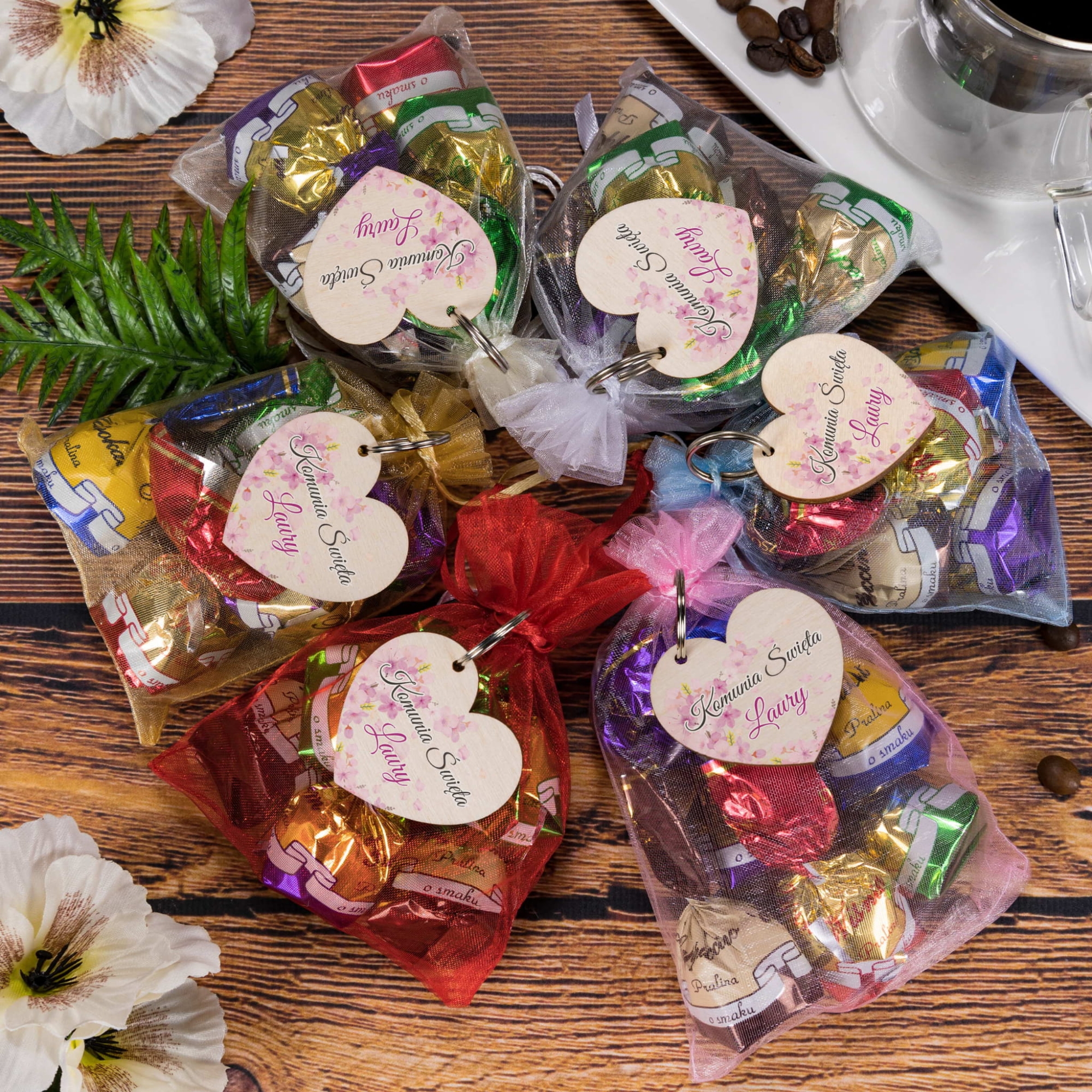 Podziękowania komunia zestaw cukierki plus breloczek serce dla gości