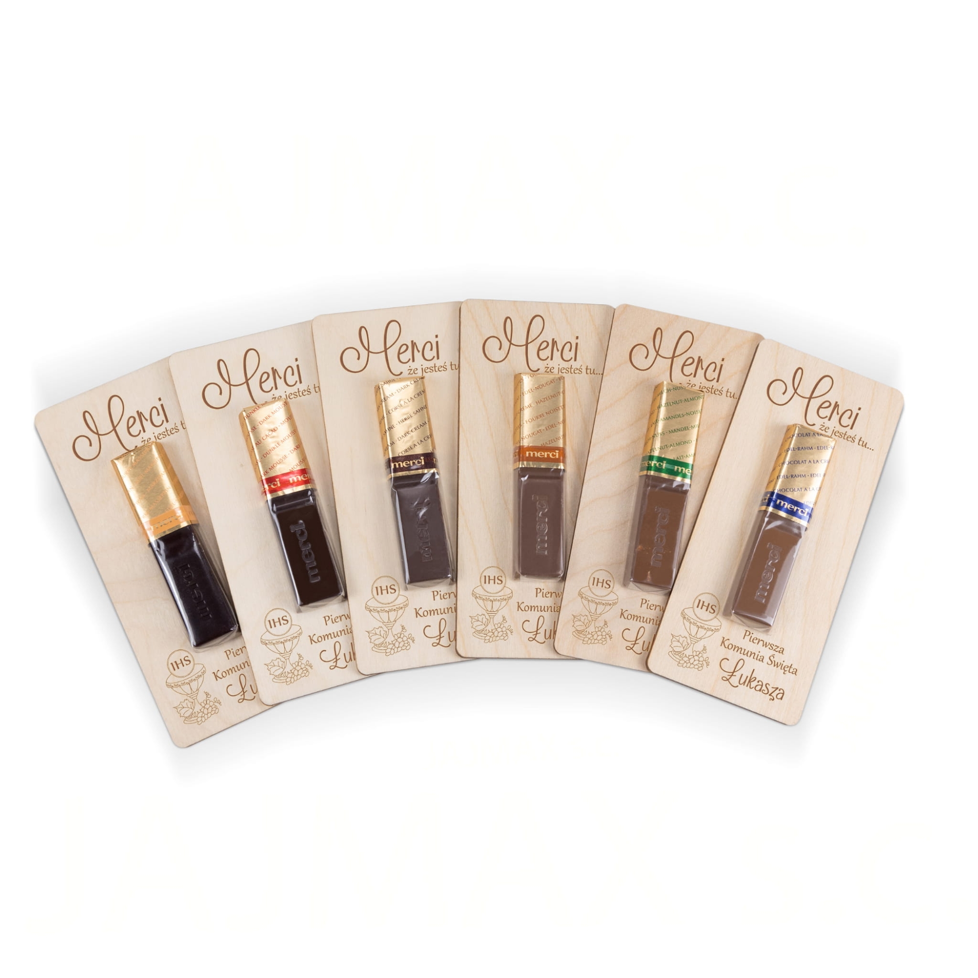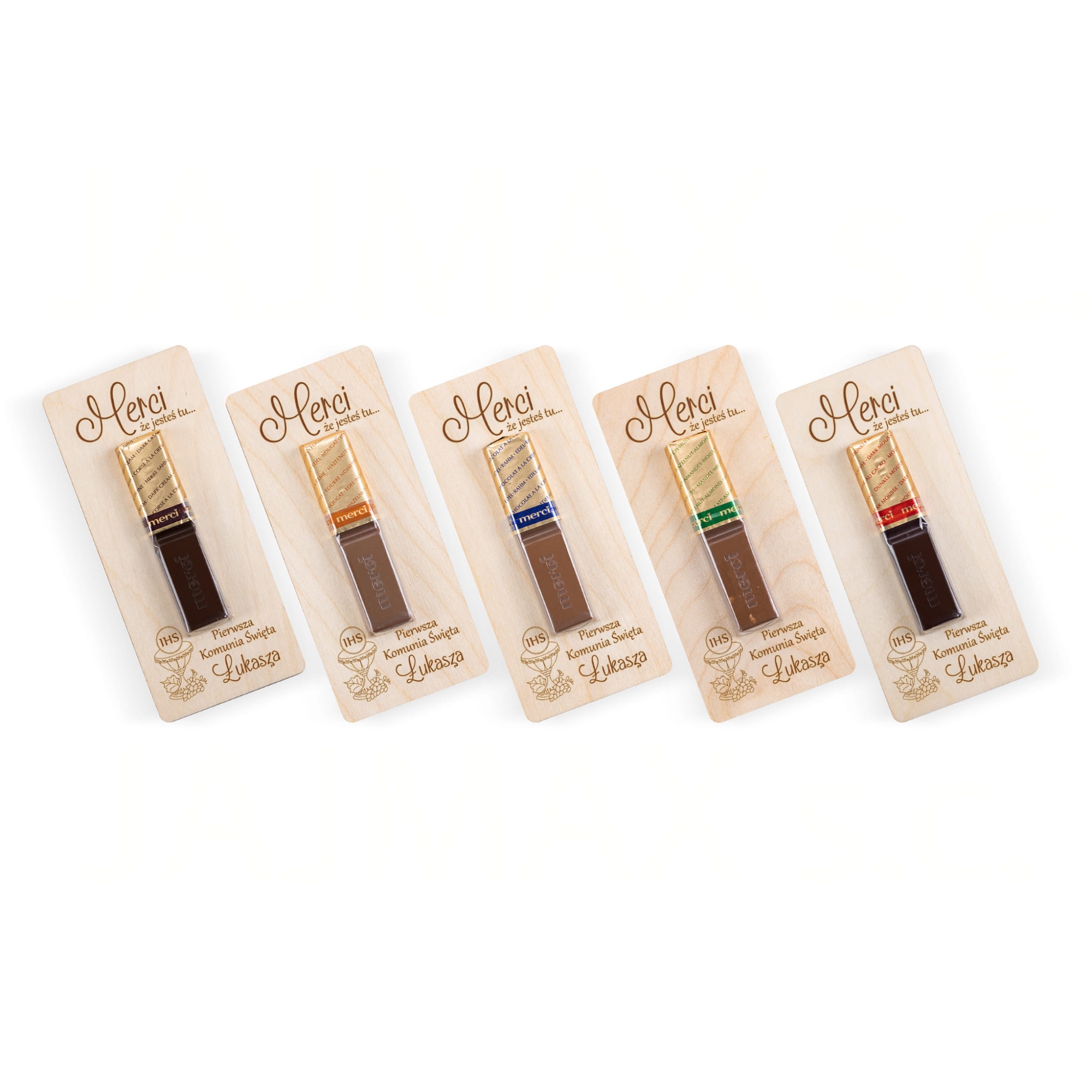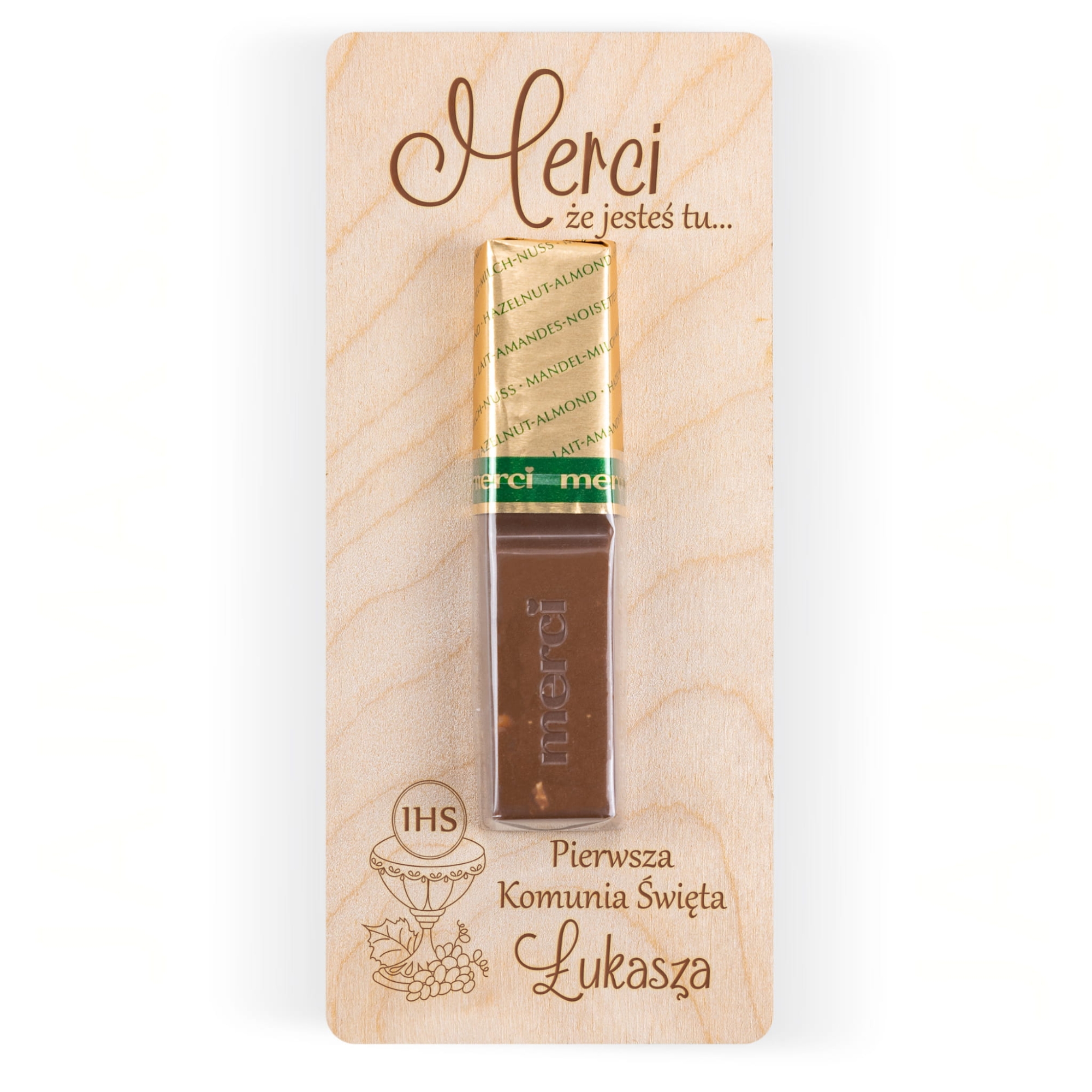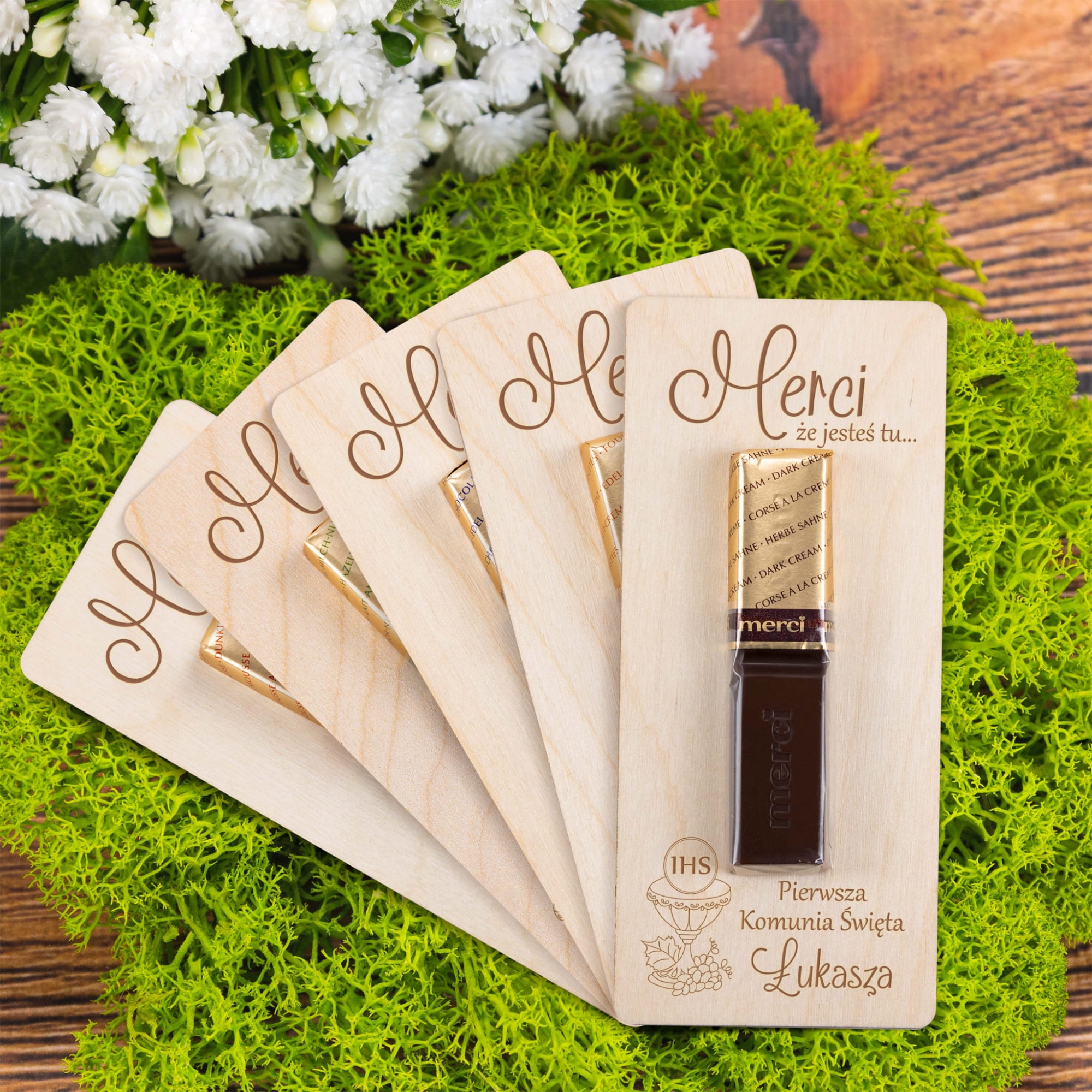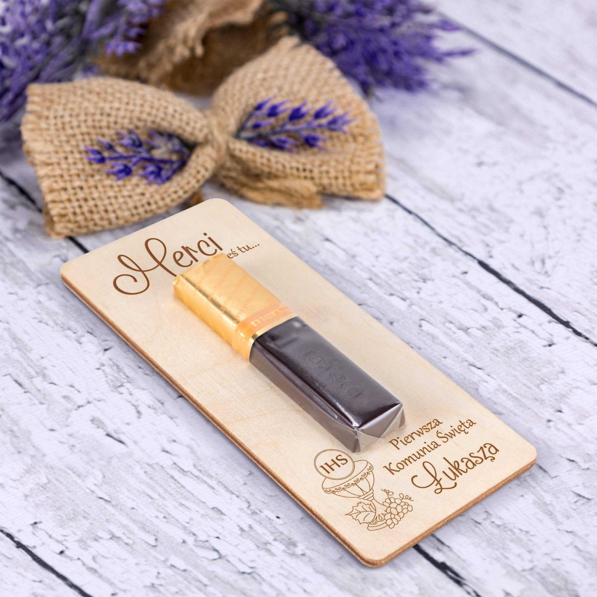 Podziękowania na komunię drewniana kartka z czekoladką Merci