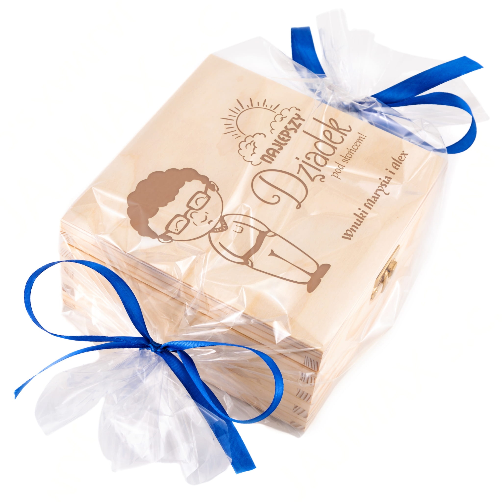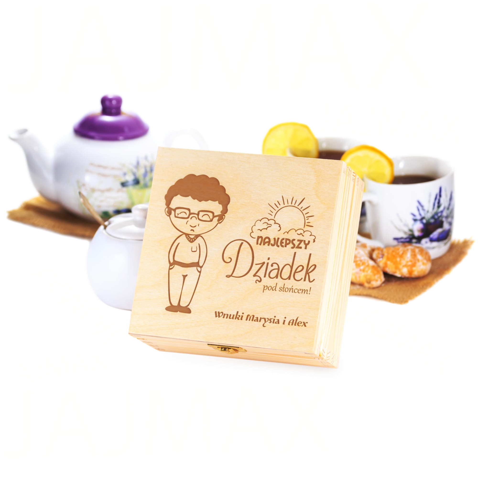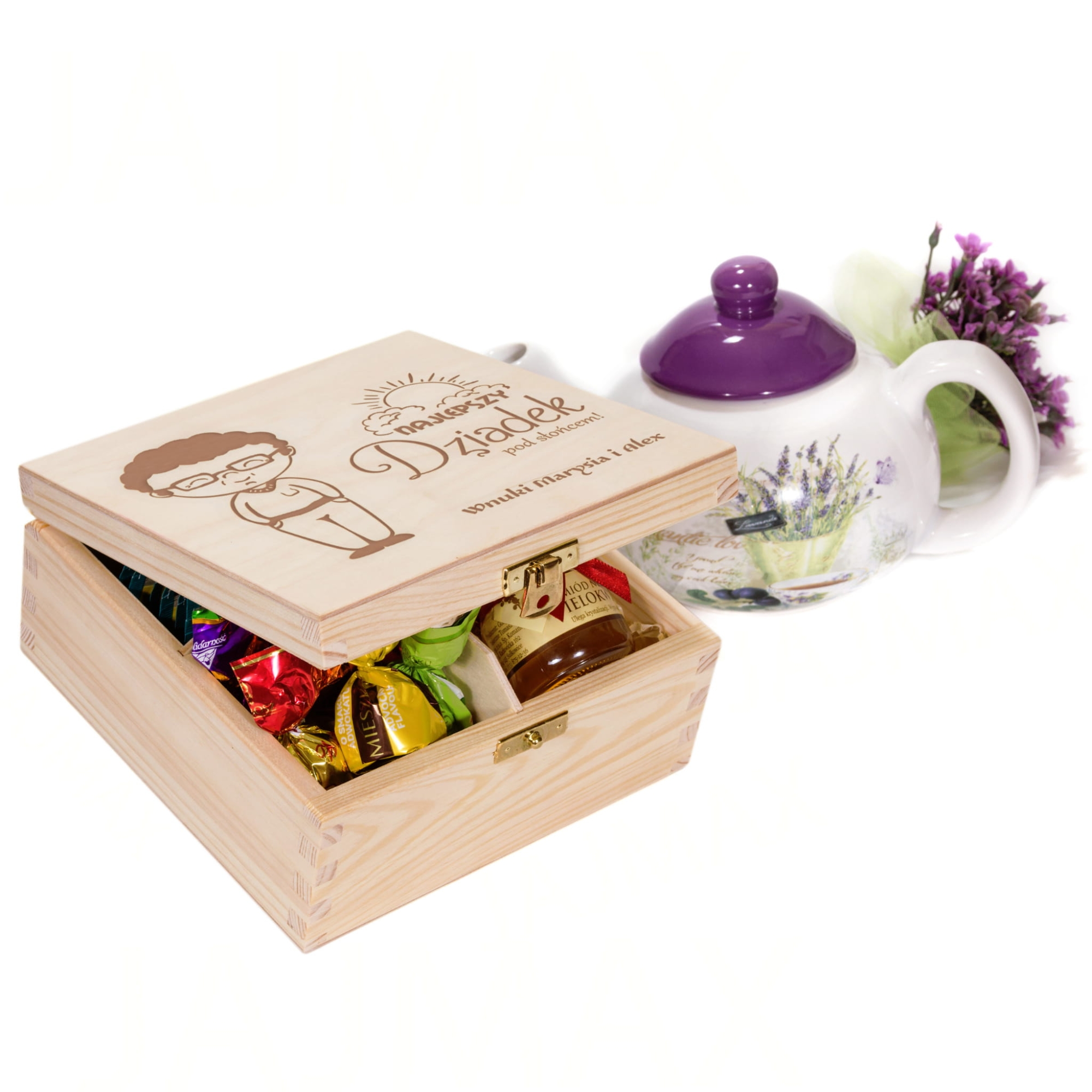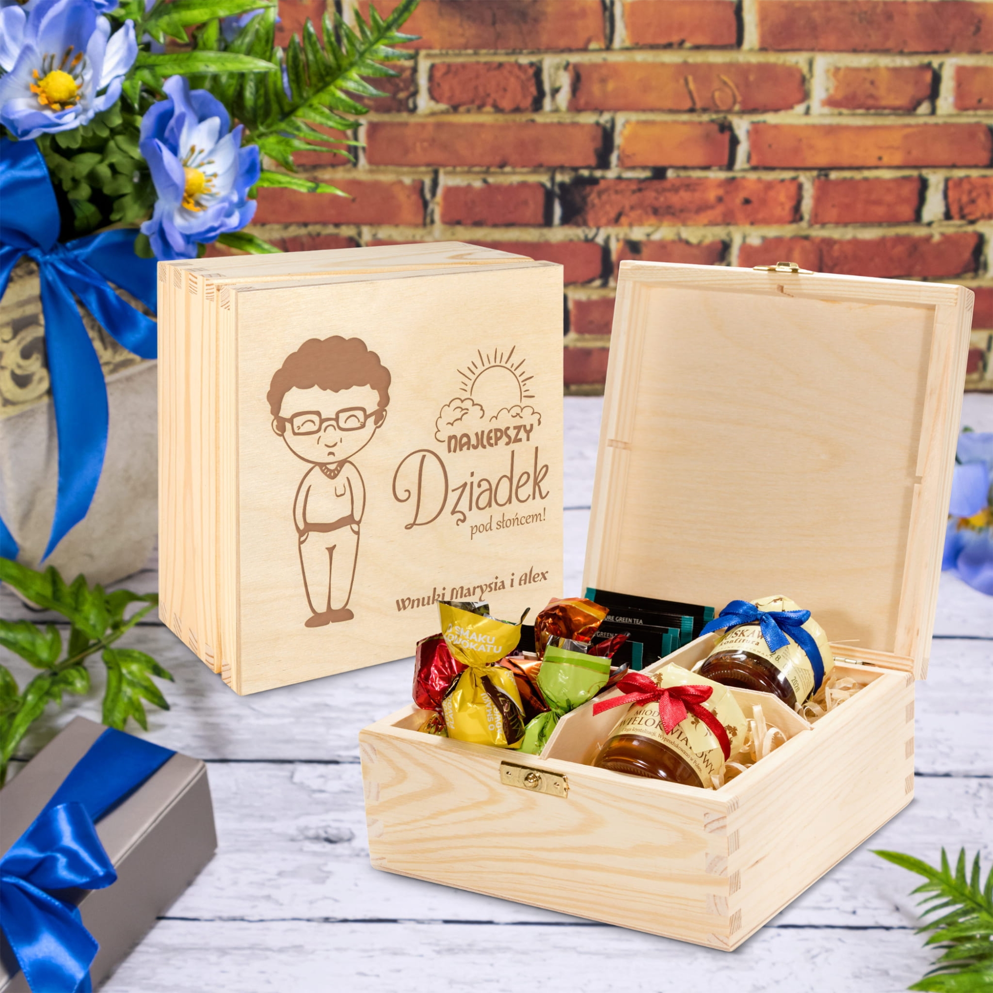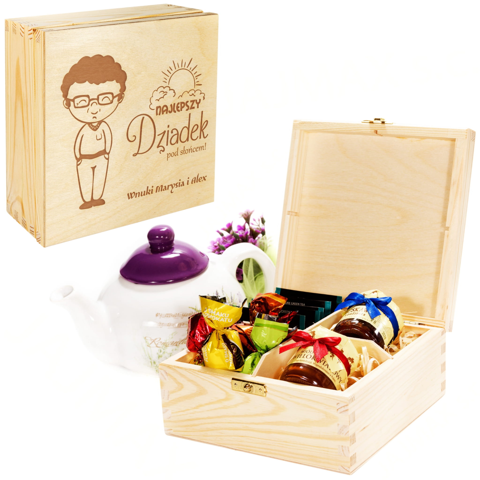 Prezentowy box upominkowy z okazji Dnia Dziadka prezent od wnuków HERBACIARKA ZESTAW PODARUNKOWY super pomysł na prezent dla dziadków DREWNIANY BOX UPOMINKOWY miód praliny dżem herbaty na Dzień Dziadka ZESTAW PREZENTOWY DLA DZIADKA 22 STYCZNIA DZIEŃ DZIADKA słodki box DREWNIANY BOX NA PREZENT DLA DZIADKÓW zestaw herbaty miód konfitura SŁODKOŚCI BABCI pudełko z imieniem POMYSŁ NA PREZENT NA DZIEŃ BABCI Pudełko prezentowe Słodki Upominek na Dzień Babci i Dziadka Pudełko smakołyków pomysłowy prezent na Dzień Babci z grawerem ZESTAW UPOMINKOWY Najlepsza Babcia pod słońcem pudełko smakołyków UPOMINEK DLA DZIADKÓW zestaw słodkości czekoladki miód herbaty DLA DZIADKÓW pudełko smakołyków z imionami wnuków prezent premium Herbaciarka Zestaw Podarunkowy Dla Babci Dla Dziadka nadruk