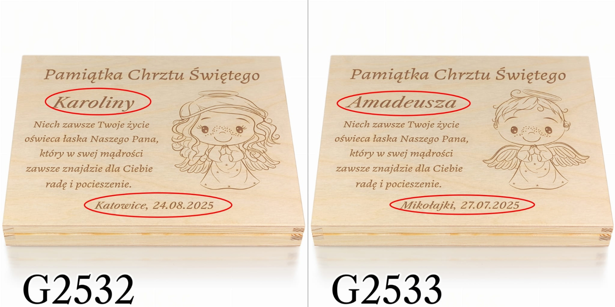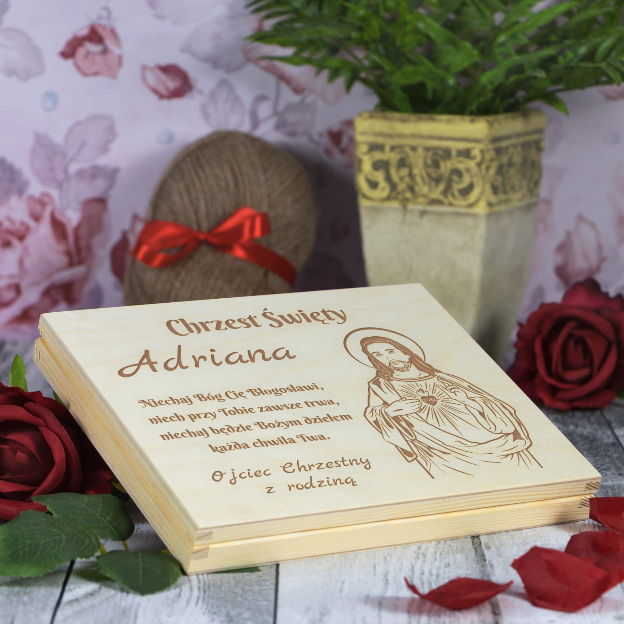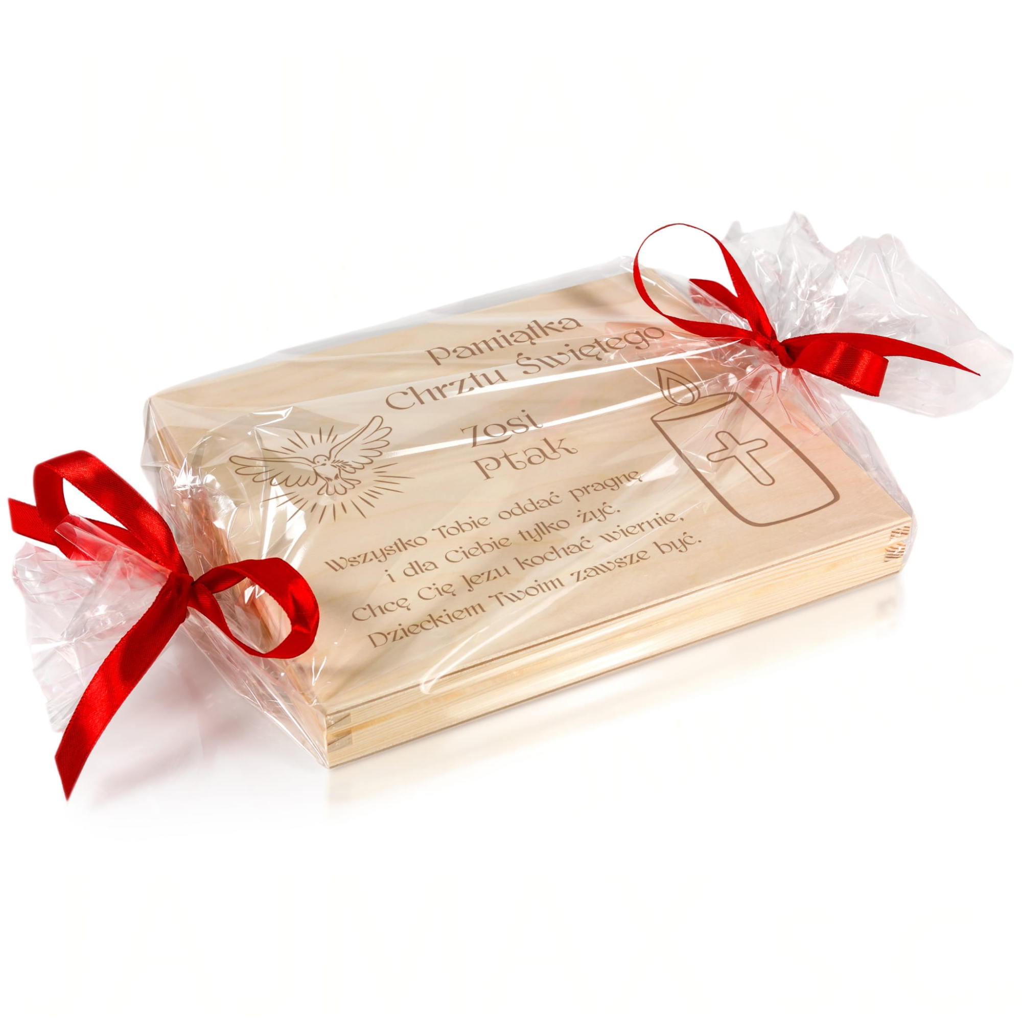 Jeżeli niebawem wybierasz się na Chrzest Święty i zastanawiasz się jaki prezent na chrzest dla dziecka wybrać, doskonale trafiłeś. Nasze spersonalizowane drewniane pudełko doskonale zastąpi tradycyjną kopertę i w pomysłowy sposób będziesz mógł podarować w prezencie pieniądze. W pudełku możesz podarować również inny prezent na chrzest np. łańcuszek, zdjęcia, czekoladki Merci. Indywidualny grawer według Twojego zamówienia sprawia, że takie pamiątki chrztu dla dziecka są wyjątkowe. Do wyboru wiele motywów graficznych zarówno religijnych jak i dziecięcych, dlatego z pewnością znajdziesz wzór idealny zarówno na prezent na chrzest dla chłopca jak i prezent na chrzest dla dziewczynki.