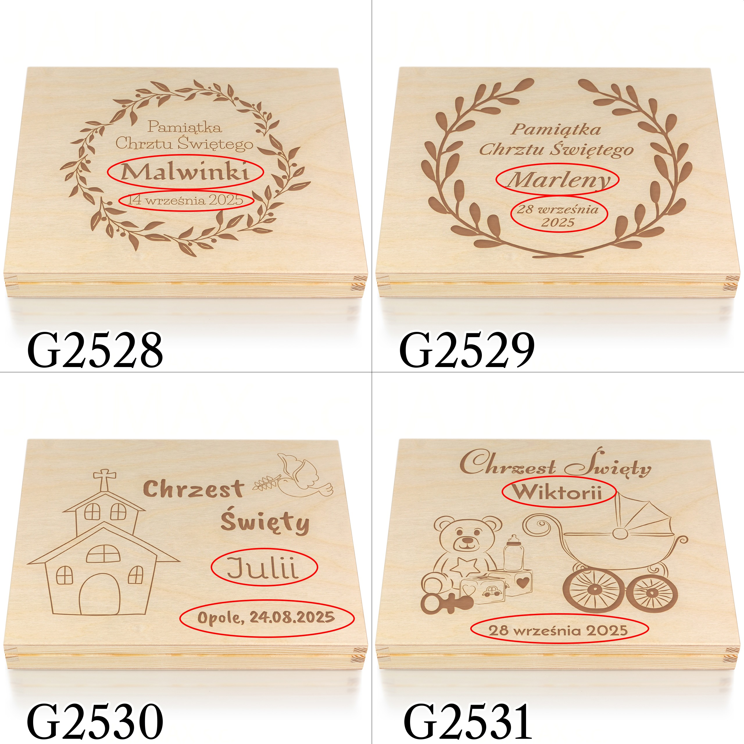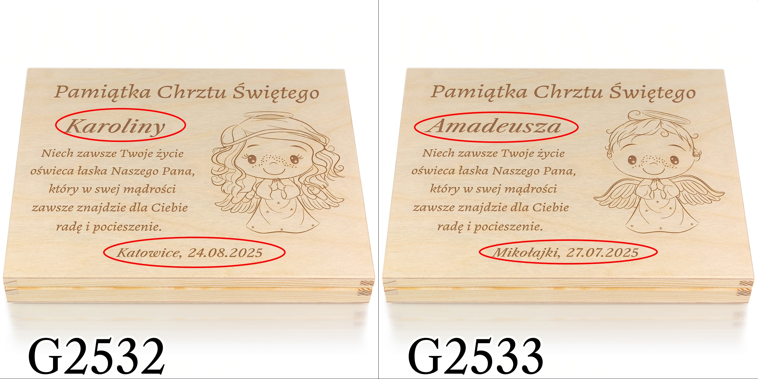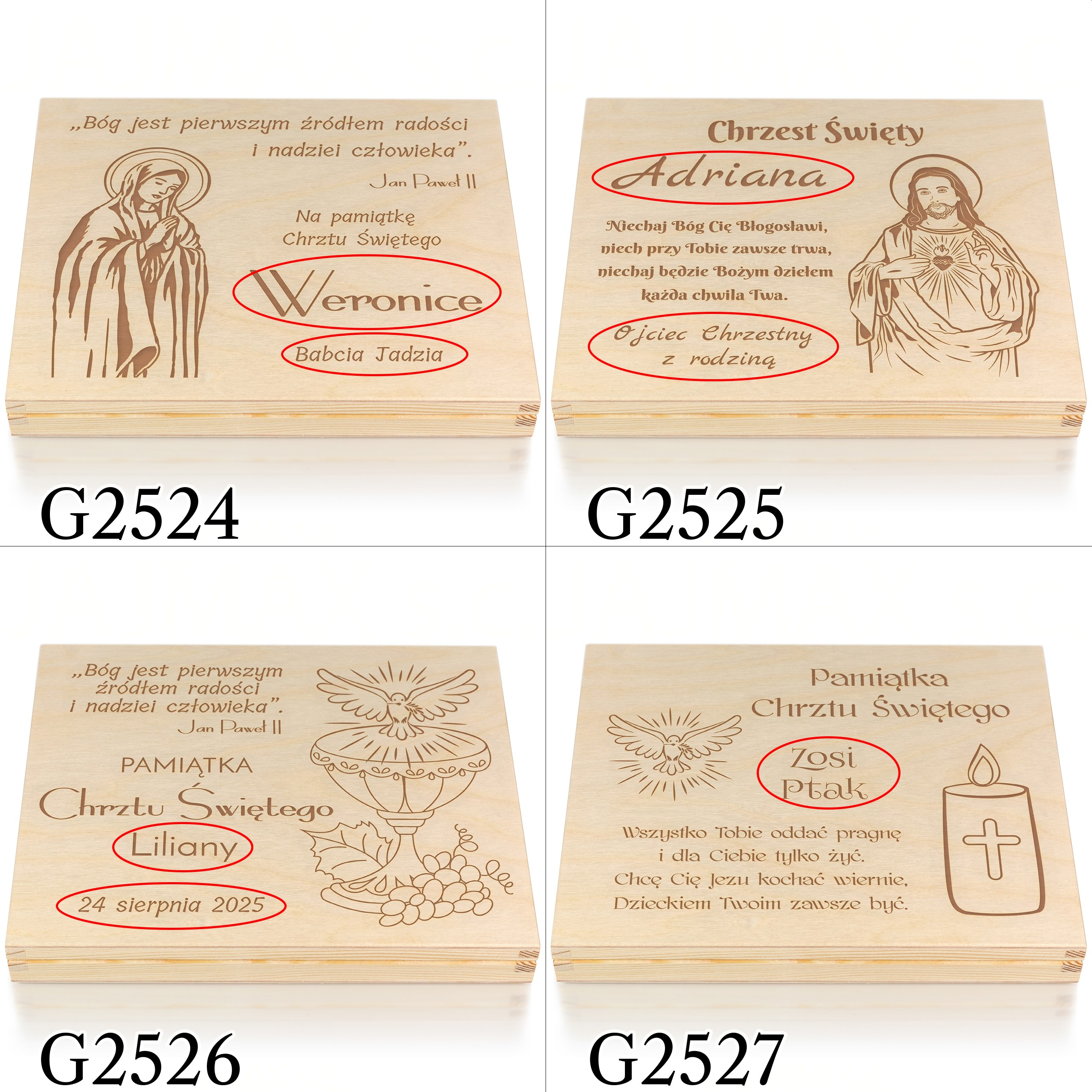 Jeżeli niebawem wybierasz się na Chrzest Święty i zastanawiasz się jaki prezent na chrzest dla dziecka wybrać, doskonale trafiłeś. Nasze spersonalizowane drewniane pudełko doskonale zastąpi tradycyjną kopertę i w pomysłowy sposób będziesz mógł podarować w prezencie pieniądze. W pudełku możesz podarować również inny prezent na chrzest np. łańcuszek, zdjęcia, czekoladki Merci. Indywidualny grawer według Twojego zamówienia sprawia, że takie pamiątki chrztu dla dziecka są wyjątkowe. Do wyboru wiele motywów graficznych zarówno religijnych jak i dziecięcych, dlatego z pewnością znajdziesz wzór idealny zarówno na prezent na chrzest dla chłopca jak i prezent na chrzest dla dziewczynki.