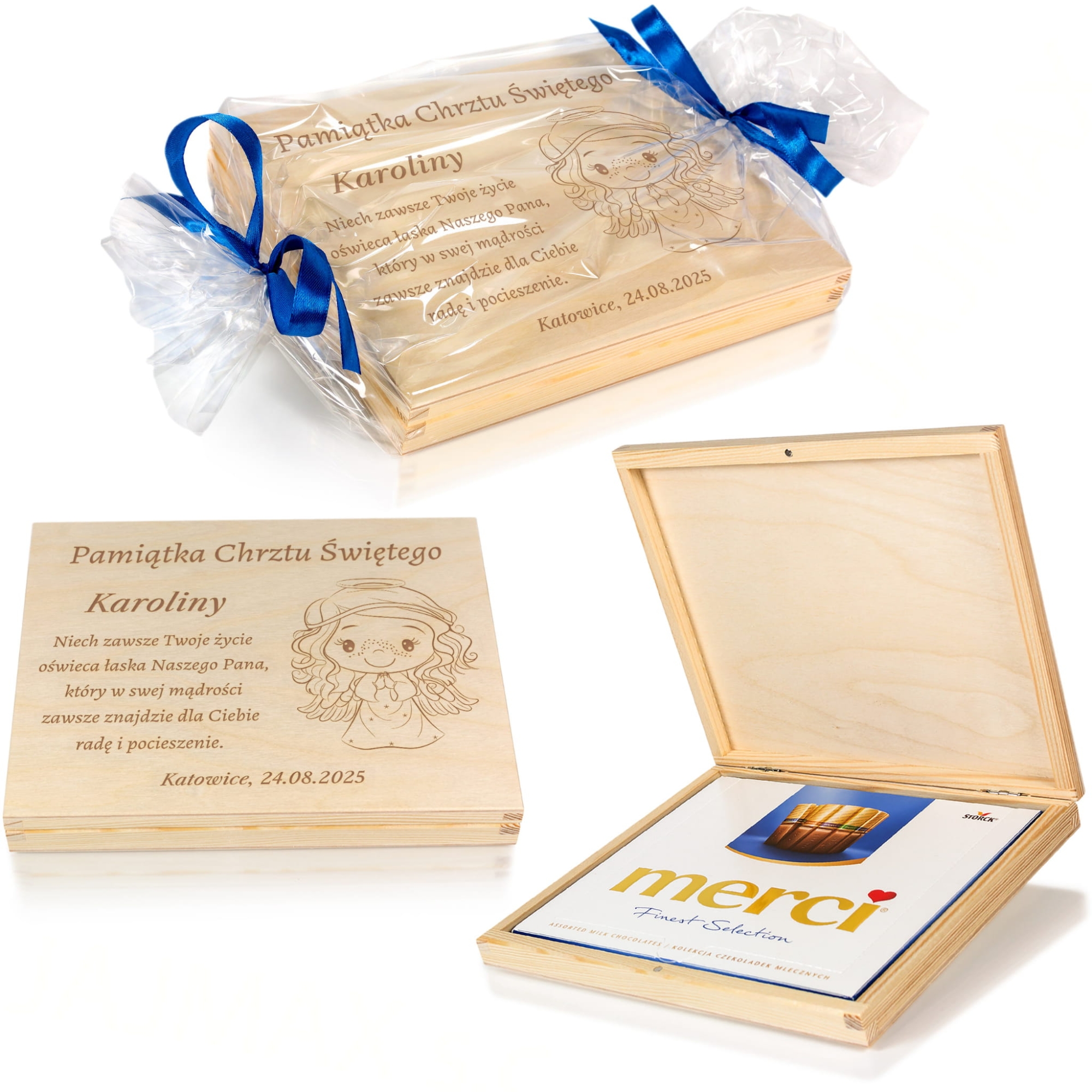 Kupujesz drewniane pudełeczko z grawerem. Czekoladki Merci są tylko częścią ekspozycji i nie należą do zestawu.