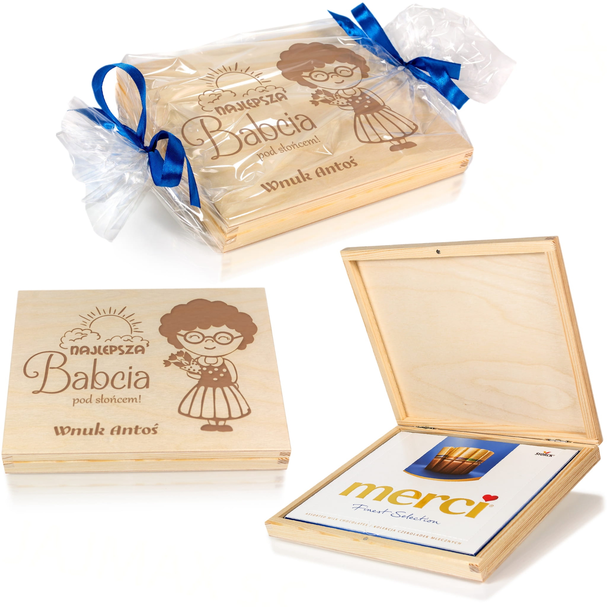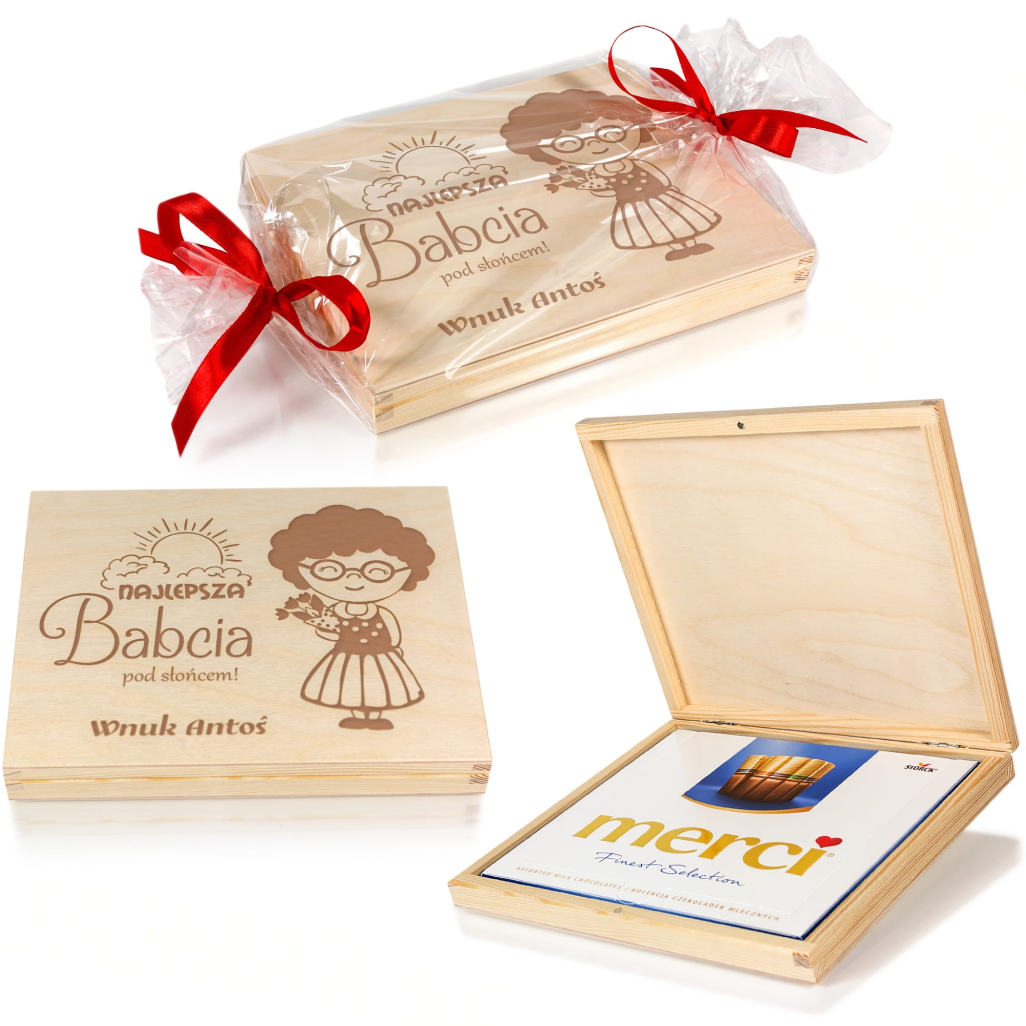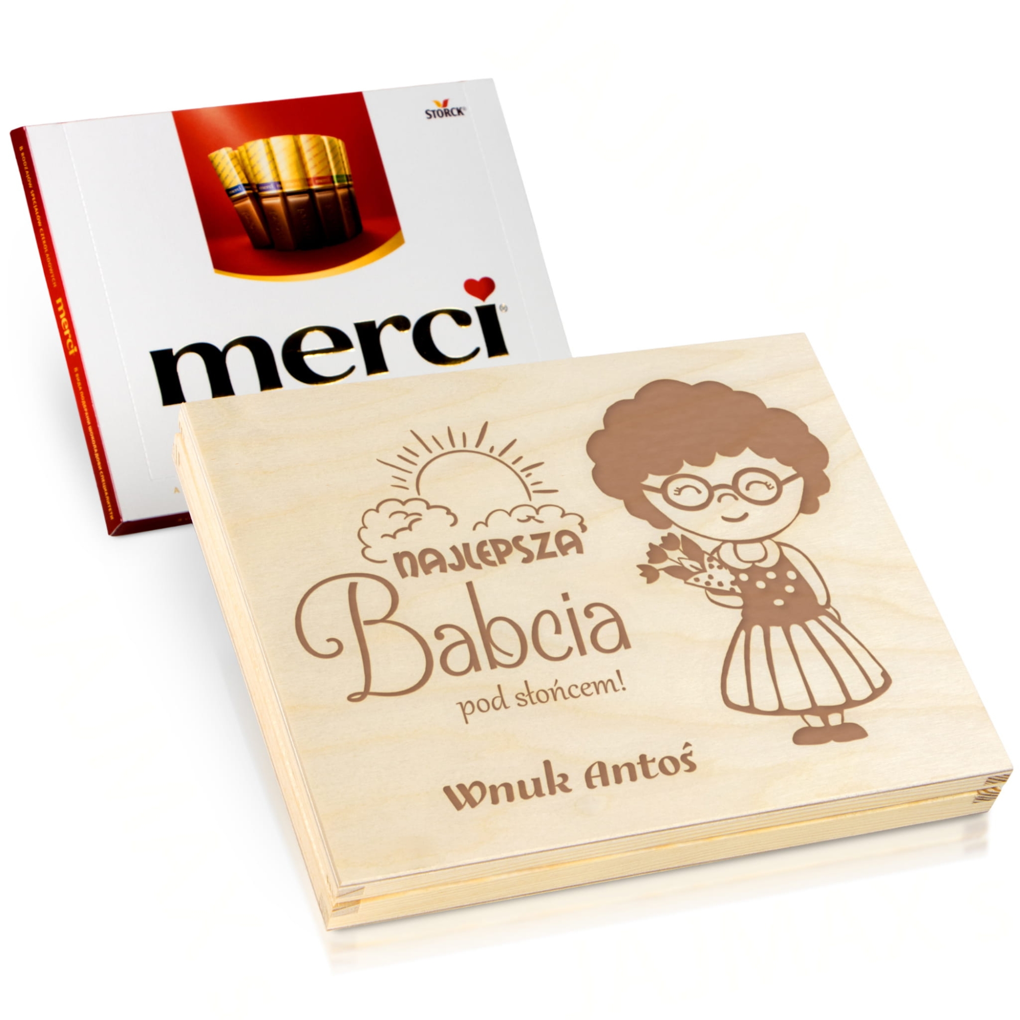 Kupujesz drewniane pudełeczko z grawerem. Czekoladki Merci są tylko częścią ekspozycji i nie należą do zestawu.