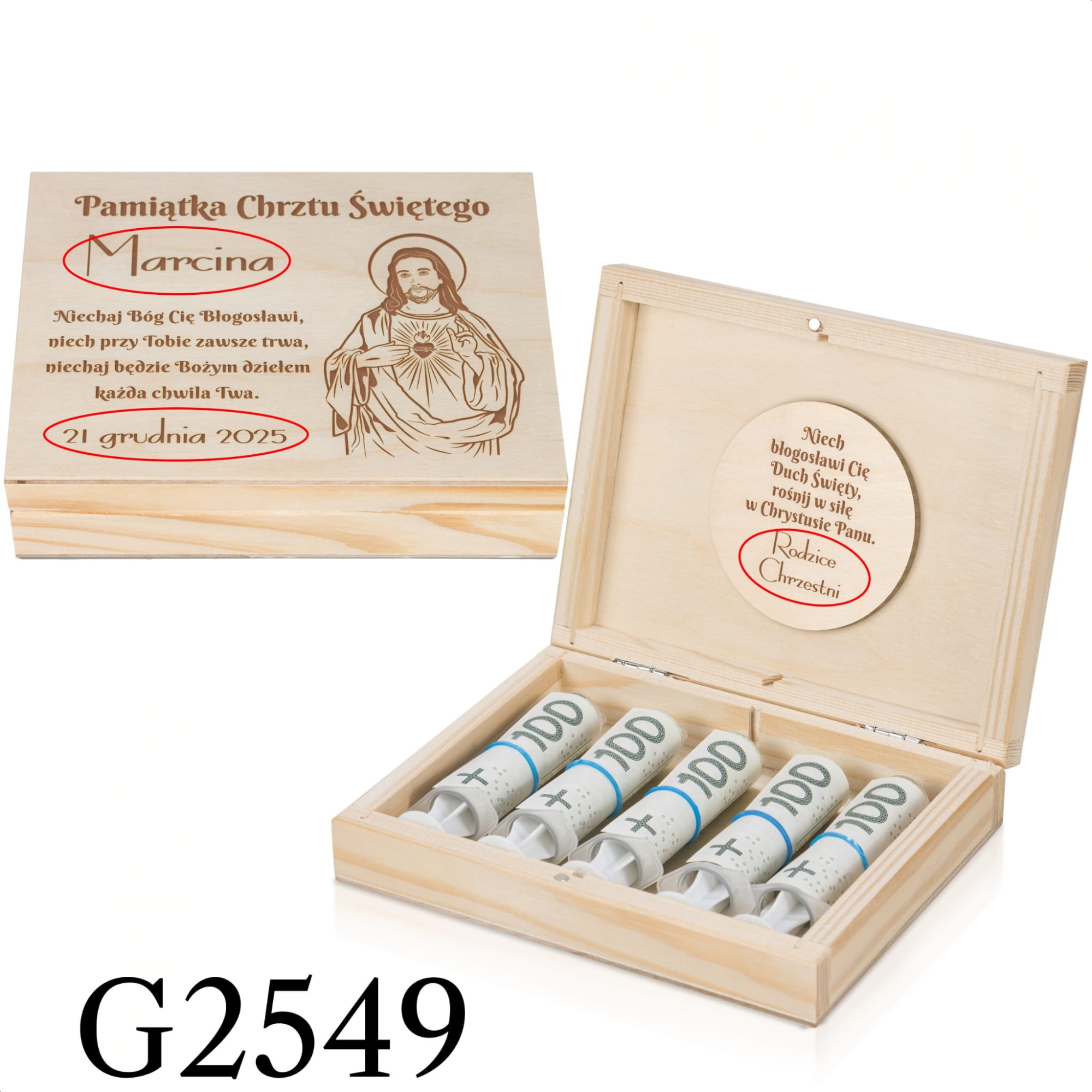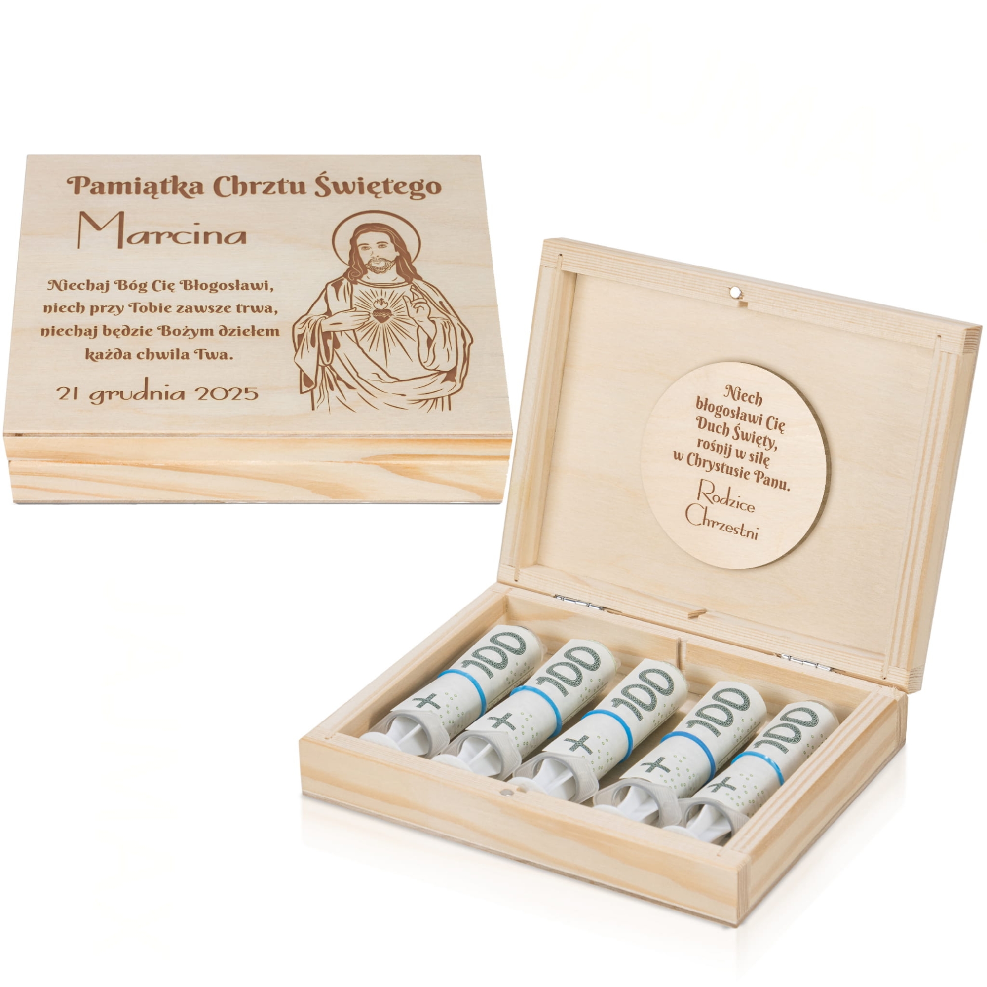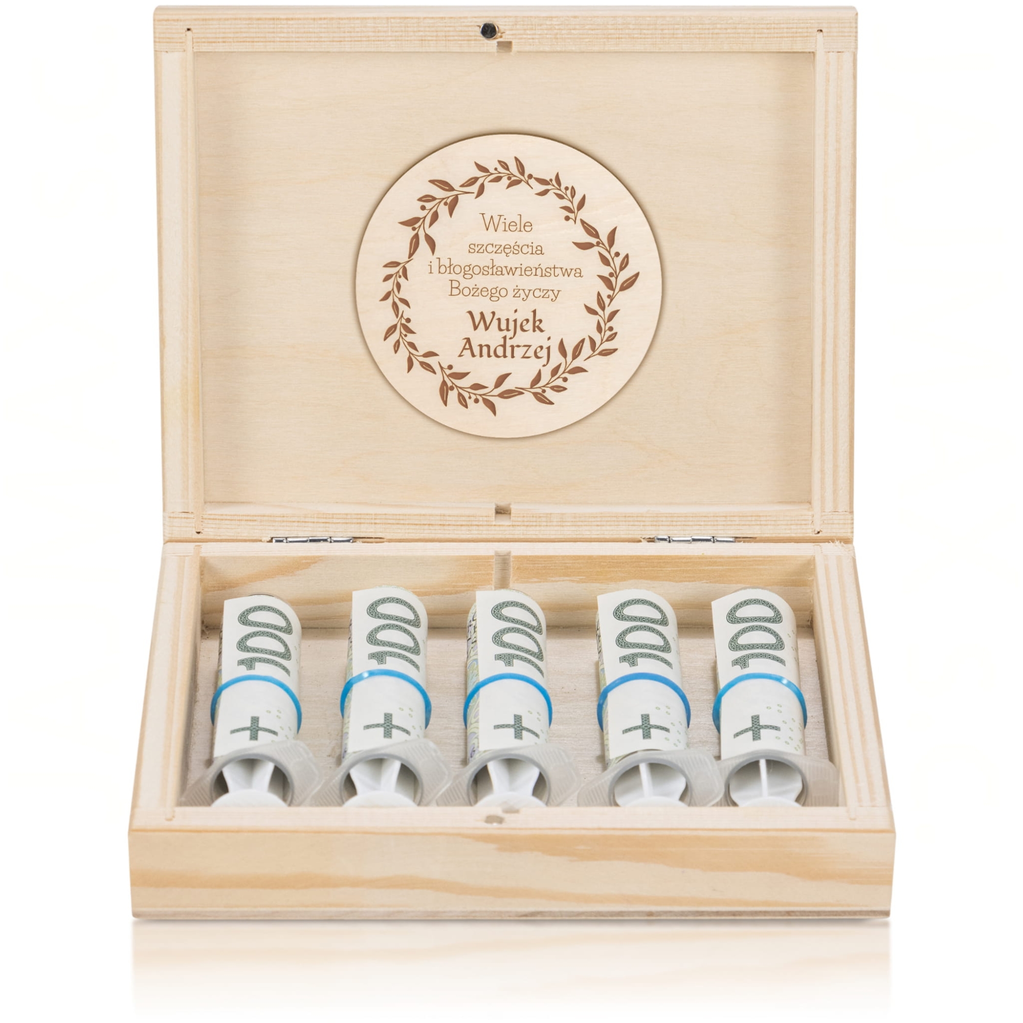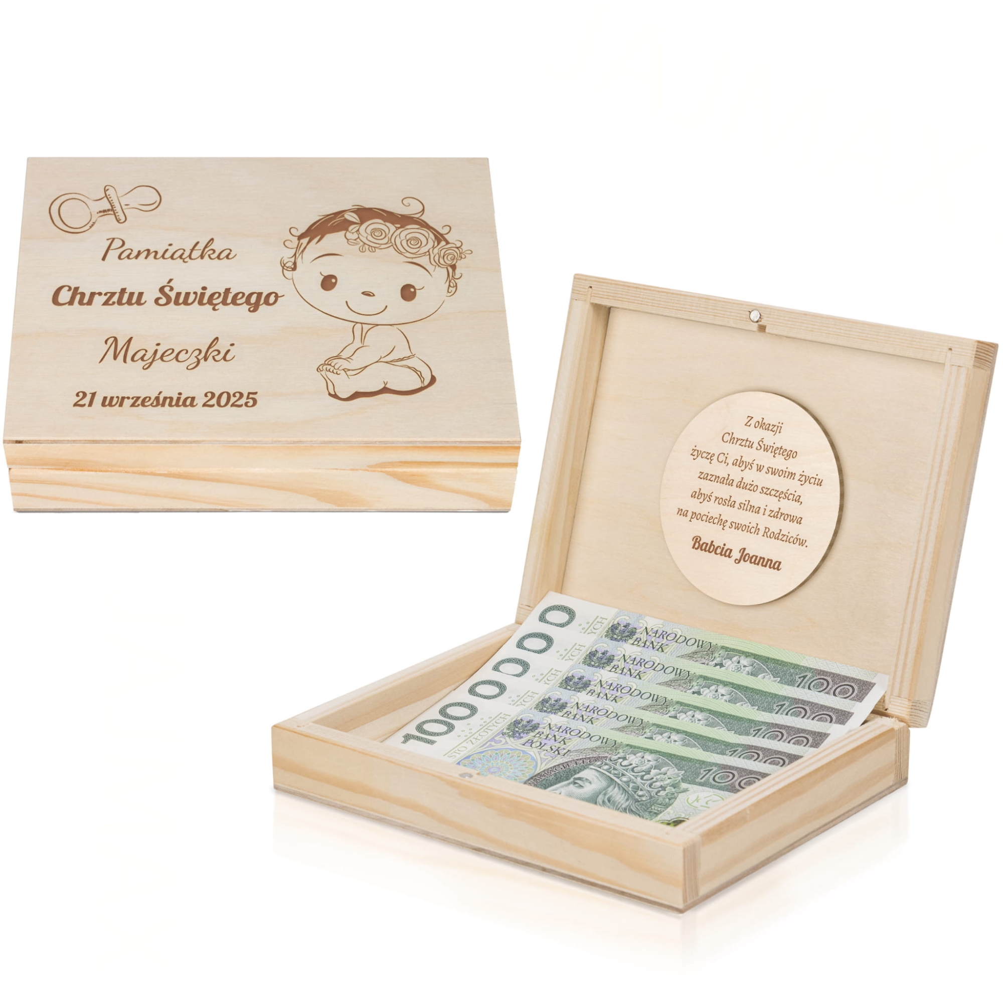 Drewniane pudełko zastrzyk gotówki prezent na chrzest z grawerem
