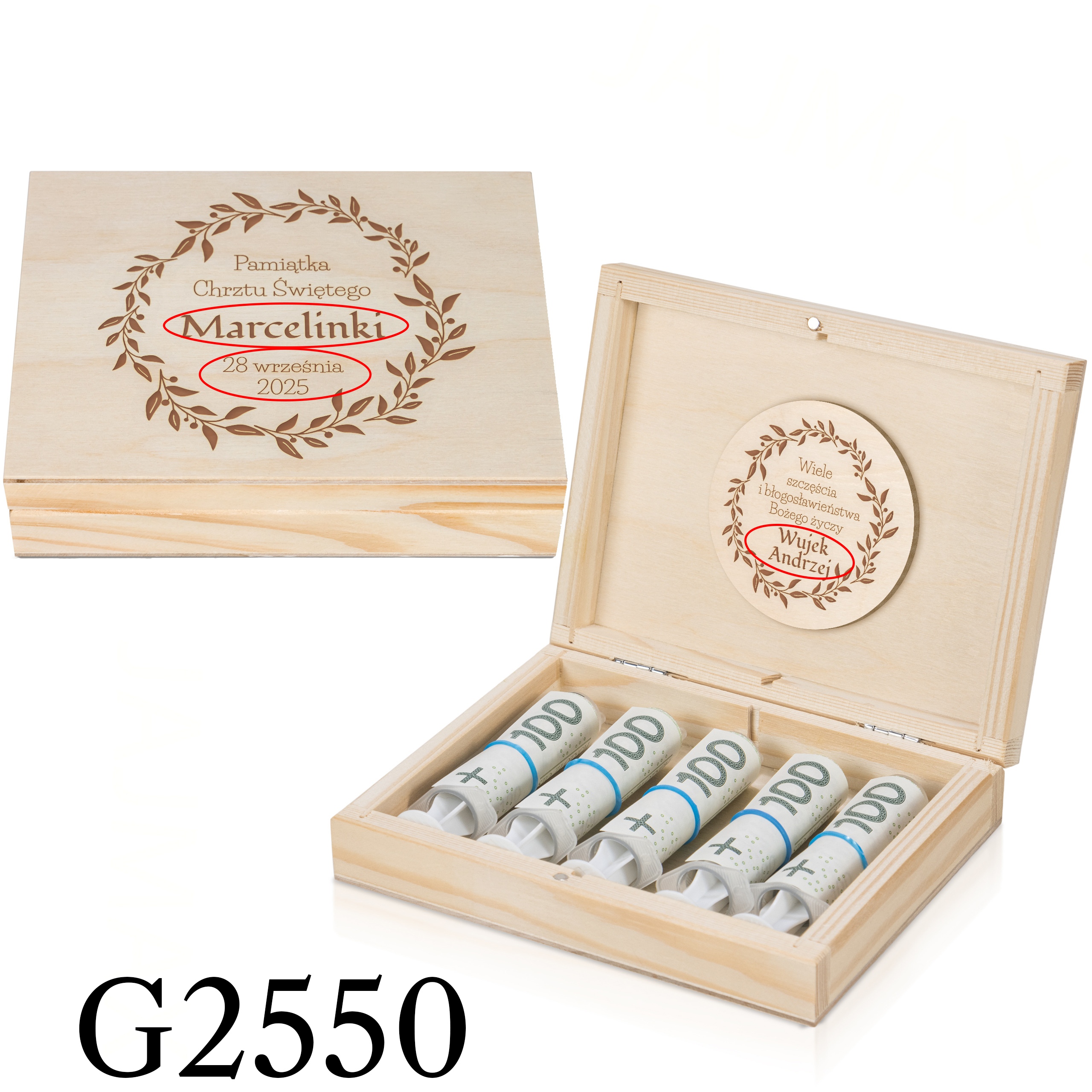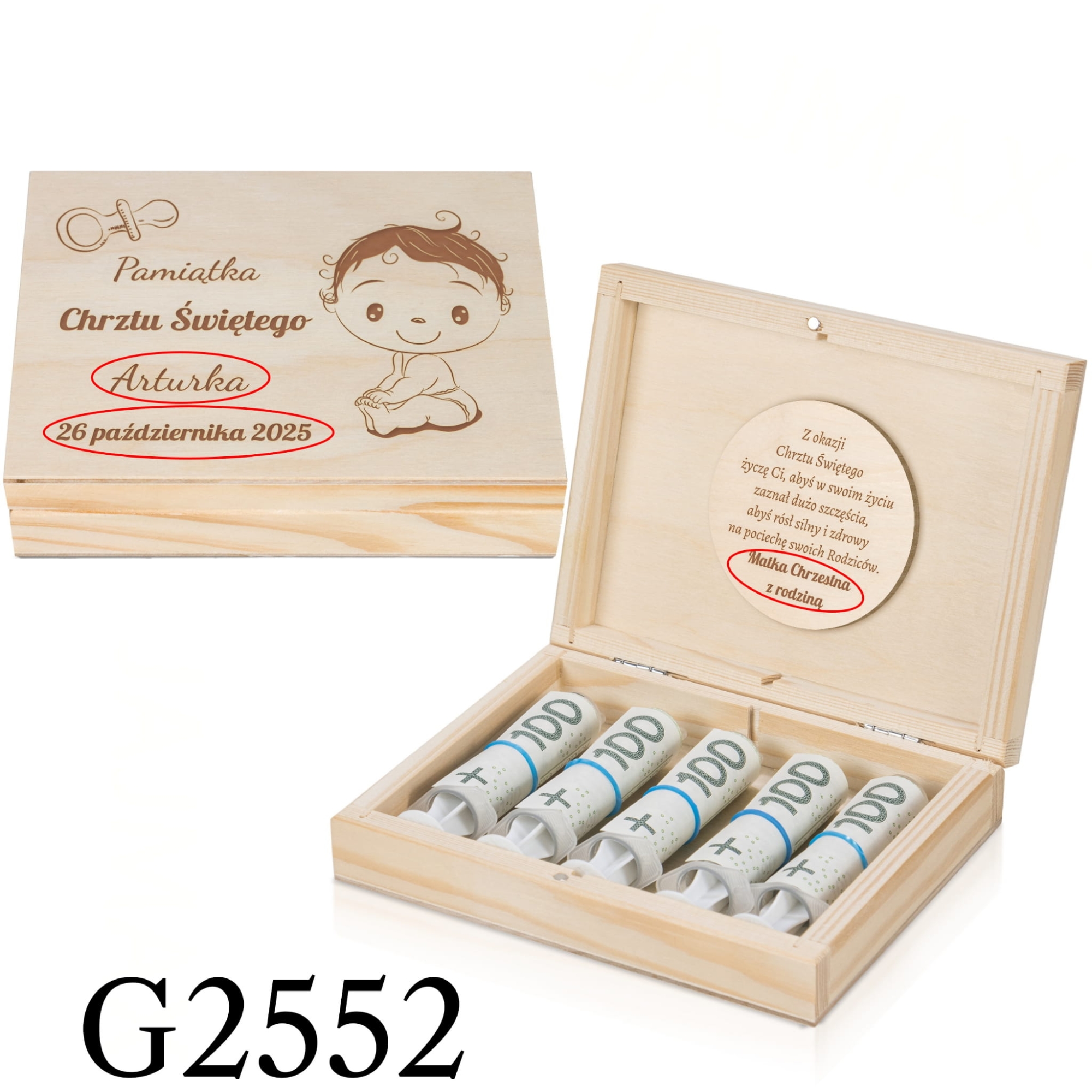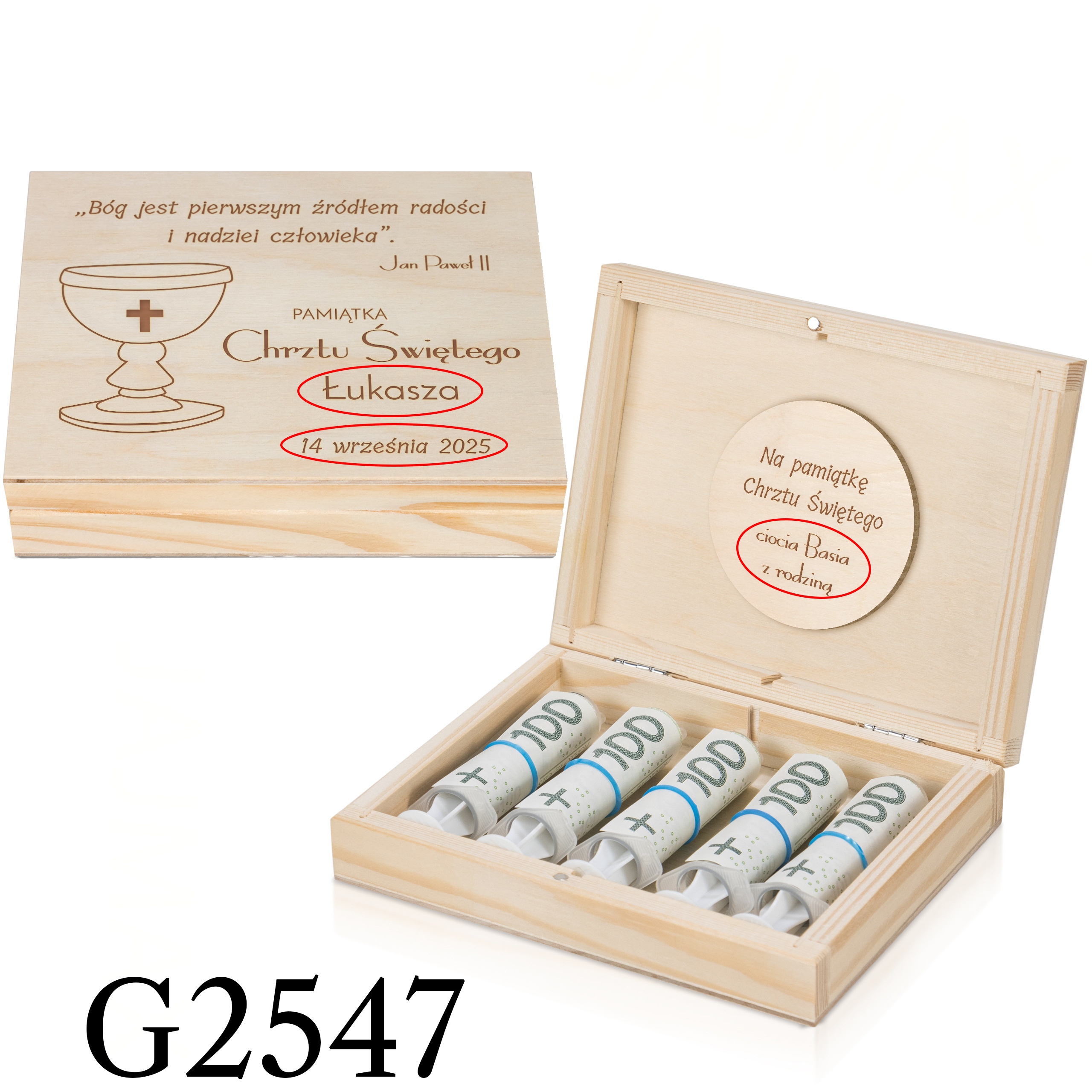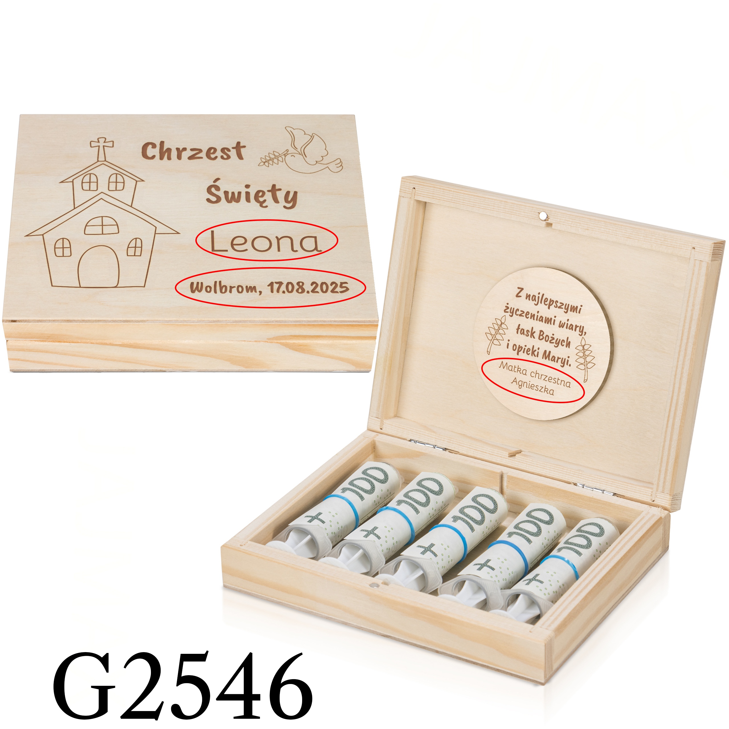 Drewniane pudełko zastrzyk gotówki prezent na chrzest z grawerem