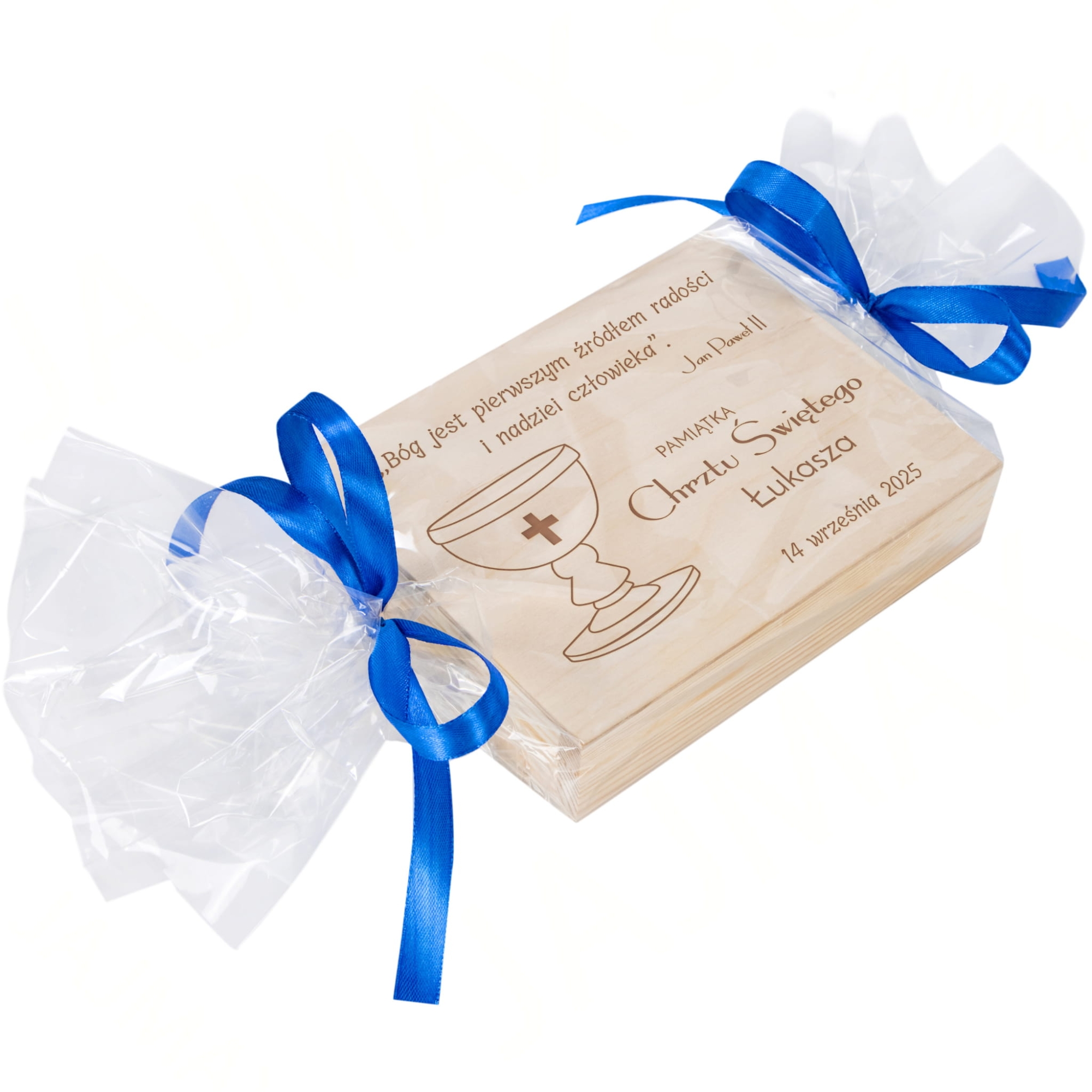 Jeśli niedługo wybierasz się na Chrzest Święty i chciałbyś w wyjątkowy sposób podarować prezent na chrzest dla dziecka w formie gotówki, świetnie trafiłeś. Nasze drewniane pudełko na pieniądze jest niezwykle poręczne i idealnie mieści 5 strzykawek, które są częścią zestawu. Dodatkowym atutem naszego pudełka jest wewnętrzne, dyskretne zamykanie na magnes, które uniemożliwia przypadkowe otwarcie. Pudełko z grawerem zostało wzbogacone wewnątrz o koło z grawerem, dzięki temu także po otwarciu prezentuje się znakomicie. Pudełko na pieniądze 'zastrzyk gotówki' z naszej oferty to nowoczesna kartka z życzeniami. Na szczególną okazję Chrztu Świętego do naszych projektów wykorzystaliśmy zarówno symbole religijne jak i motywy dziecięce. Z łatwością znajdziesz wzór na prezent na chrzest dla dziewczynki i prezent na chrzest dla chłopca. Spersonalizowane życzenia sprawią, że tego typu pamiątki z chrztu będą jeszcze bardziej wyjątkowe.