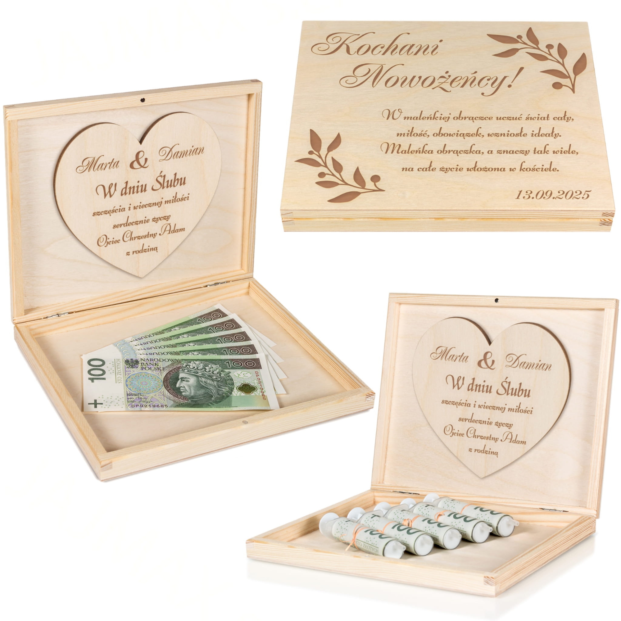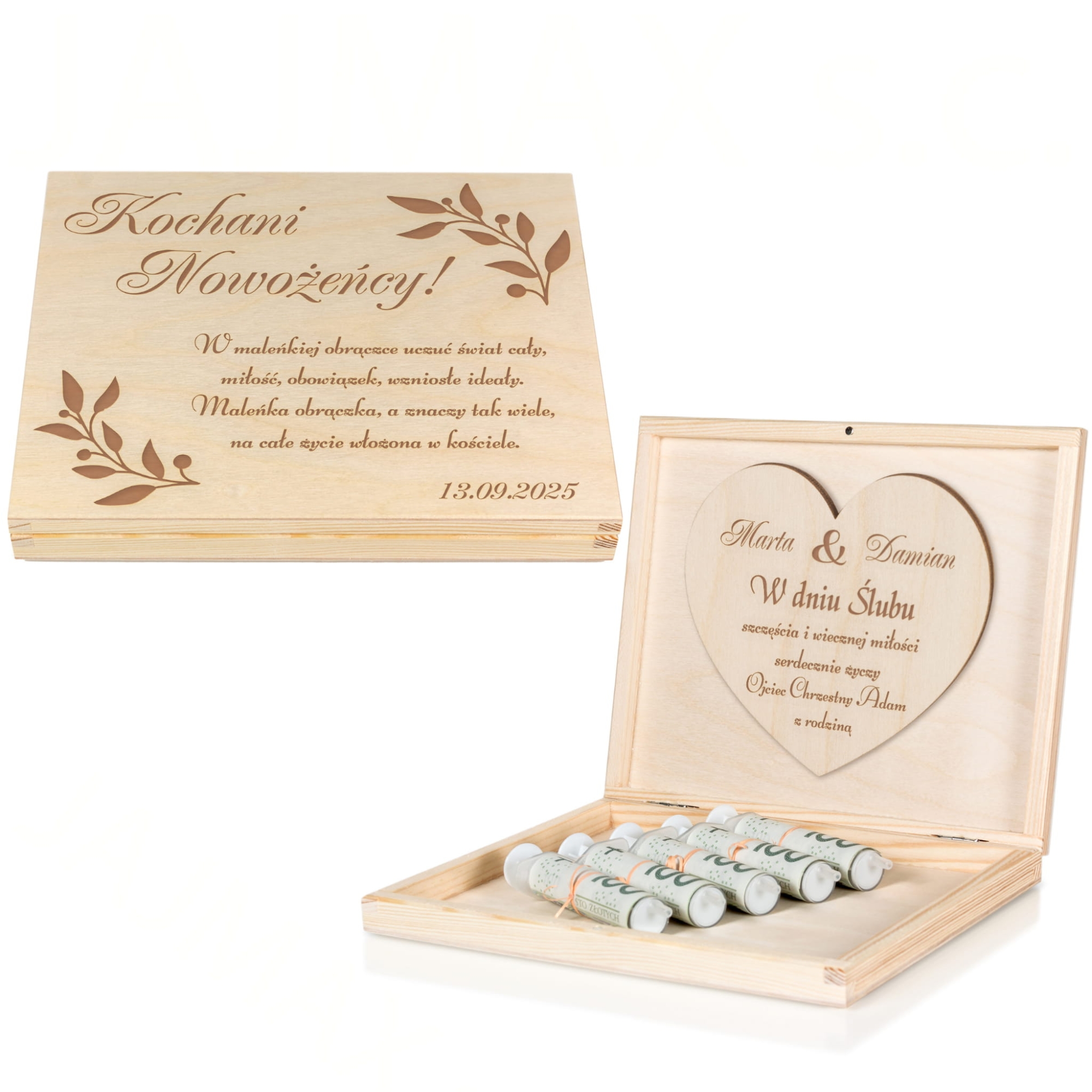 Drewniane pudełko na pieniądze z indywidualnym grawerem