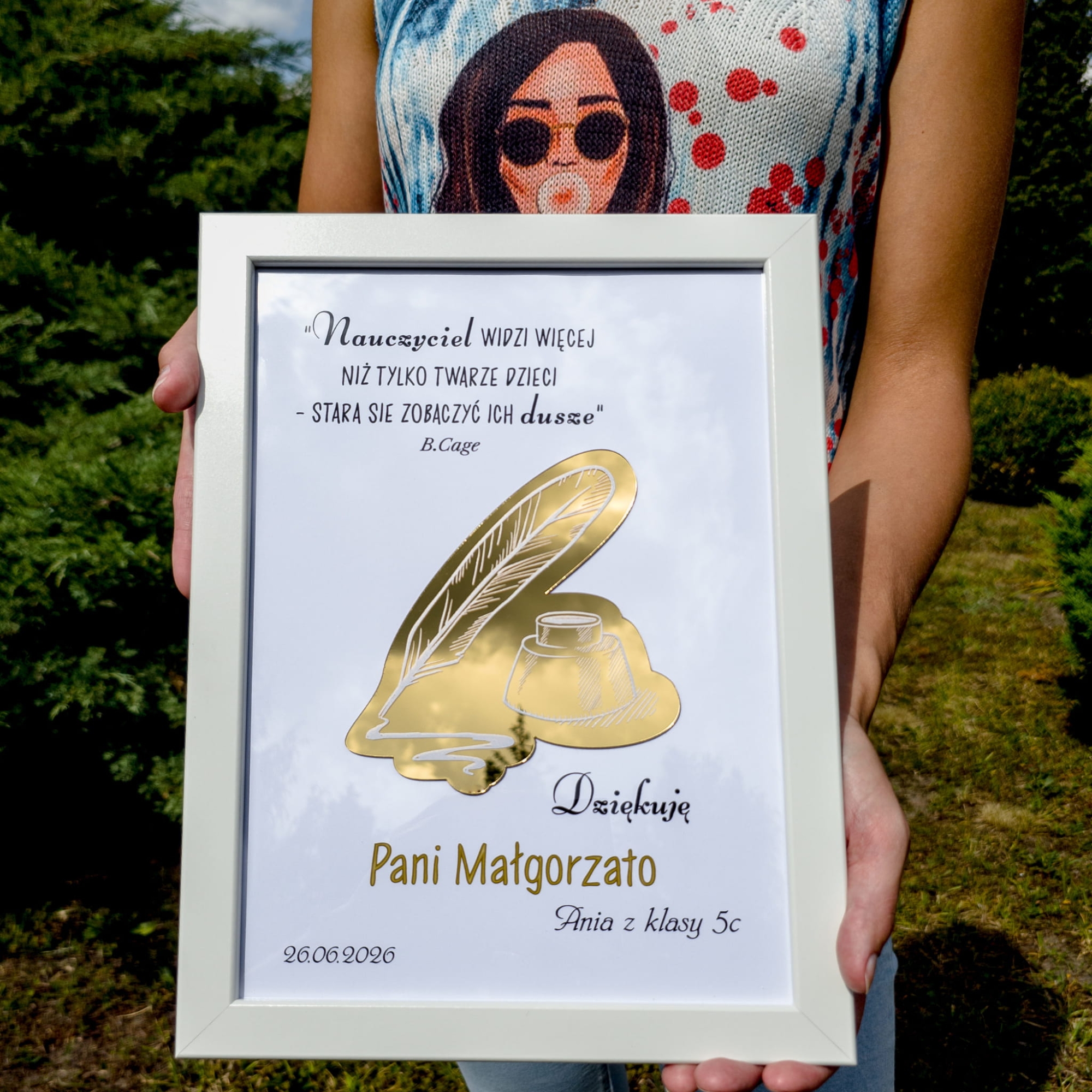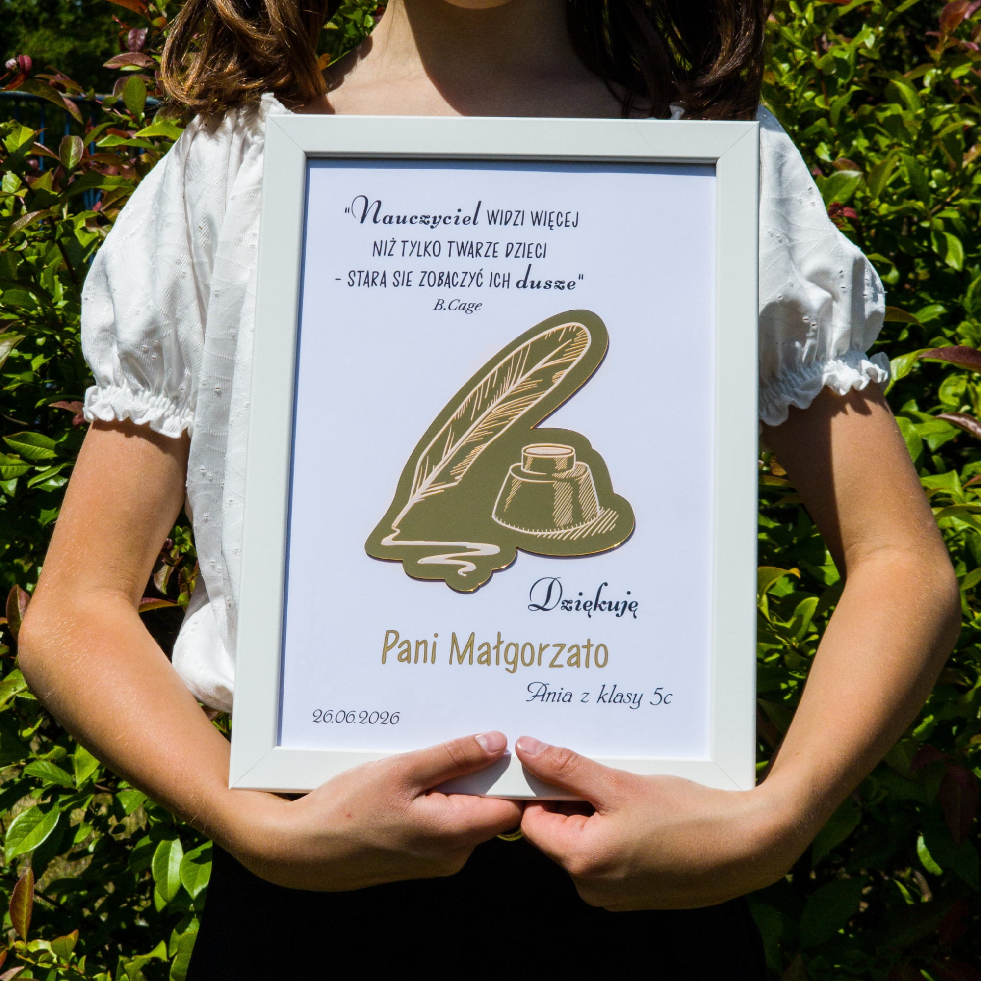 Niech Twoje podziękowanie dla nauczyciela będzie czymś więcej niż słowami – niech będzie pamiątką na całe życie. Wybierz ramkę z złotym kałamarzem i personalizacją i stwórz wyjątkowy moment pełen wdzięczności i emocji.