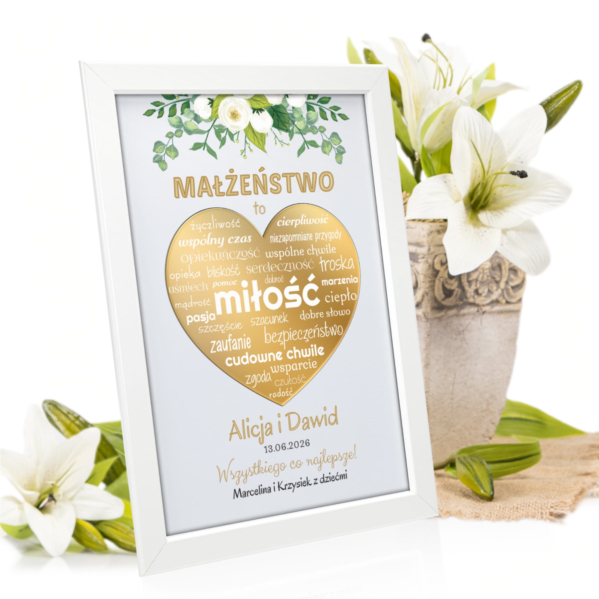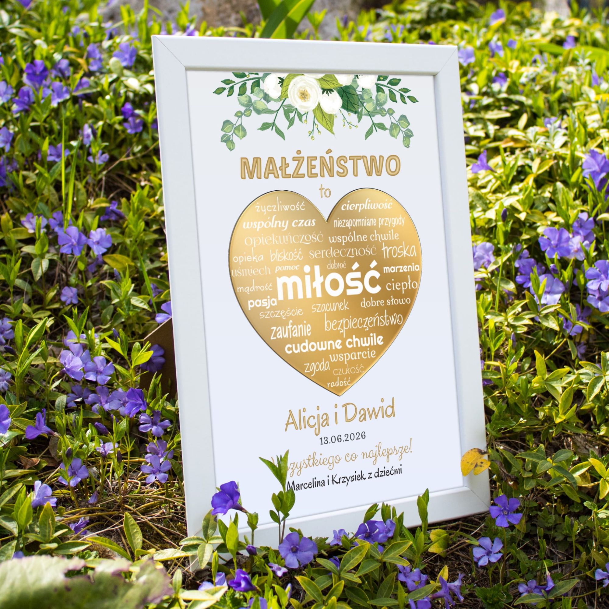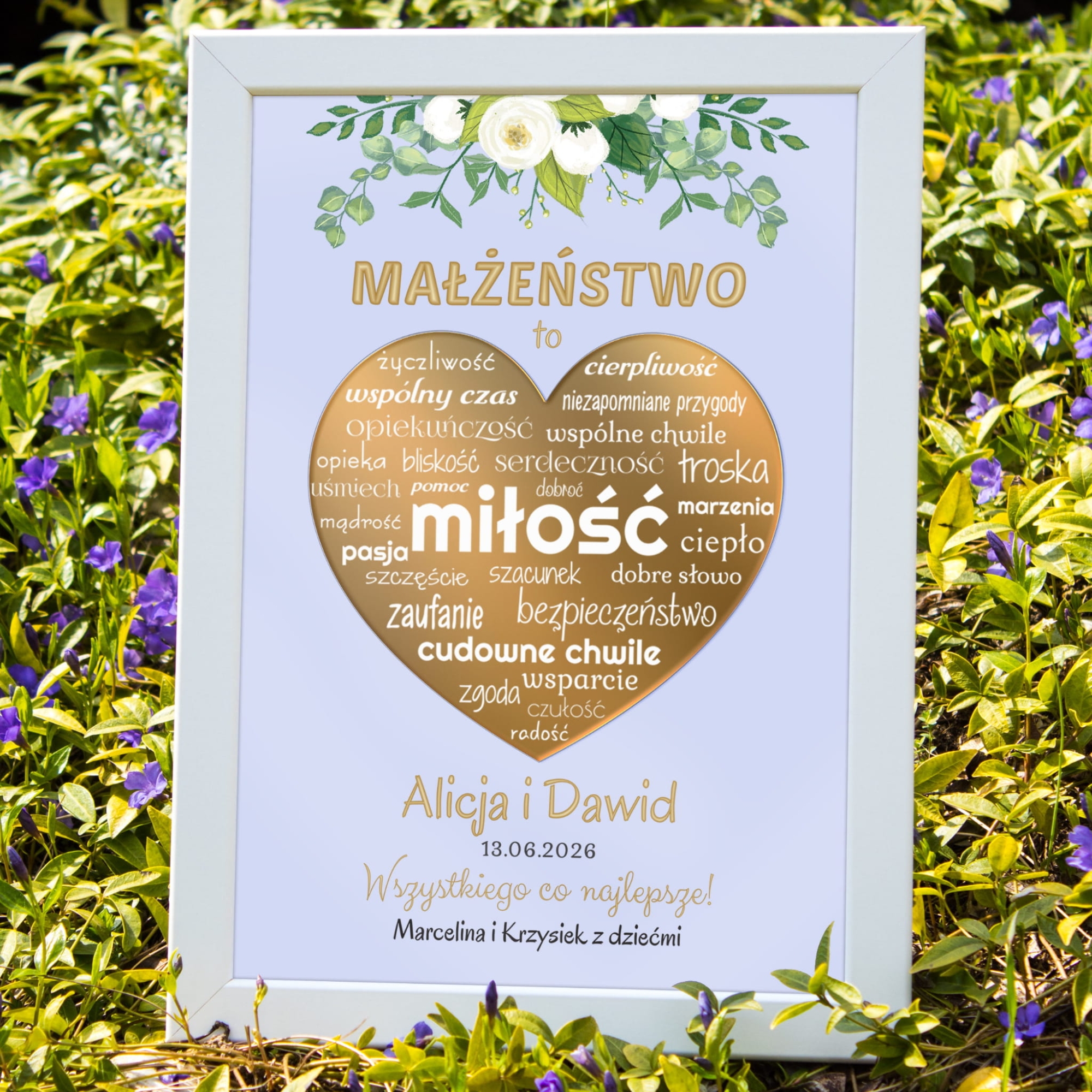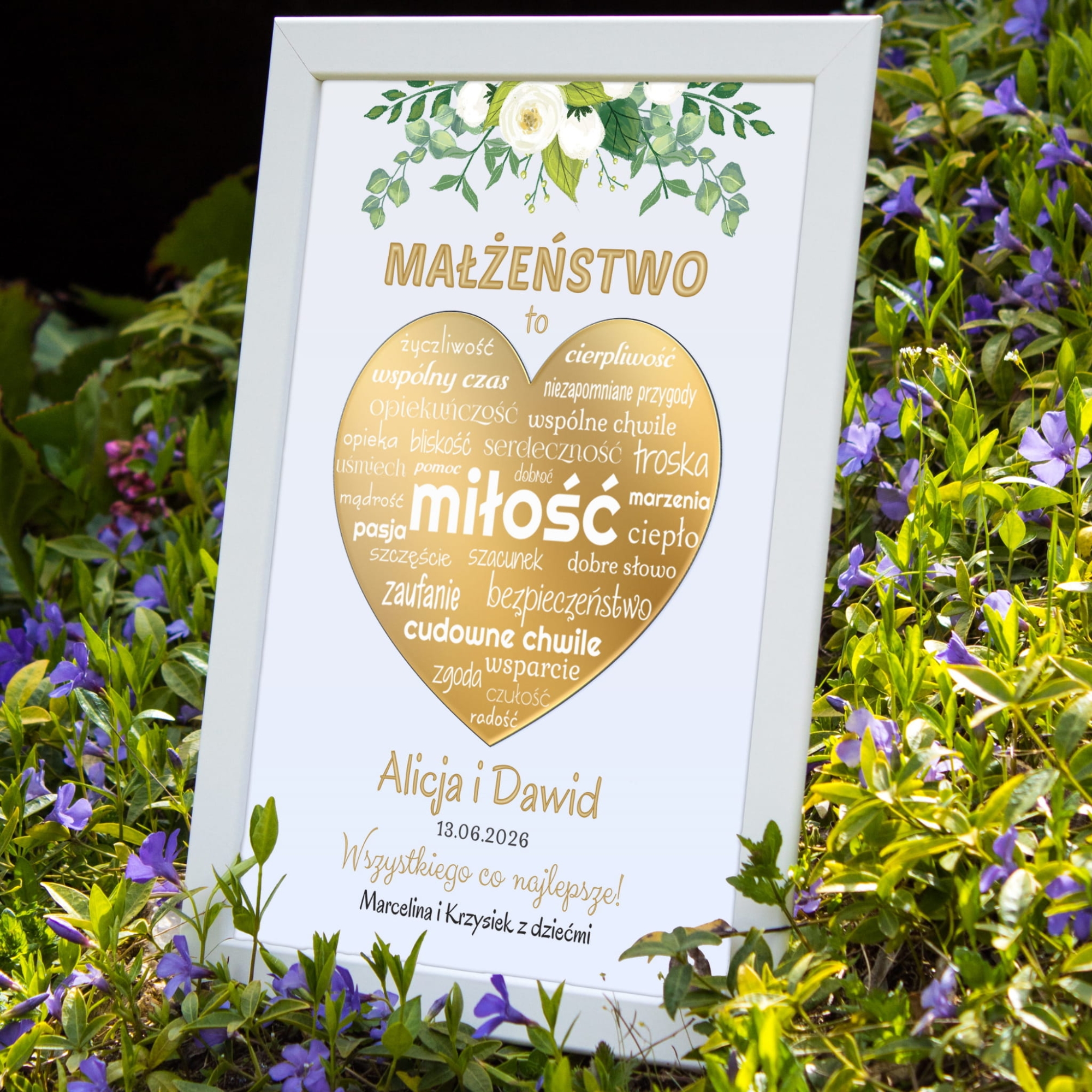 W centrum ramki znajduje się lustrzane złote serce z wyrazami oddającymi istotę małżeństwa: miłość, troska, bliskość, zaufanie, wspólne chwile, szczerość i radość. To subtelna, ale wymowna kompozycja, która będzie poruszać każdego, kto na nią spojrzy.