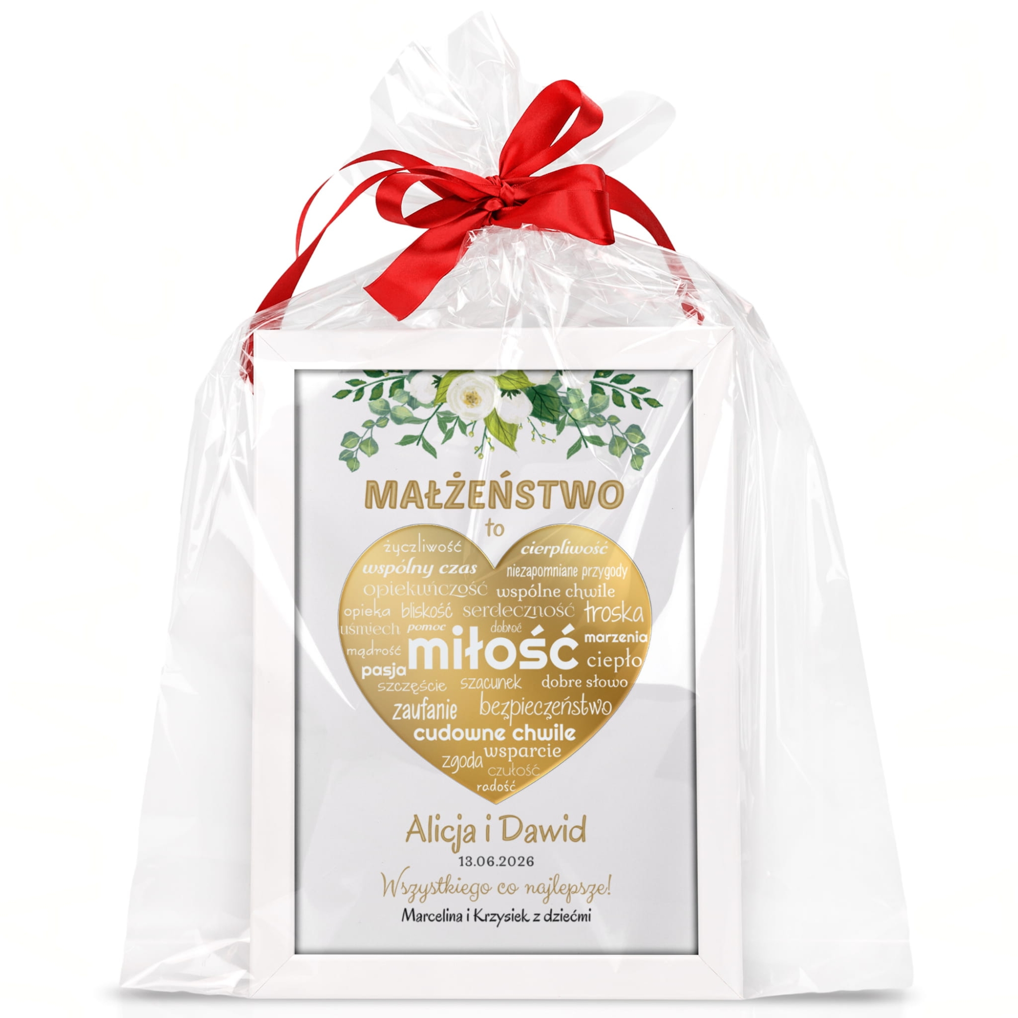 Ramka ślubna z dedykacją – złote serce i imiona nowożeńców