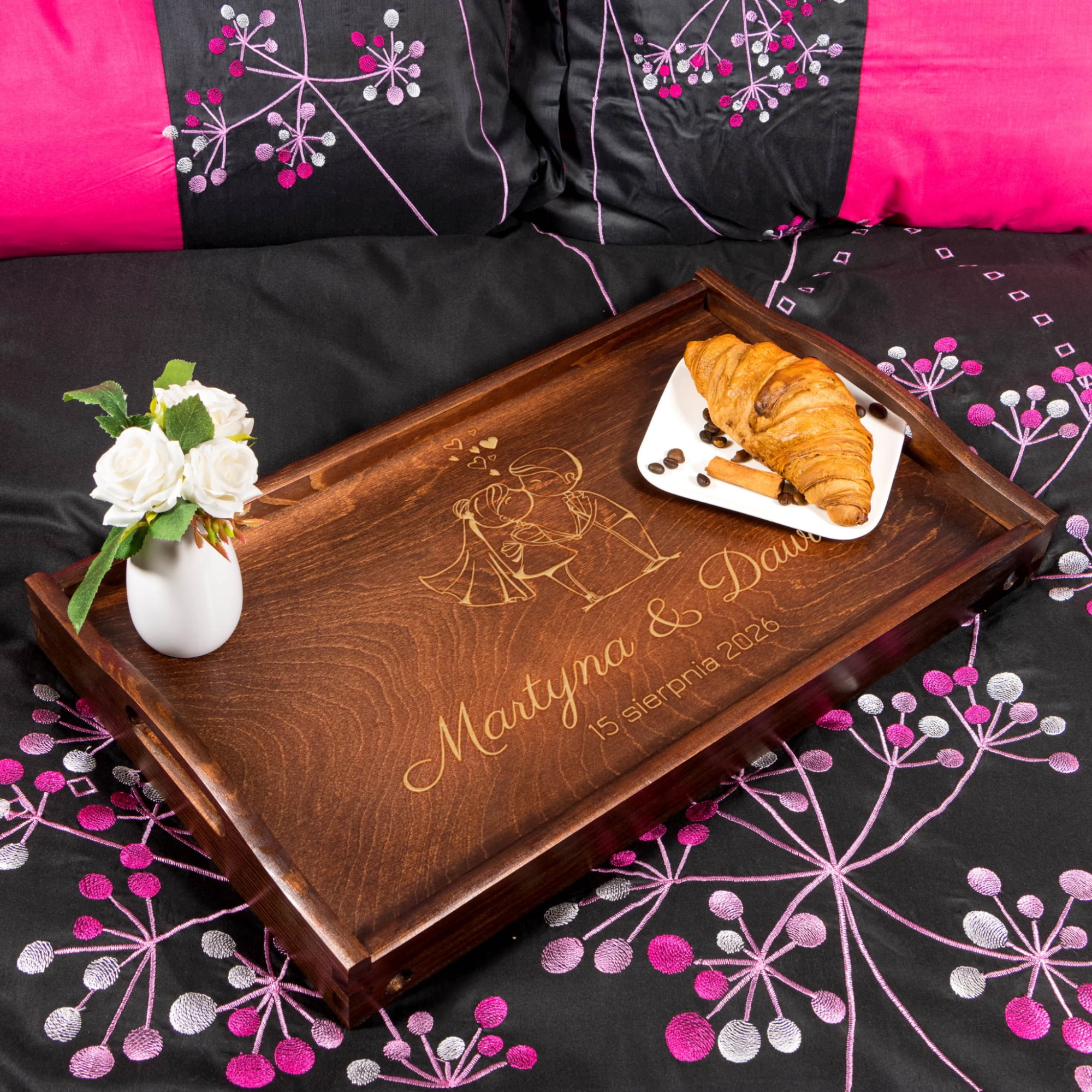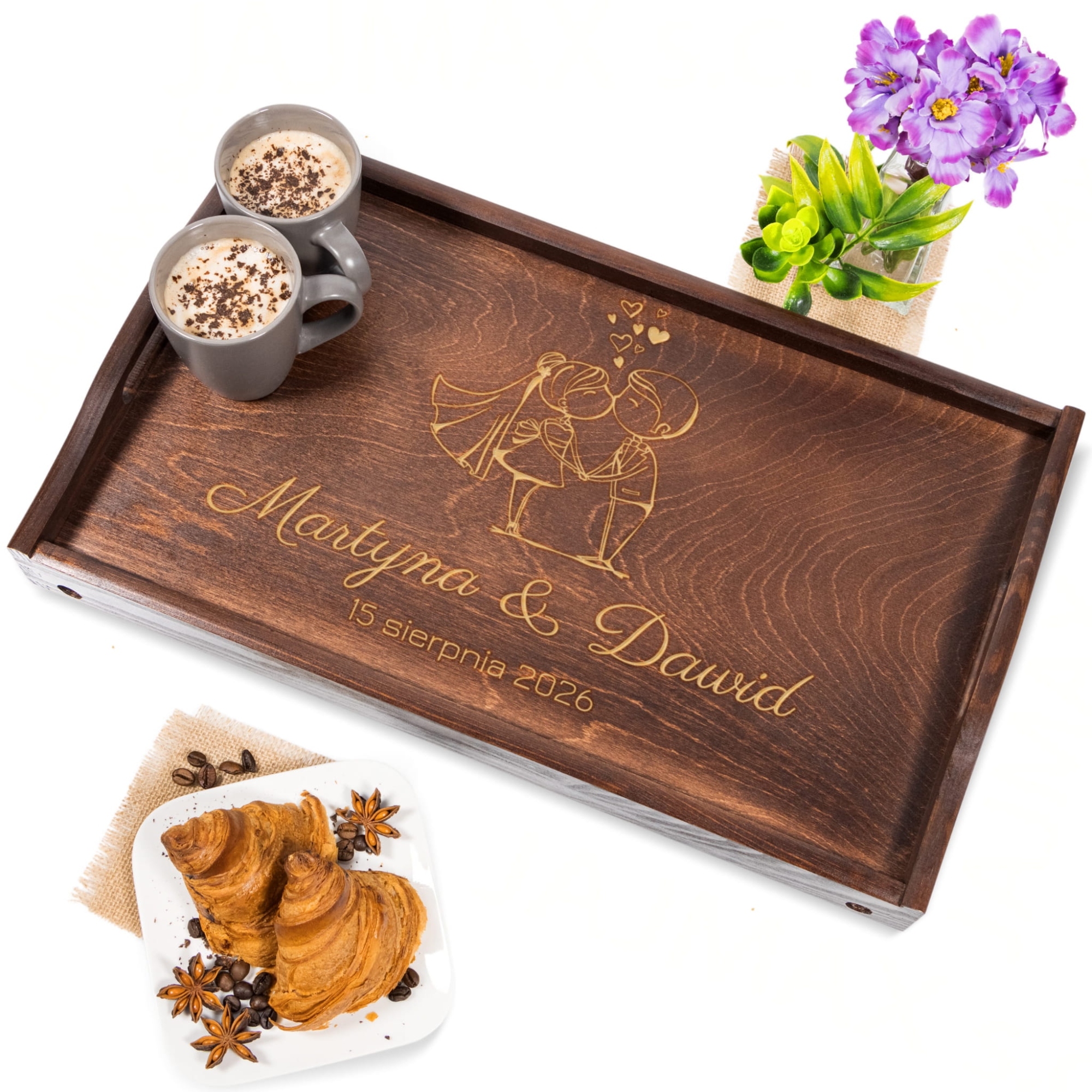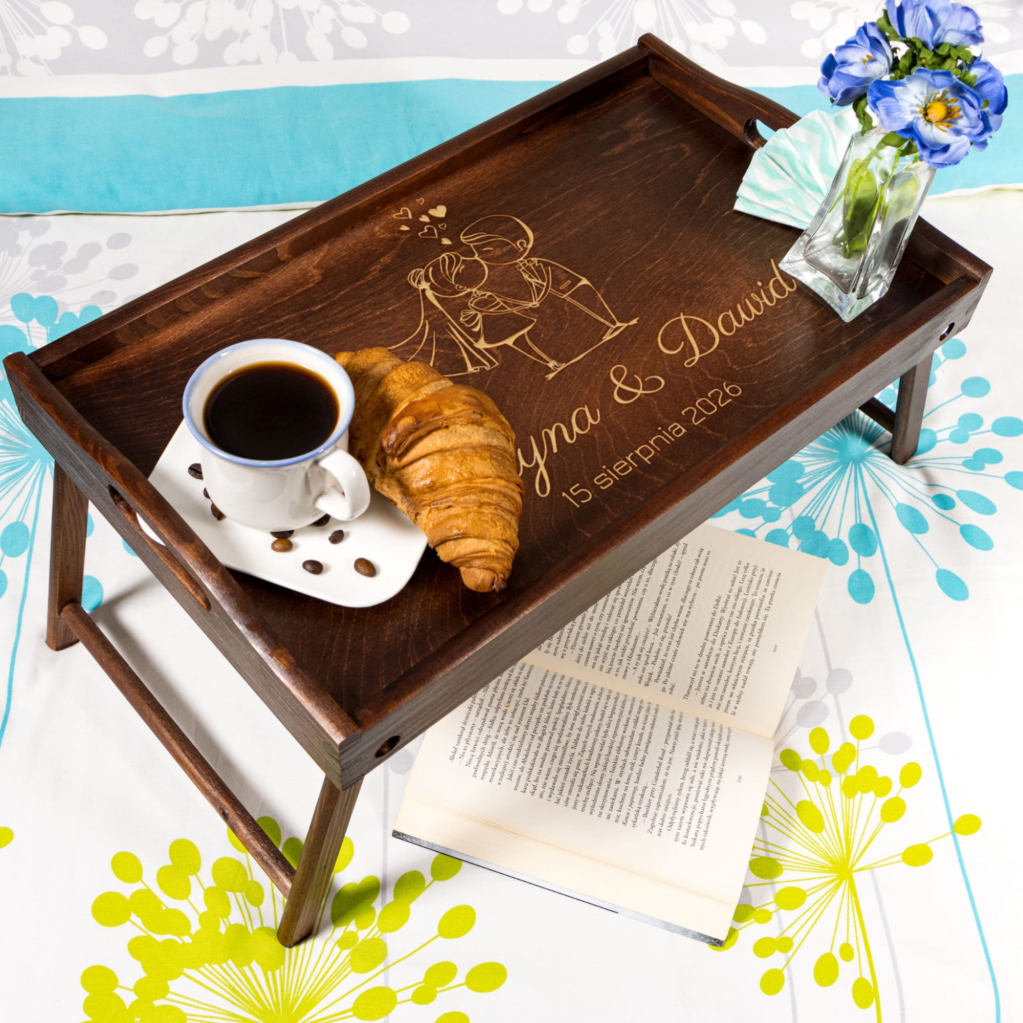 Drewniany stoliczek śniadania do łóżka z imionami Pary Młodej i datą ślubu