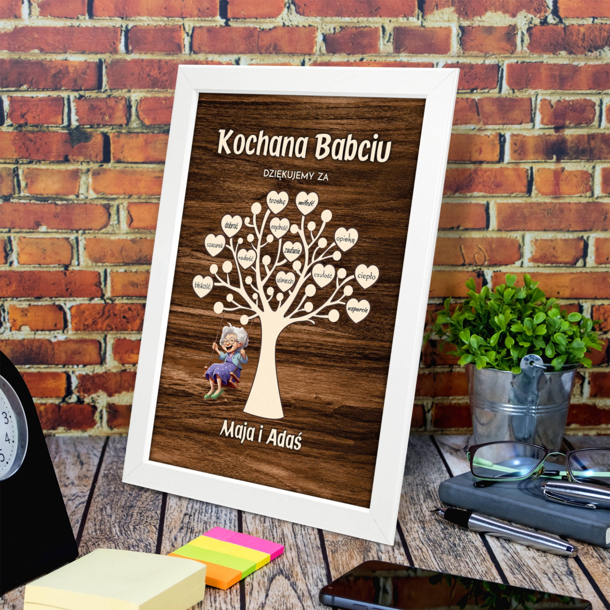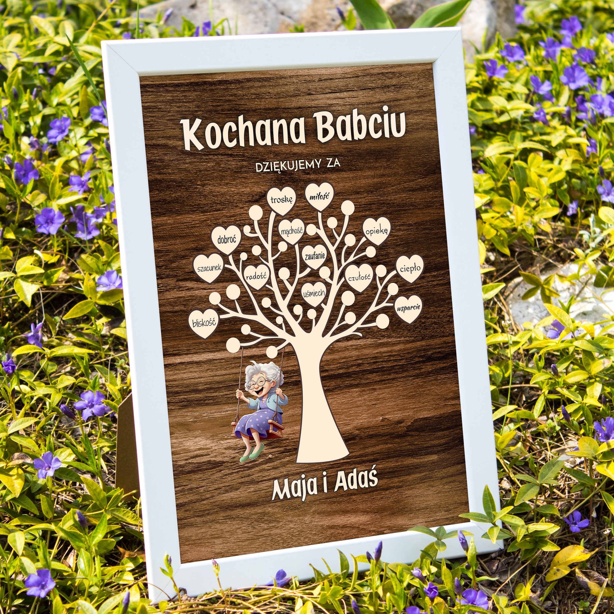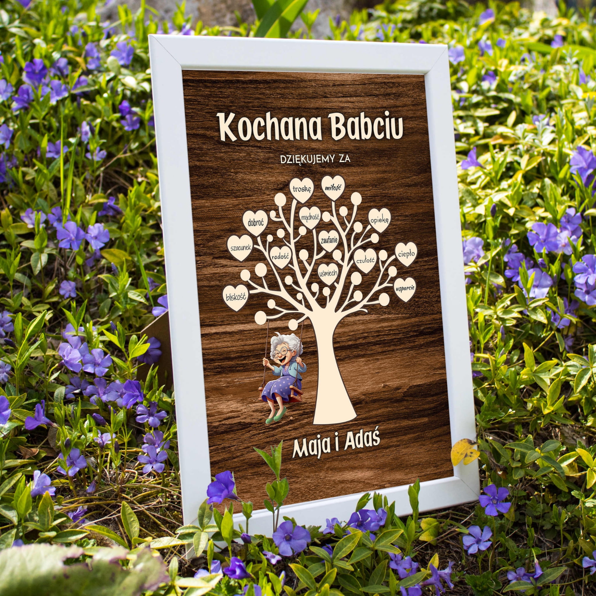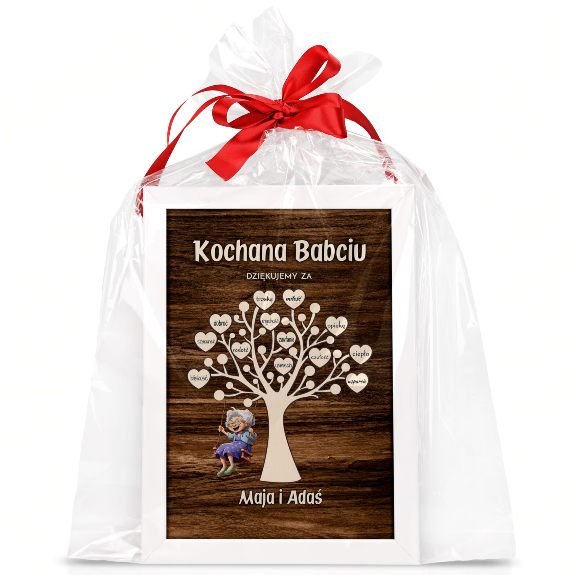 Ramka A4 i plakat dla babci SUPER PREZENT DRZEWKO Z SERCAMI podpis