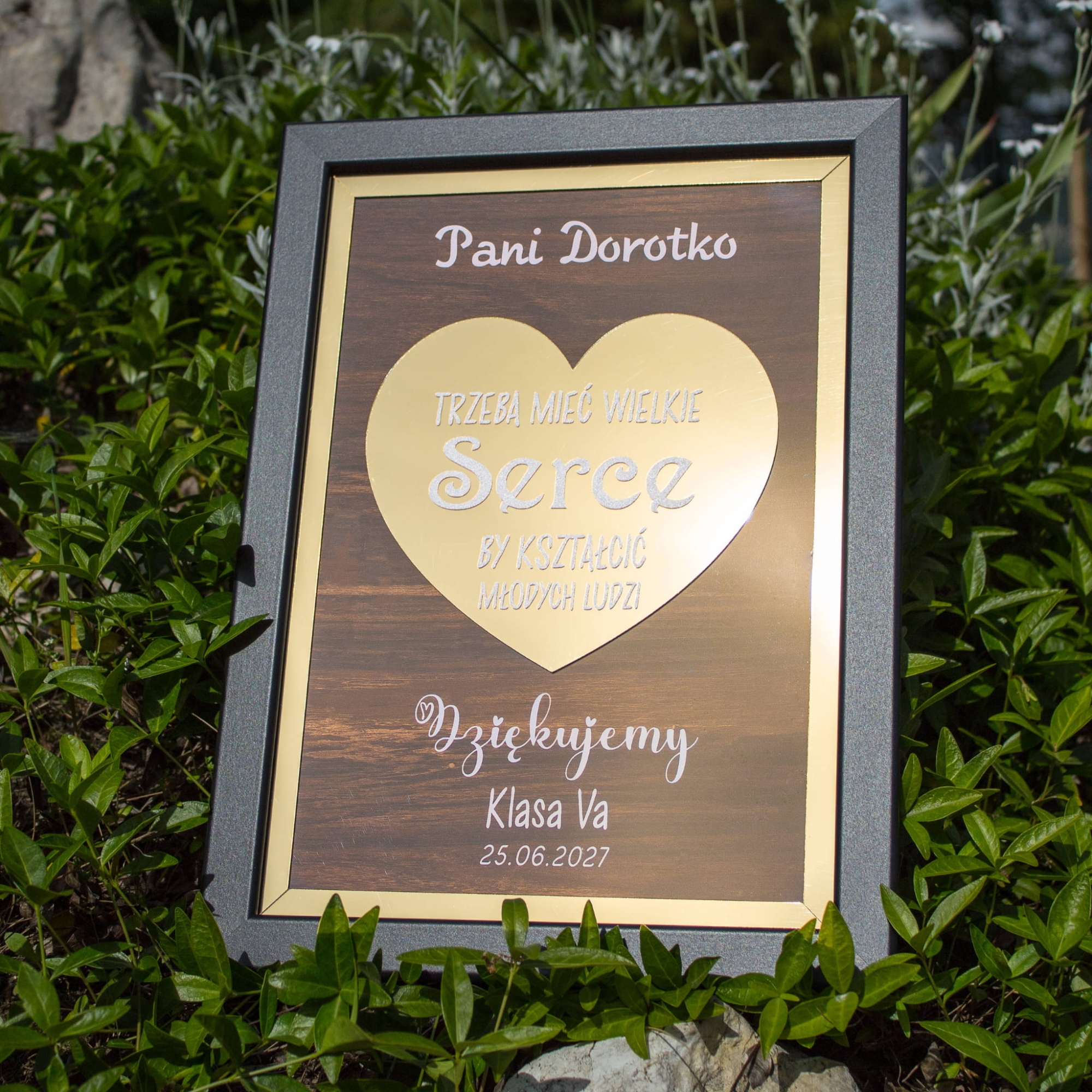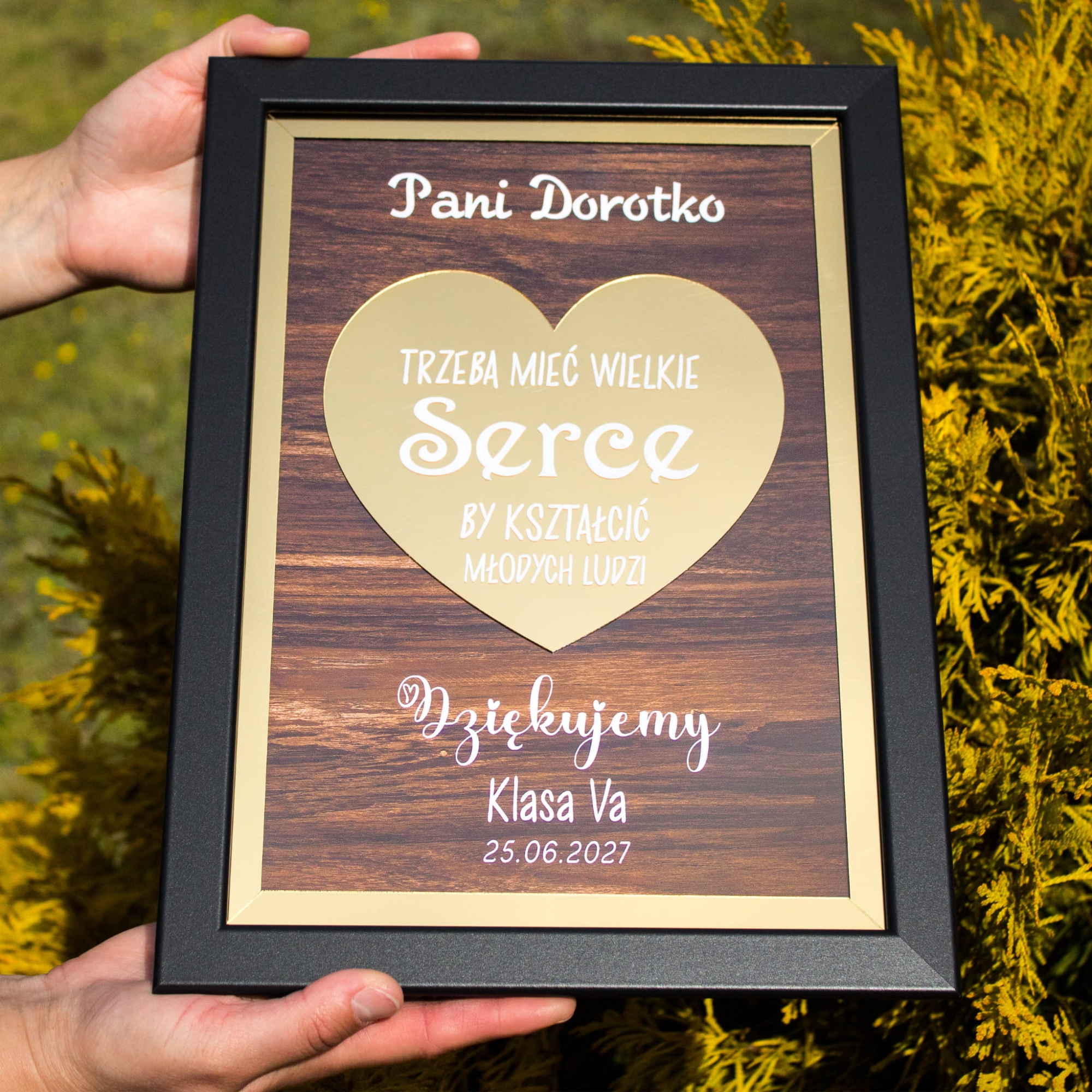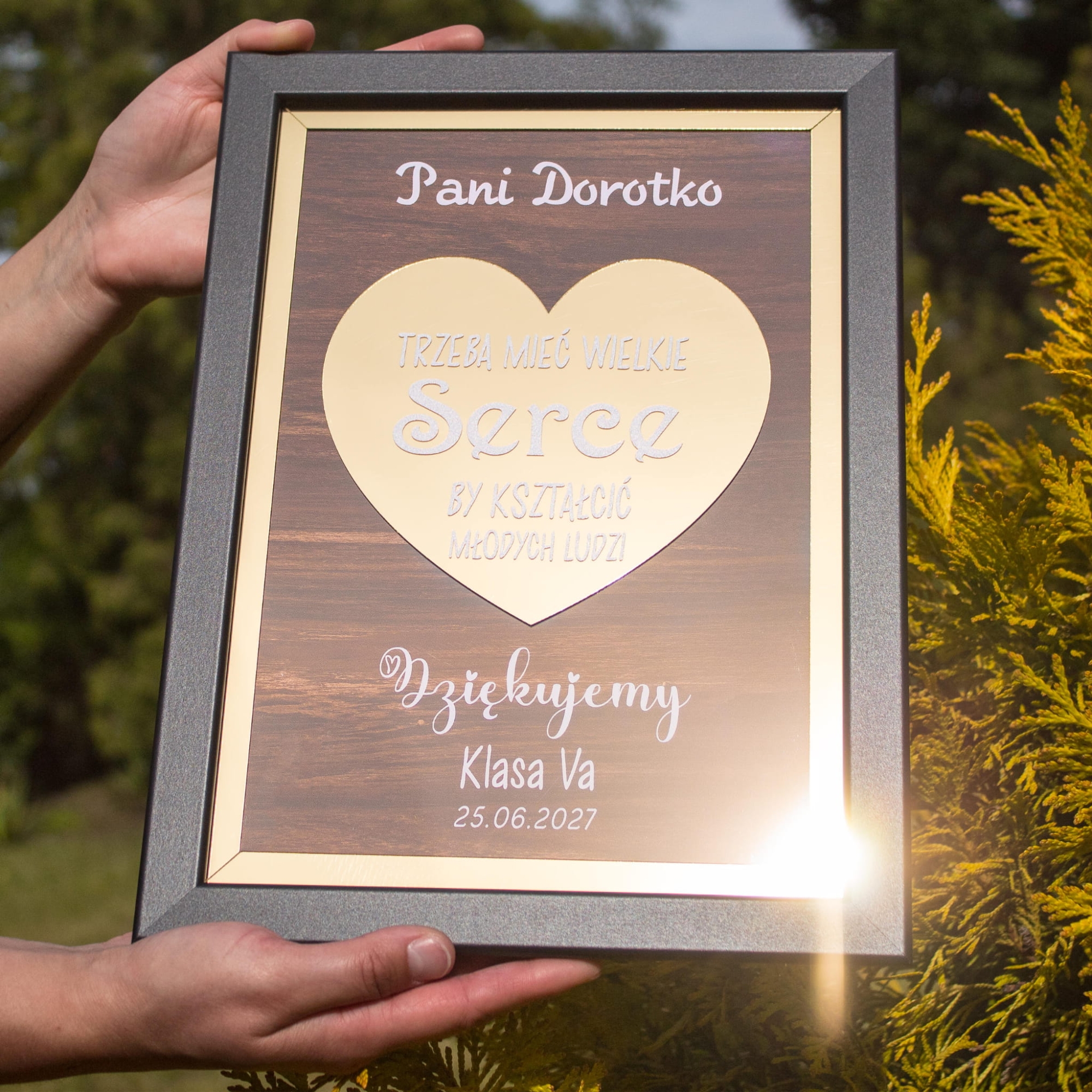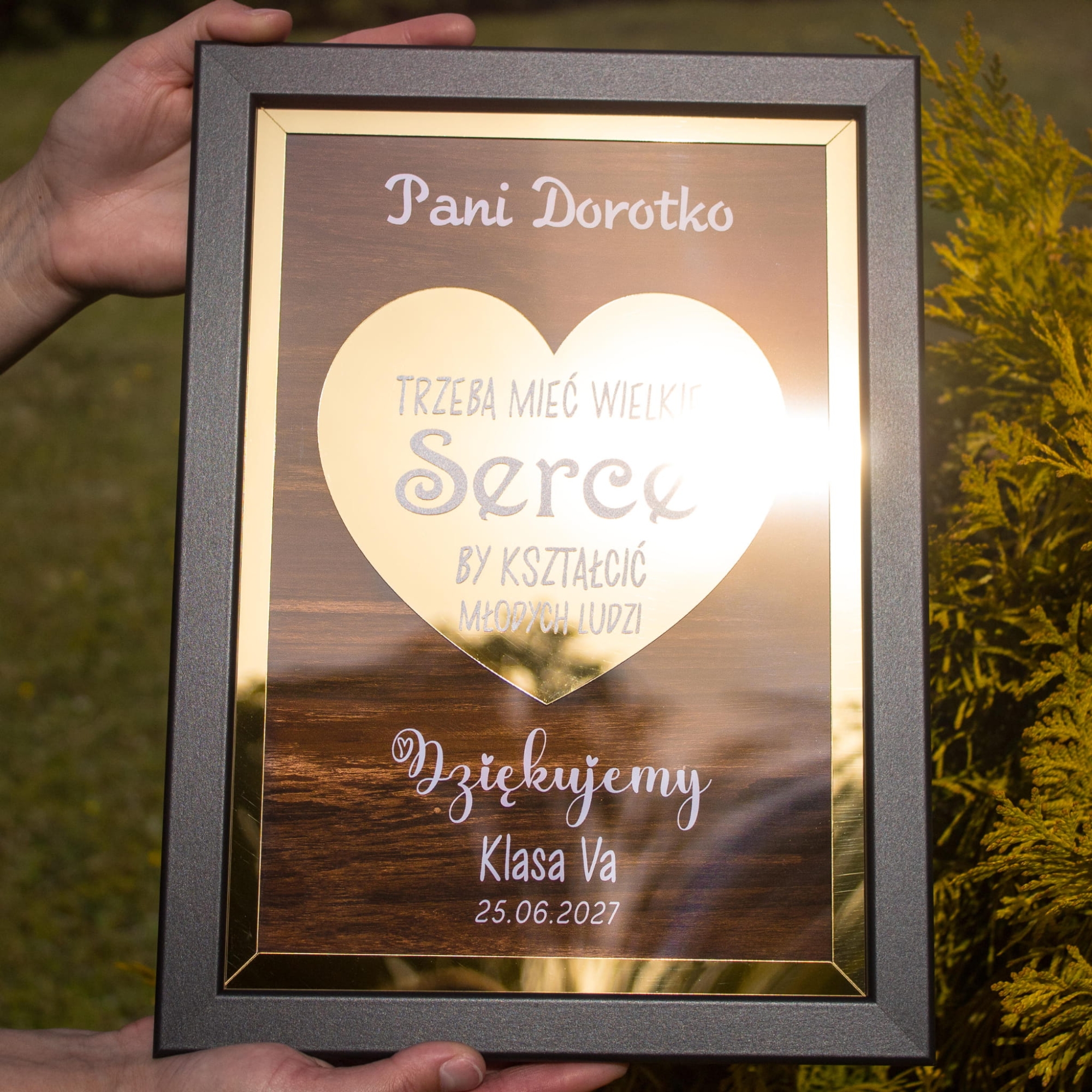 Na ciemnym tle o strukturze drewna umieszczony jest lustrzany akcent z napisem: „Trzeba mieć wielkie serce, by kształcić młodych ludzi” – cytat, który trafia prosto do serca. Całość dopełniają personalizowane dane: imię nauczyciela, klasa oraz data – dzięki temu prezent staje się jedyny w swoim rodzaju.