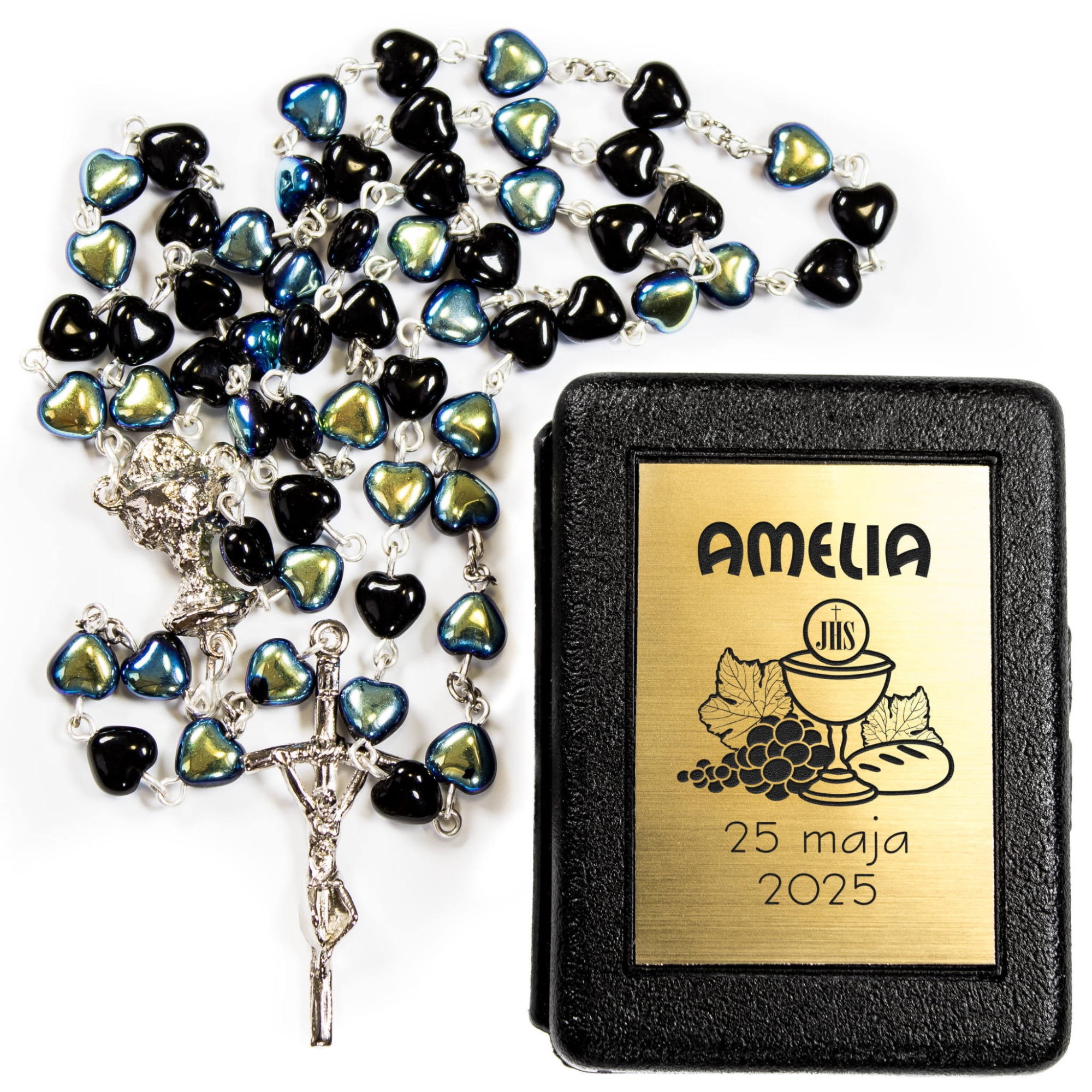 Czarny różaniec w etui z indywidualnym grawerem