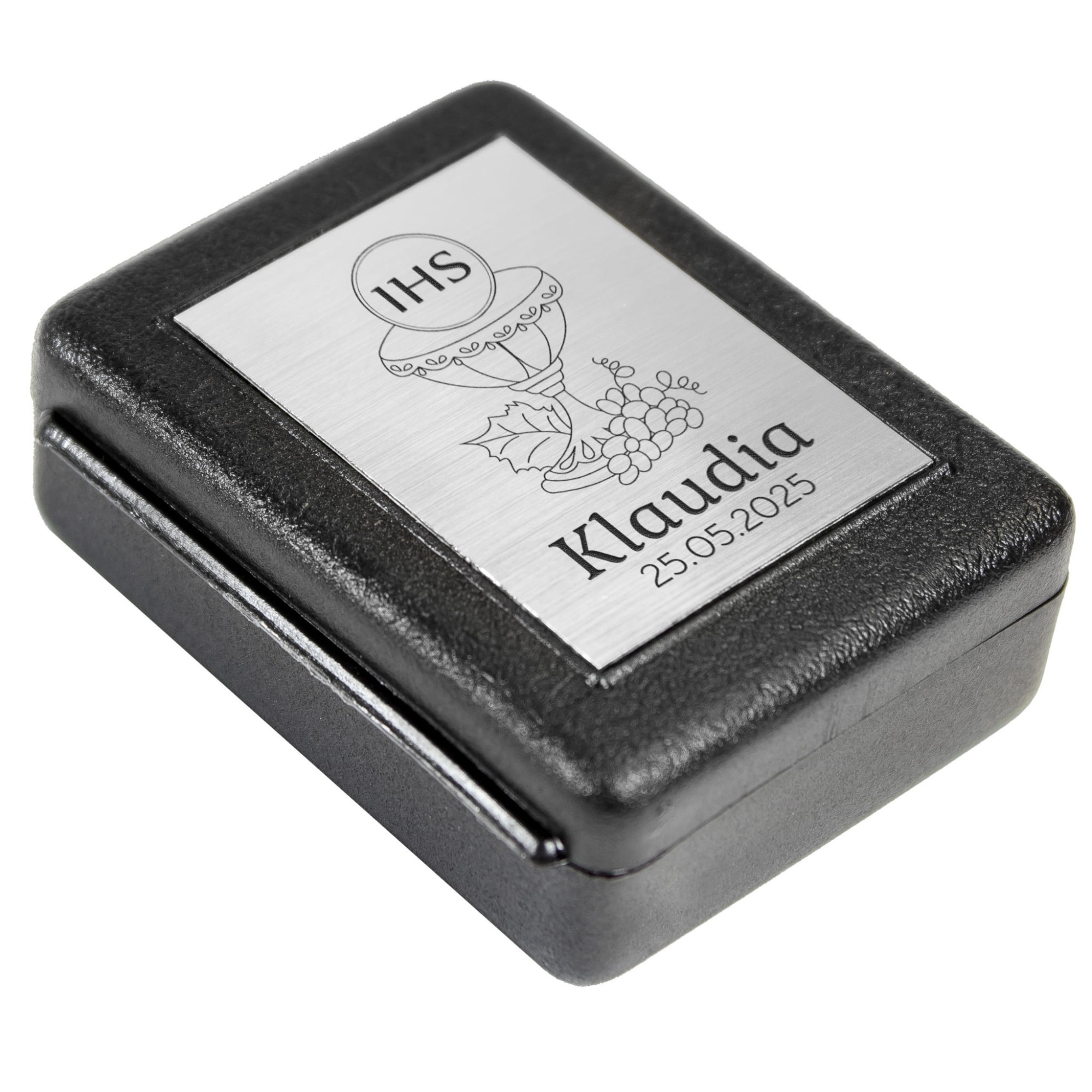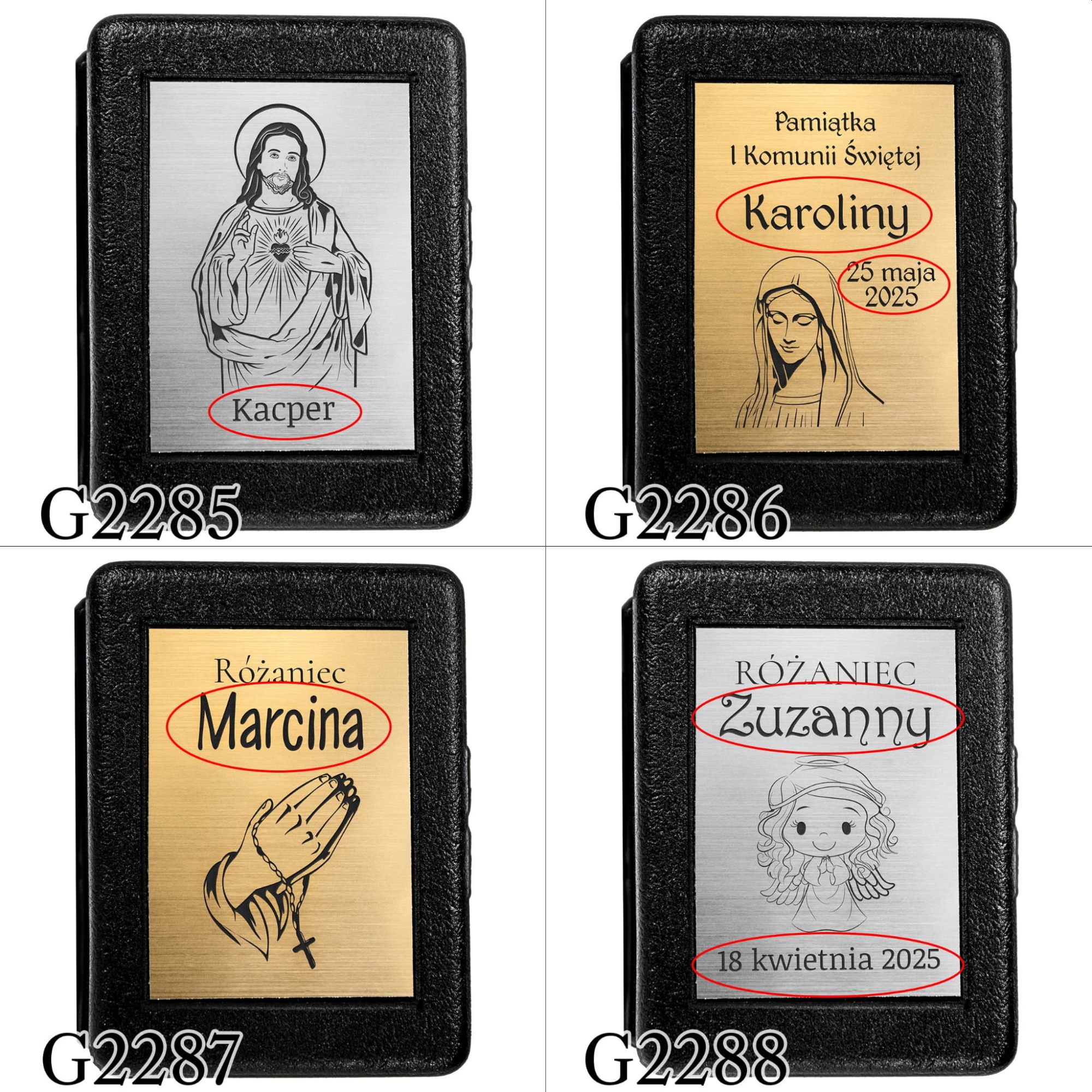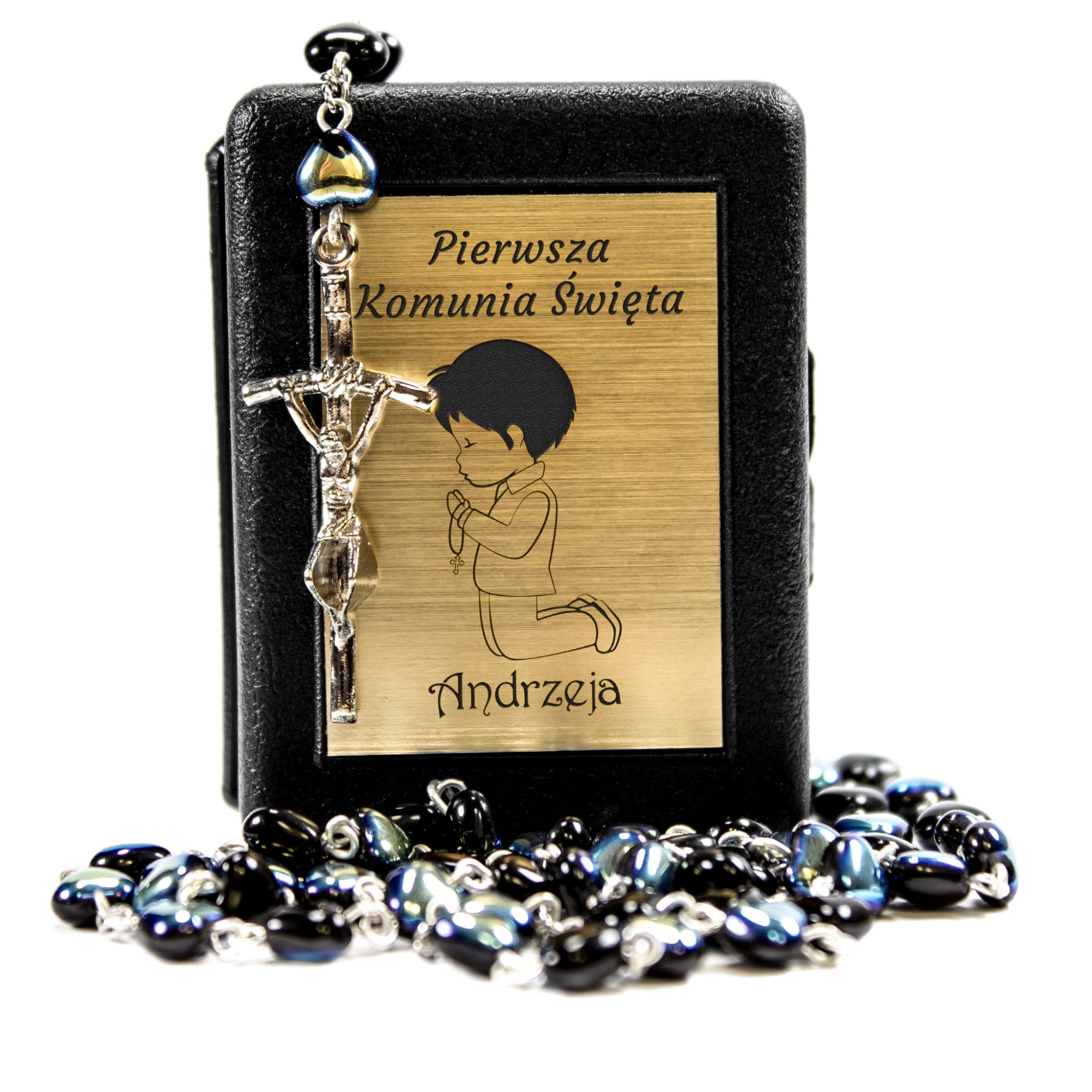 Często prezent na Komunię dla dziewczynki jak i prezent na Komunię dla chłopca to różaniec. Jest to ważny element wiary katolickiej, który od momentu przyjęcia sakramentu Komunii Świętej towarzyszy dziecku podczas modlitwy różańcowej. Nasza propozycja spersonalizowanego upominku to czarny, metalizowany różaniec z paciorkami w kształcie serduszek. Koronka połączona jest elementami o symbolice religijnej tj. kielich z hostią oraz Jezus Chrystus na krzyżu. Ozdobne opakowanie różańca komunijnego to czarne pudełeczko książeczka z tabliczką z laminatu. W naszej ofercie znajdą Państwo do wyboru dwa kolory laminatu pasujące do uroczystości I Komunii Świętej tj. złoty i srebrny. Na tabliczce zgodnie z dostępnymi wzorami wygrawerujemy imię dziecka, datę przyjęcia sakramentu Komunii Świętej itp. Dzięki personalizacji prezent na komunię w postaci różańca będzie niepowtarzalny i jeszcze bardziej wyjątkowy.