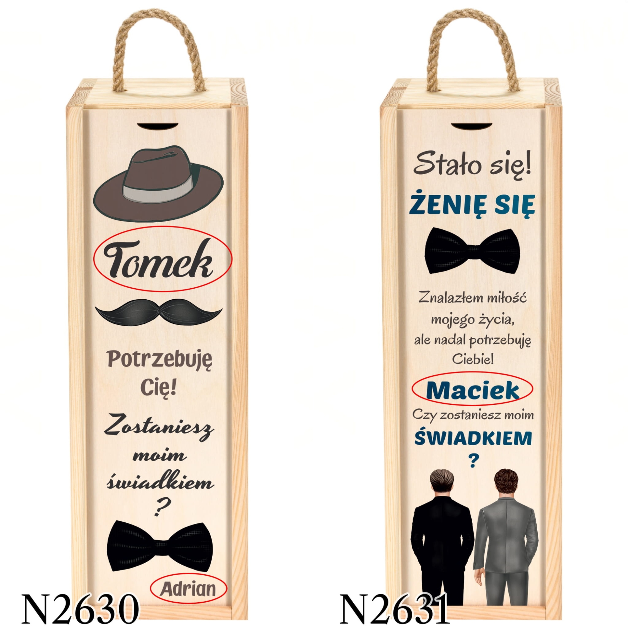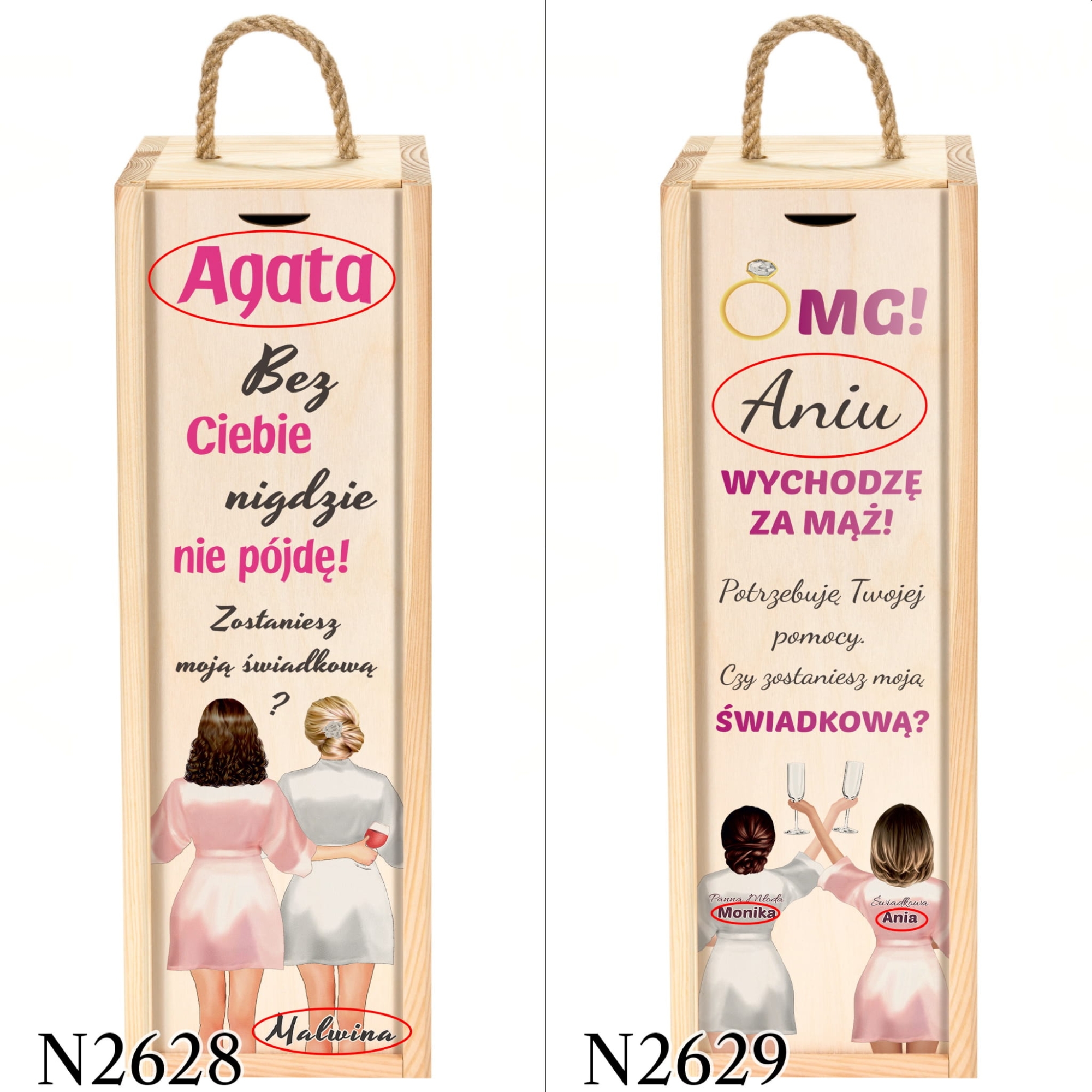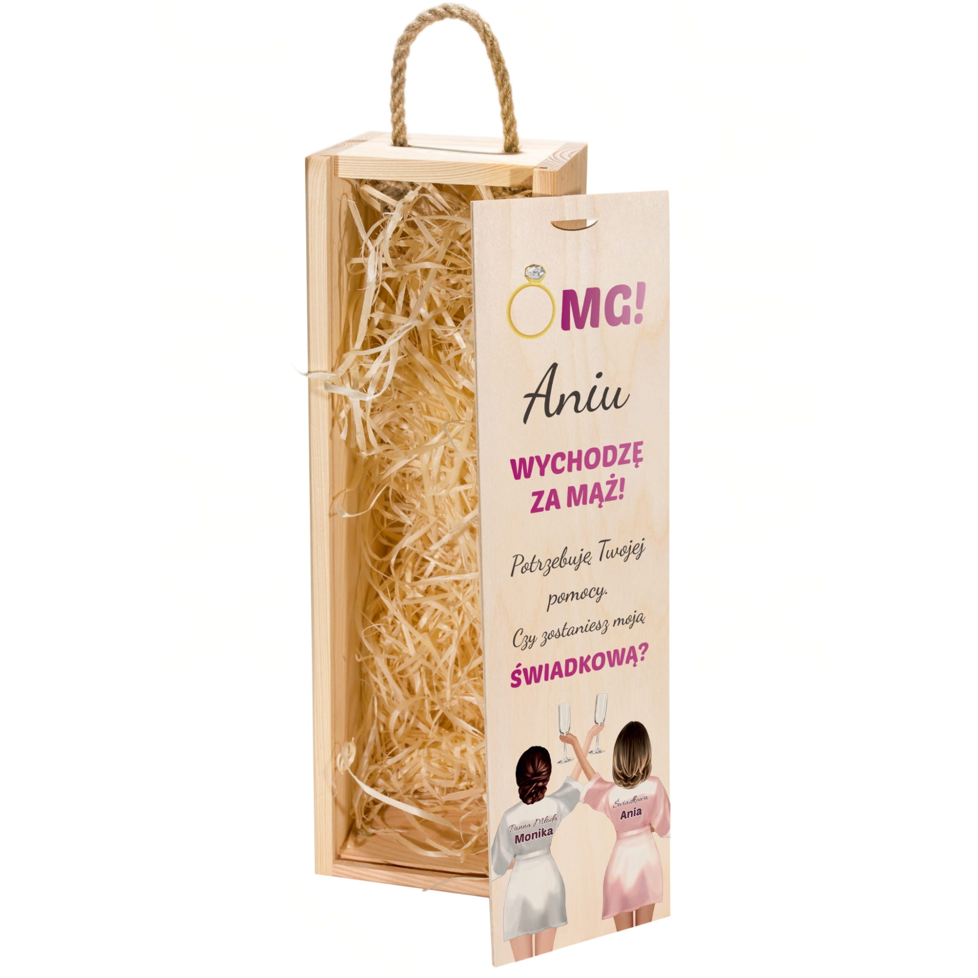 Czy zostaniesz moją świadkową? Czy zostaniesz moim świadkiem? Po podjęciu decyzji narzeczonych o ślubie te pytania towarzyszą każdej przyszłej Parze Młodej. Zaskocz swoich bliskich i spraw, aby wasza prośba o świadkowanie była oryginalna. Skrzynka na wino z pytaniem dla świadka i świadkowej to świetny pomysł, który jednocześnie będzie trwałą pamiątką. Siostra, brat, przyjaciółka, przyjaciel ktokolwiek to będzie z pewnością doceni taki sposób wyrażenia tego ważnego pytania. Drewniana skrzynka na alkohol z kolorowym nadrukiem zamykana jest na wsuwaną od góry skrzynki zasuwkę. Skrzynka wypełniona jest naturalnym, dekoracyjnym siankiem stanowiącym jednocześnie zabezpieczenie butelki. Prośba dla świadków w tej formie to doskonały pomysł, dlatego nie zwlekaj i już dziś zamów wyjątkowe skrzynki dla świadków z naszej oferty.