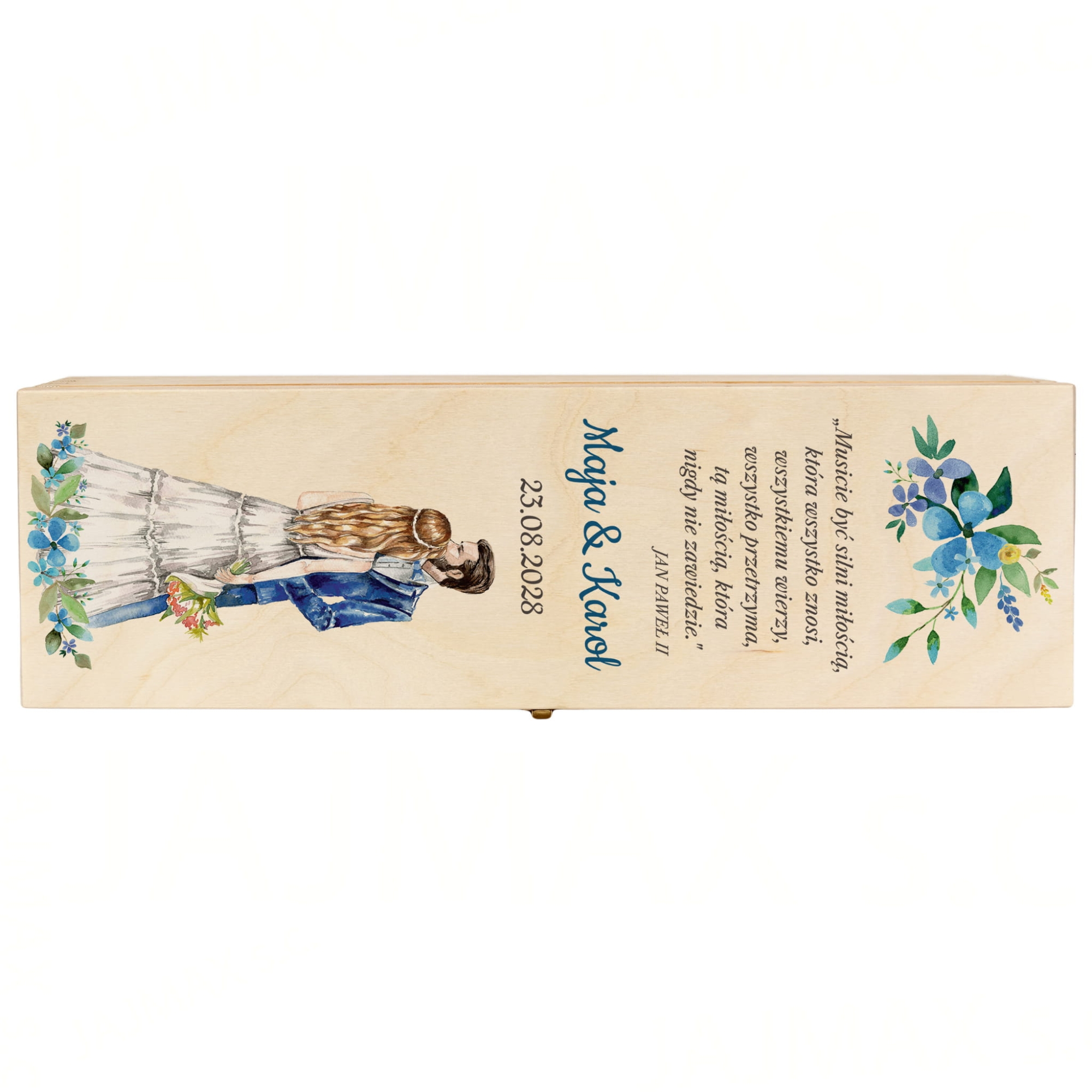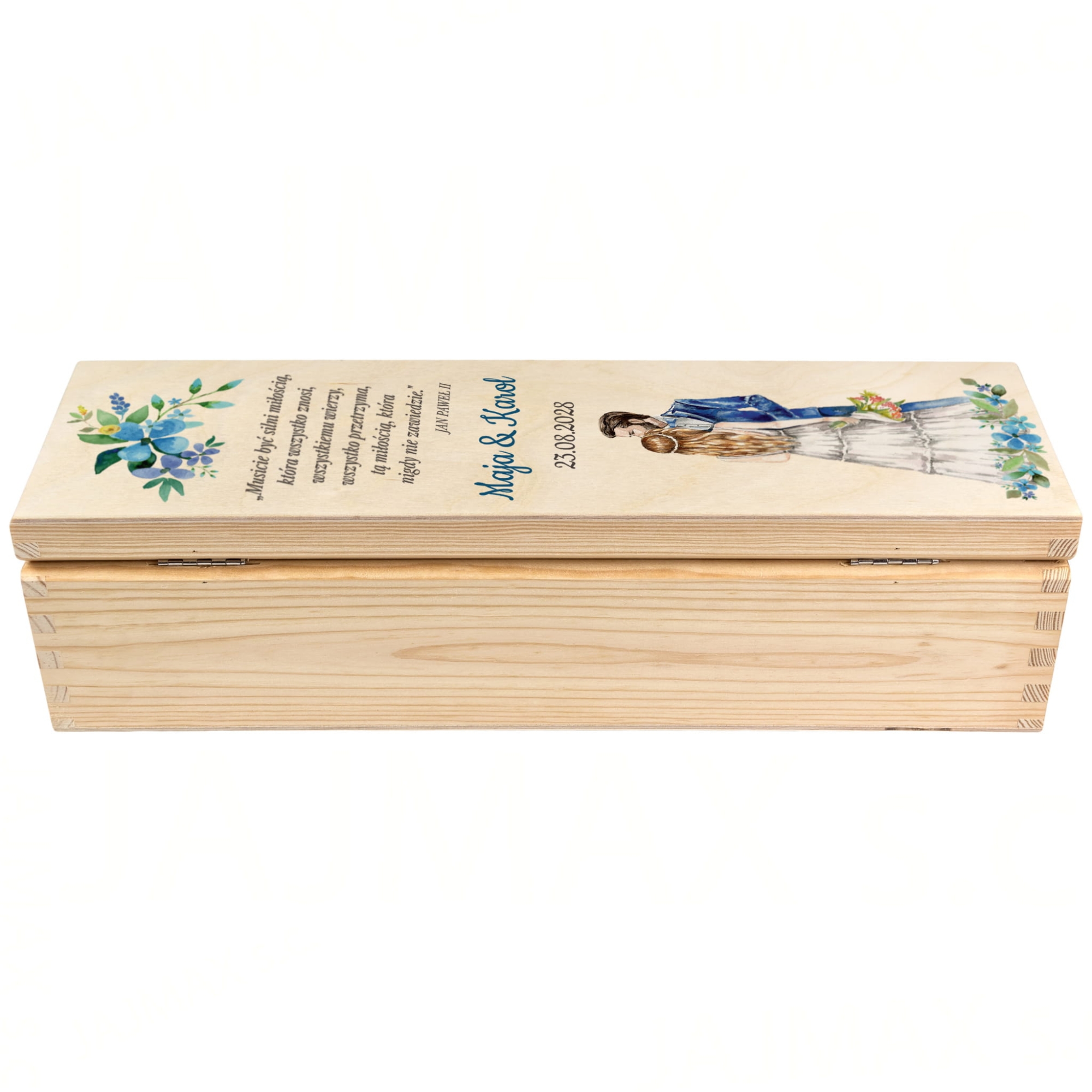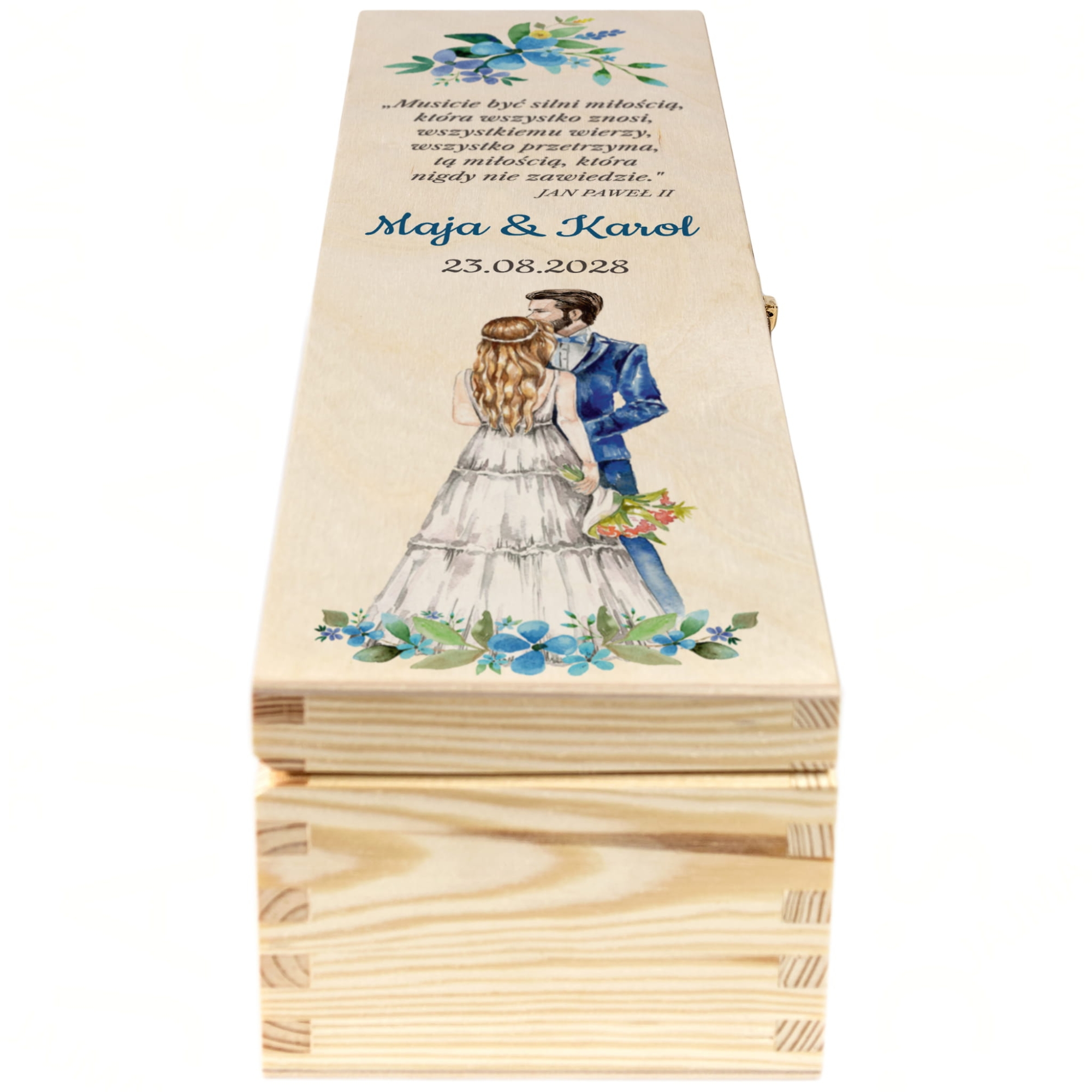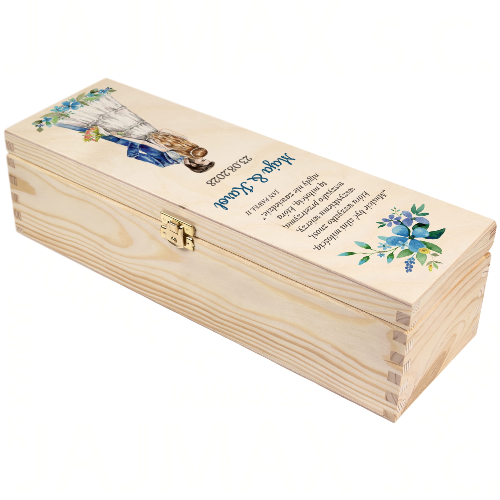 Drewno użyte do wykonania tej skrzynki jest naturalne, jasne i pięknie usłojone. Z przodu widzimy subtelną grafikę z motywem kwiatowym i parą nowożeńców w stylu akwareli – to uniwersalny, ale wzruszający projekt graficzny, który wpisuje się w ślubny klimat. Całość zamykana jest na złoty zatrzask, co nadaje skrzynce elegancji i praktyczności.