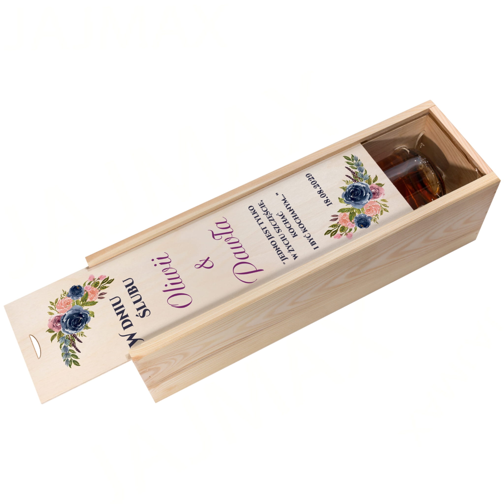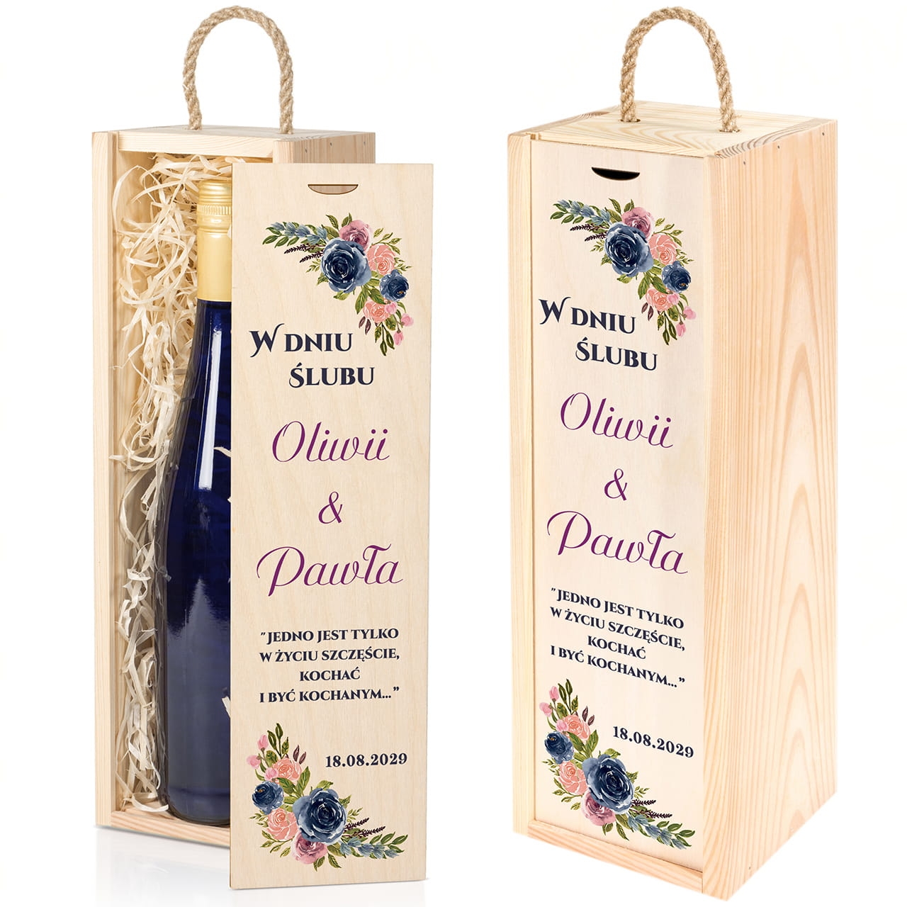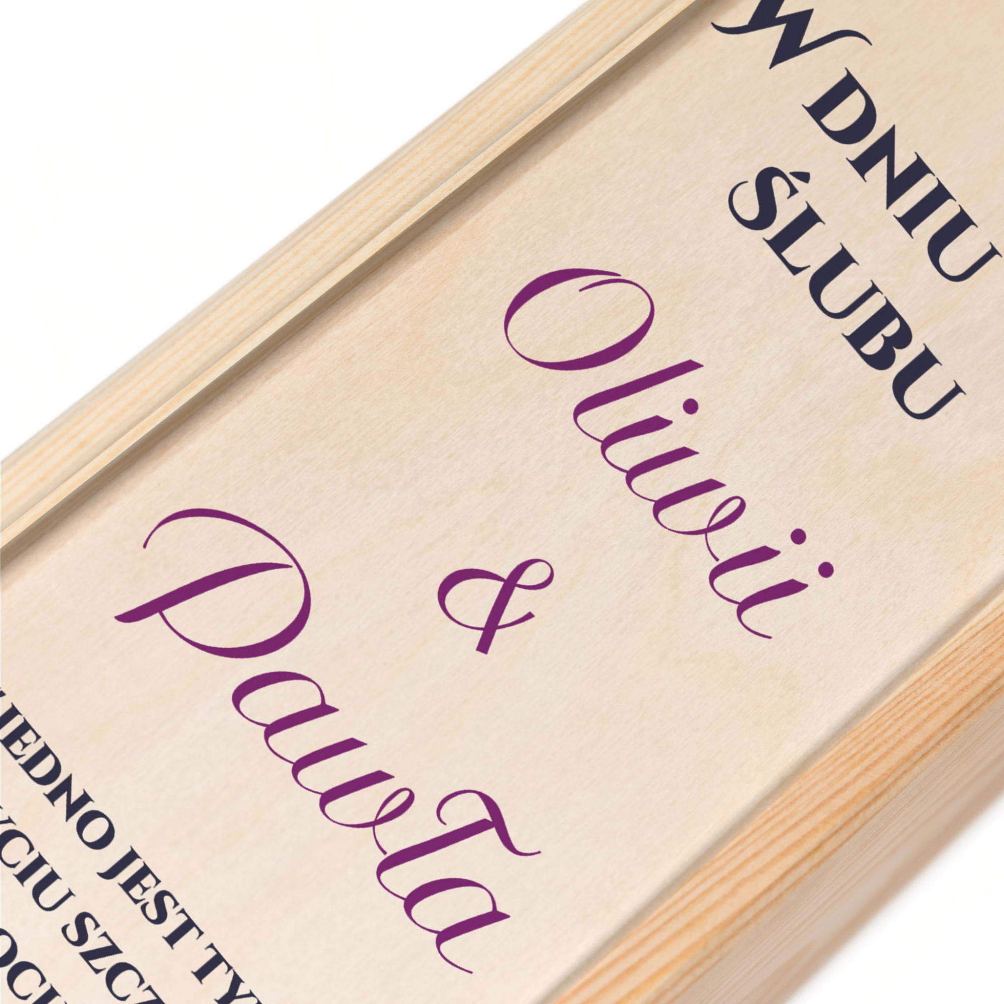 Drewniana skrzynka na wino z nadrukiem – prezent na ślub lub wesele