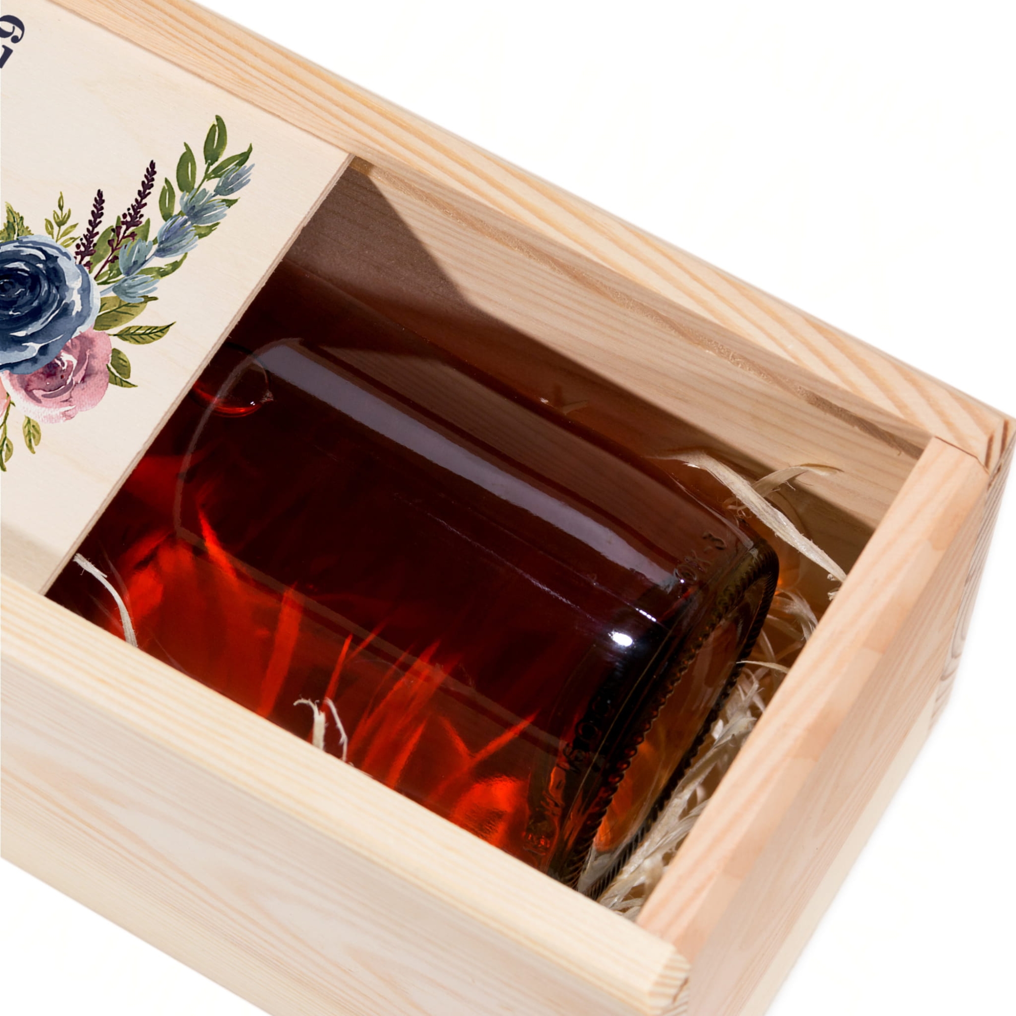 Naturalne drewno, zasuwny front i elegancki cytat „Jedno jest tylko w życiu szczęście – kochać i być kochanym…” tworzą idealne połączenie prostoty i klasy. Kwiatowy motyw w pastelowych kolorach dodaje całości subtelnego uroku, a imiona Pary Młodej i data ślubu sprawiają, że skrzynka staje się wyjątkową pamiątką na długie lata.