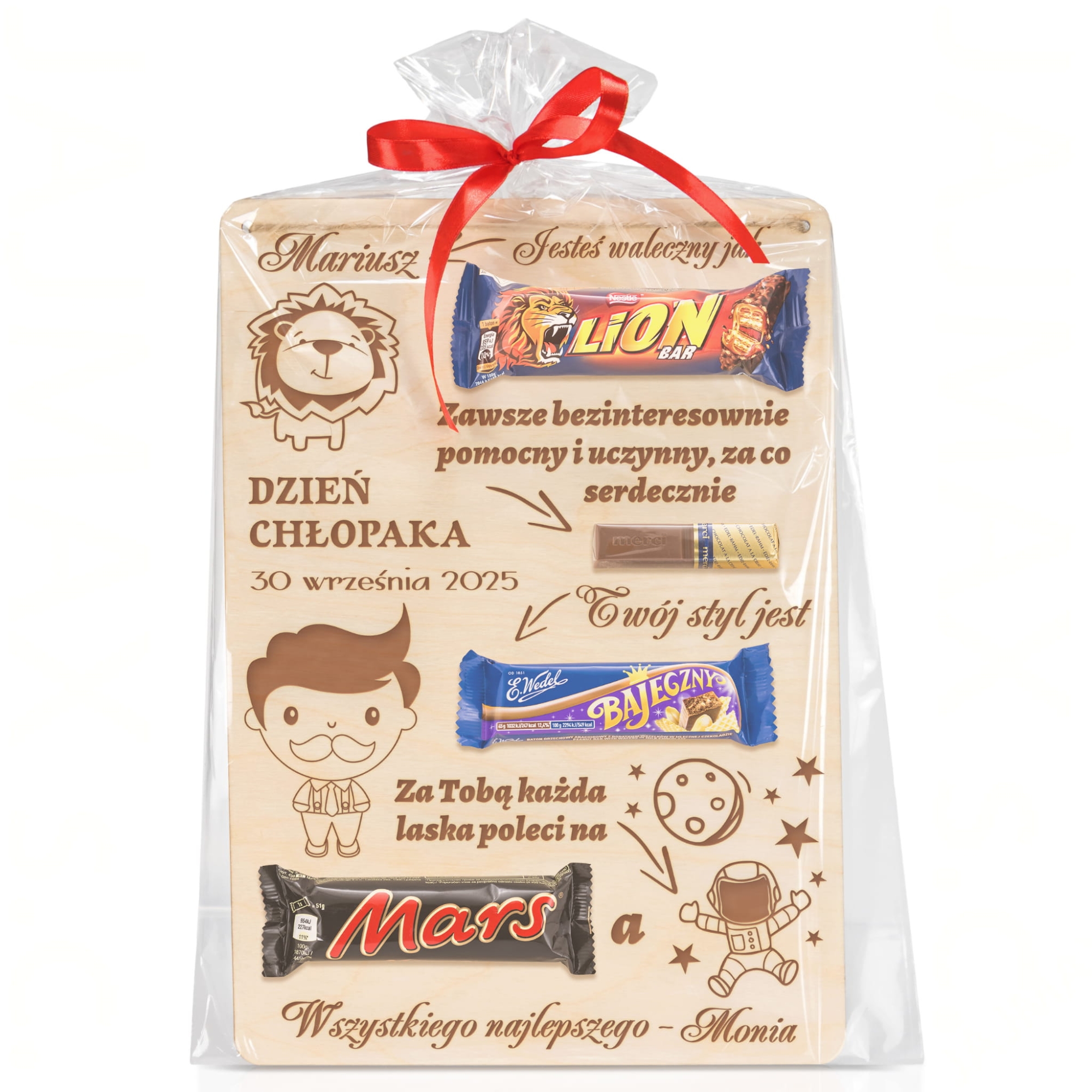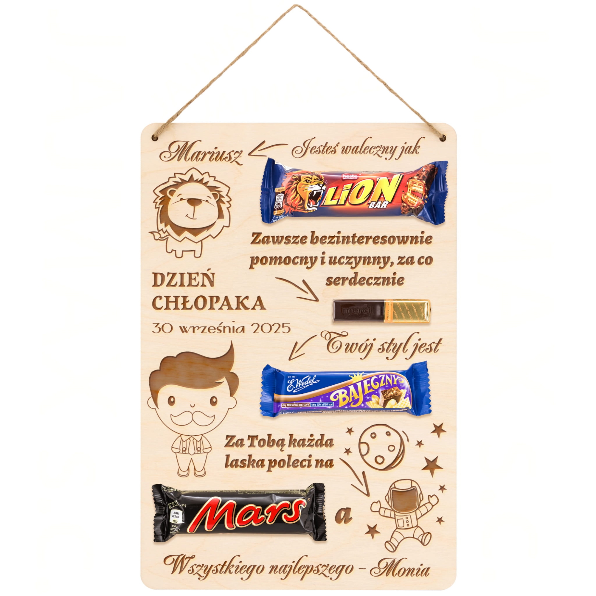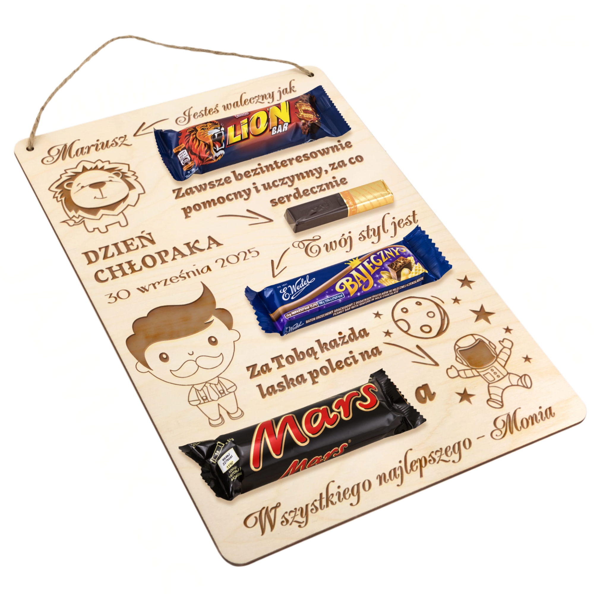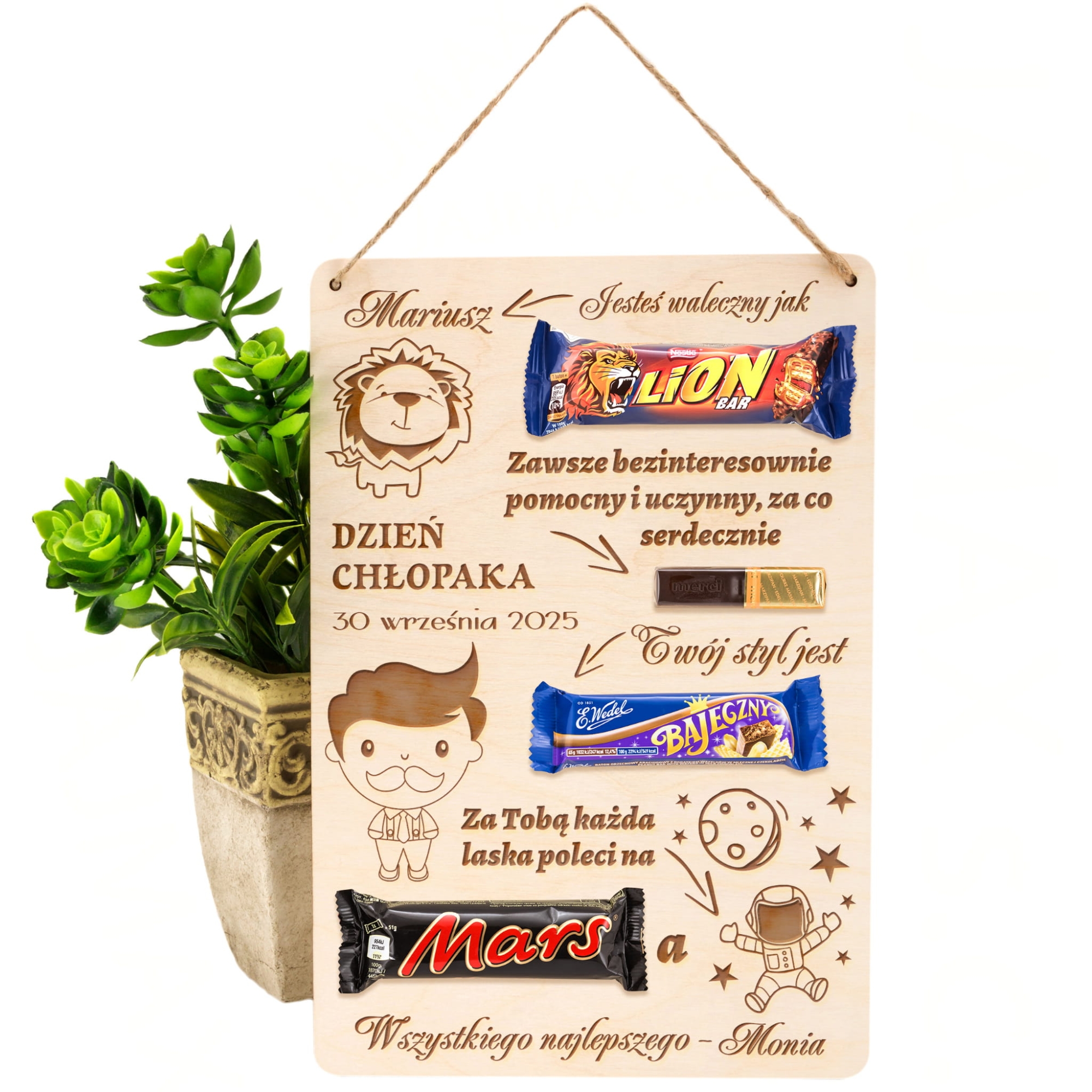 Szukasz zabawnego i oryginalnego prezentu dla chłopaka na Dzień Chłopaka? Mamy dla Ciebie super opcję. Słodki dyplom z grawerem jako prezent na Dzień chłopaka. Uroczy tekst wpasowany w nazwy popularnych słodyczy, które dokupisz i wkleisz na tabliczkę to upominek idealny dla każdego faceta. Tabliczka w kształcie prostokąta jest duża i świetnie ozdobi każde wnętrze. Taki prezent na Dzień Chłopaka z pewnością wywoła uśmiech na twarzy obdarowywanej osoby. Za pomocą personalizacji ten upominek dla chłopaka będzie jedyny w swoim rodzaju.