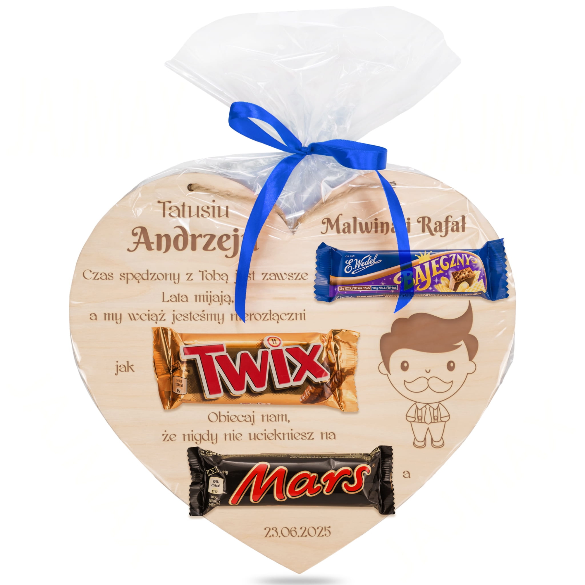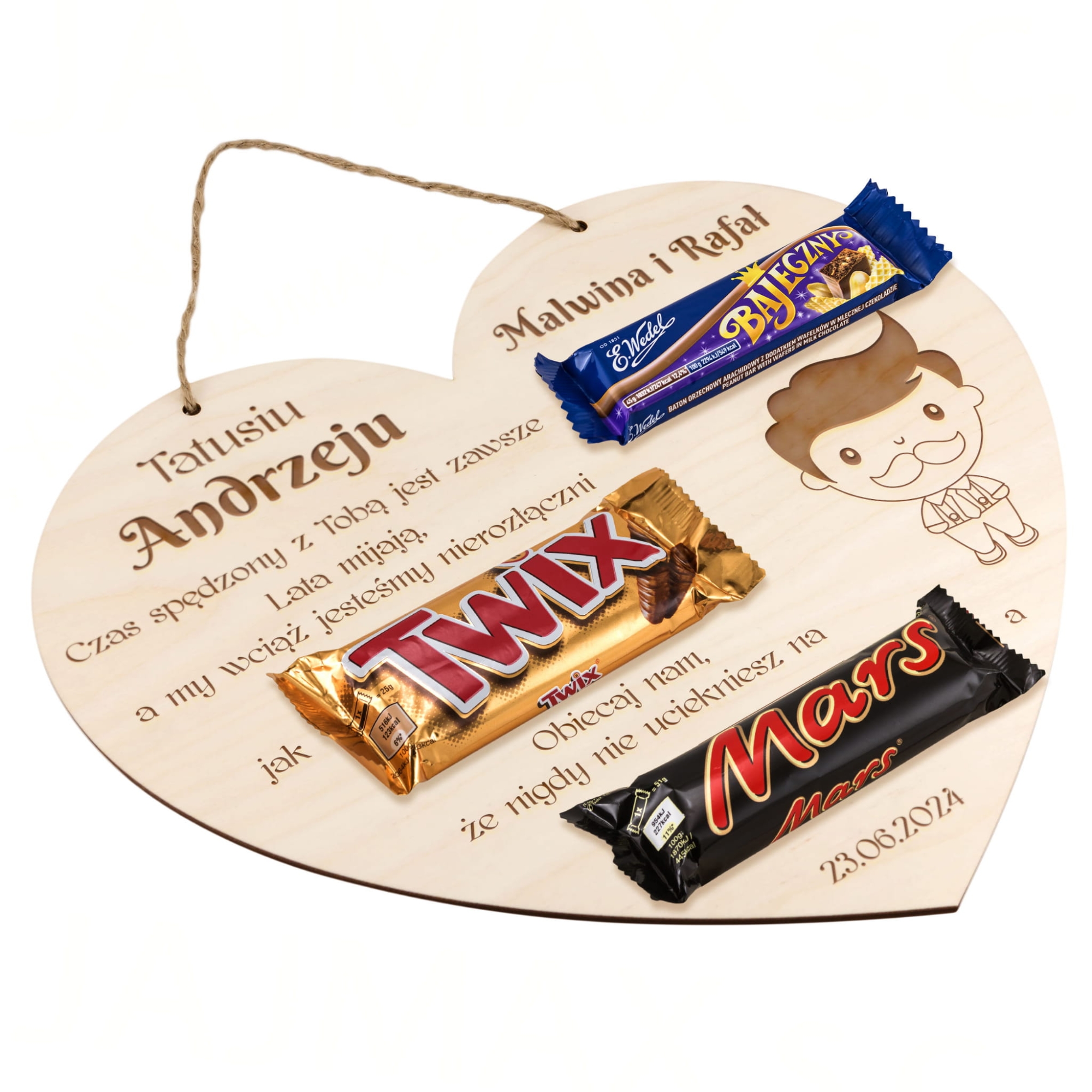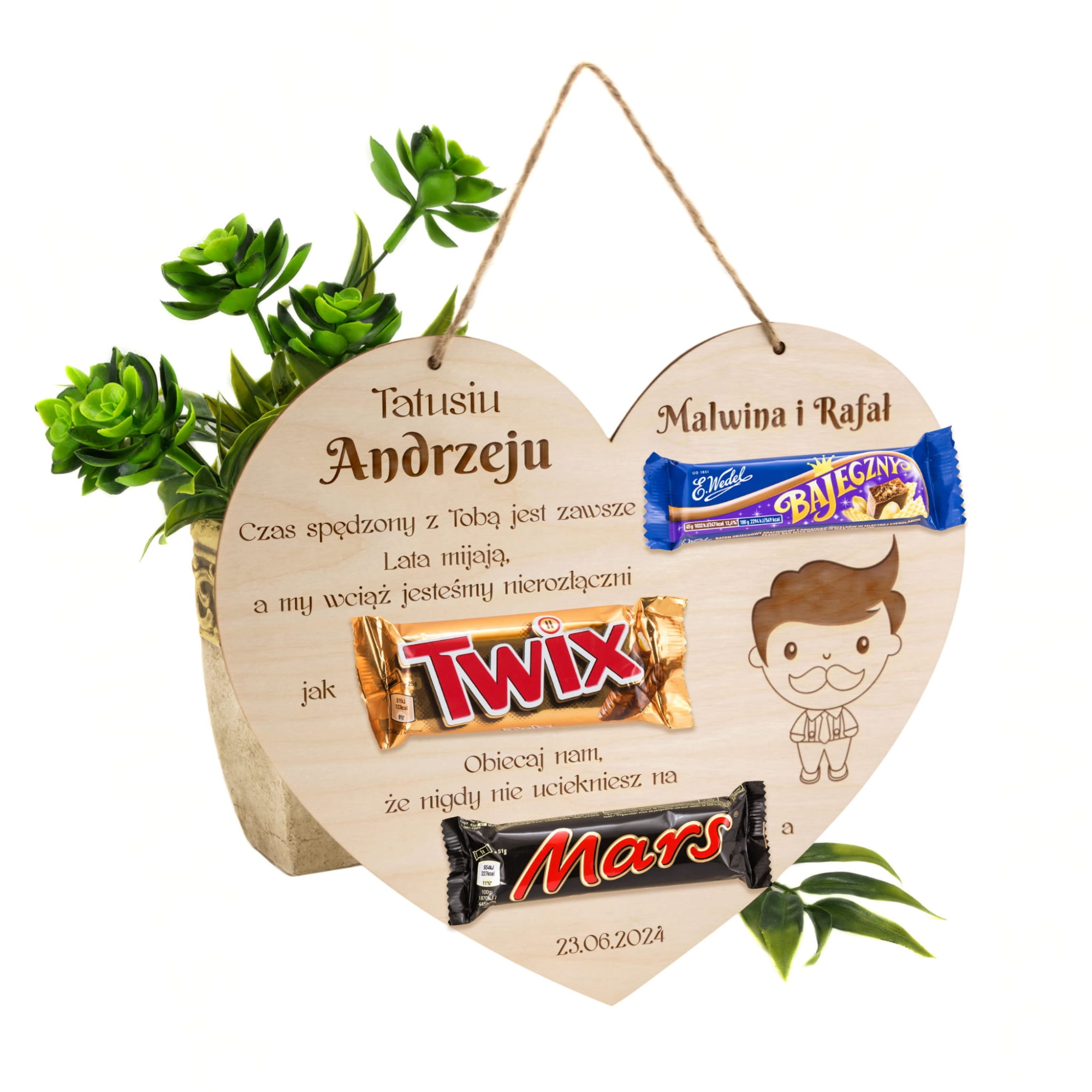Drewniane serce tabliczka ze słodyczami zabawny prezent dla taty z grawerem