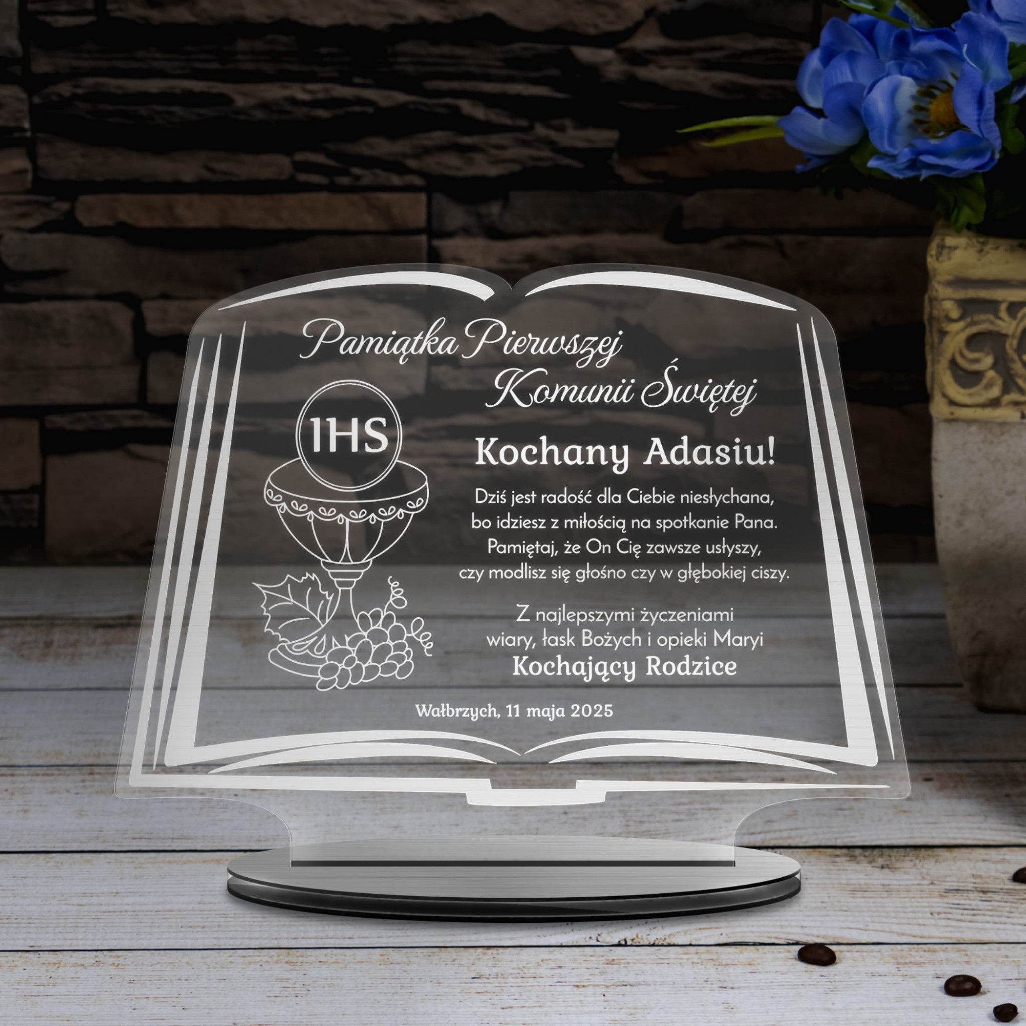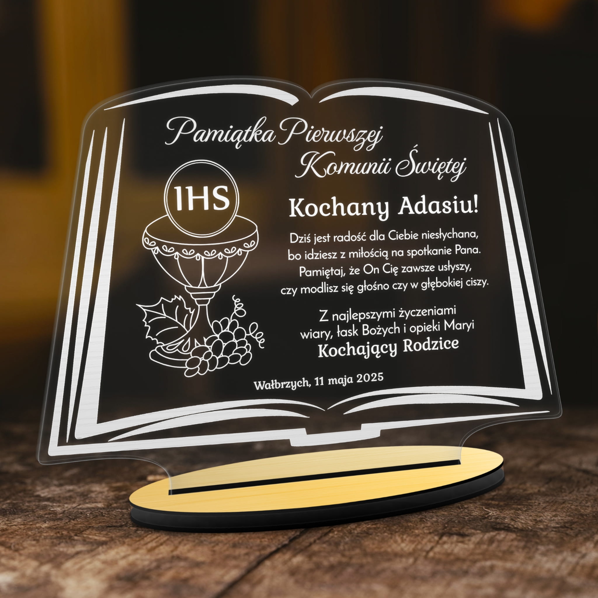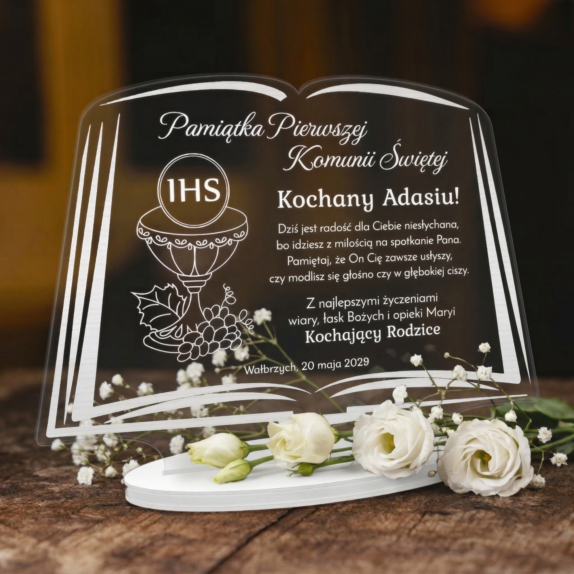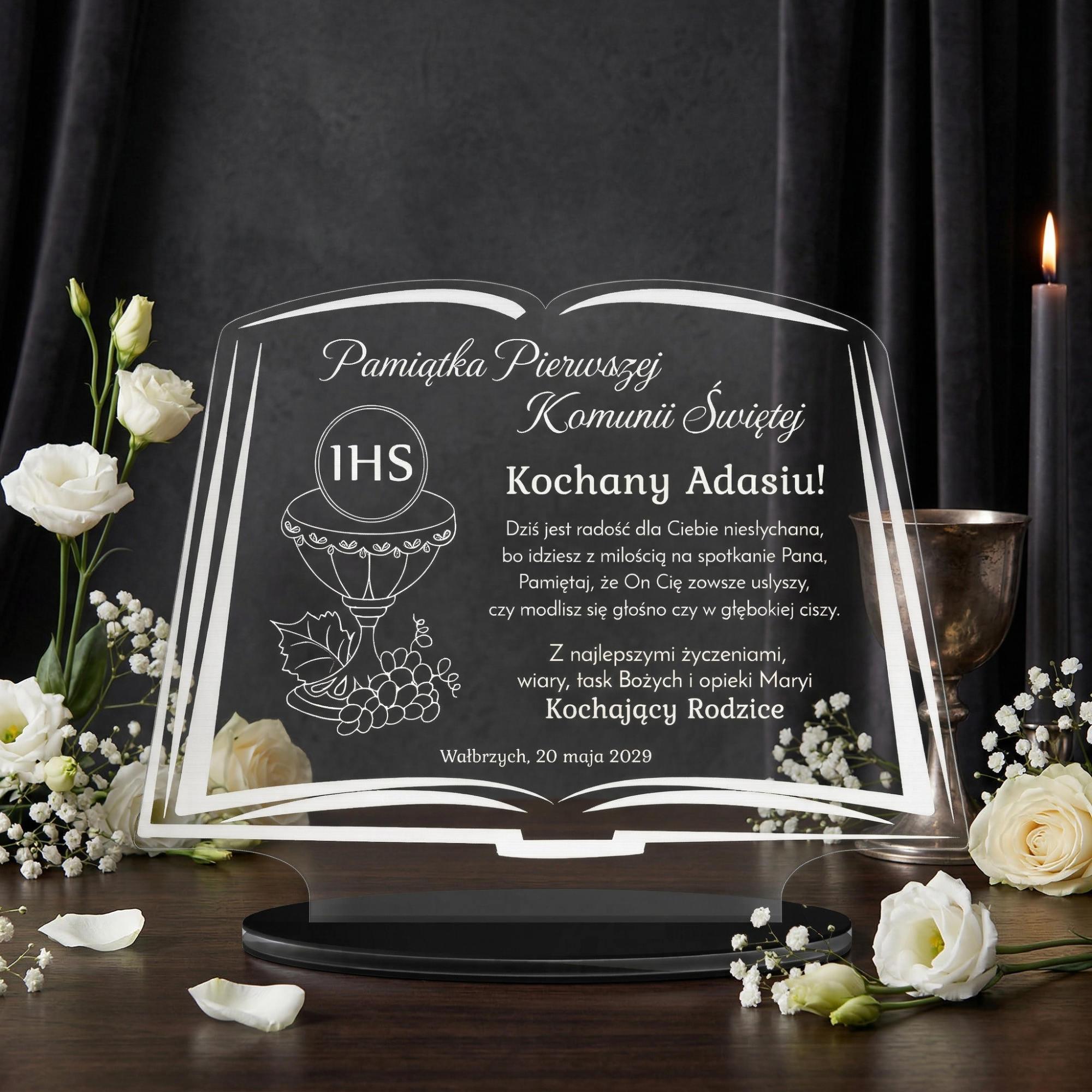 Jeśli wkrótce będziesz gościem na Komunii i szukasz odpowiedniego prezentu doskonale trafiłeś. Proponujemy oryginalną kartkę z życzeniami w formie statuetki w kształcie księgi ze szkła akrylowego. W celu podkreślenia charakteru sakramentu I Komunii Świętej stworzyliśmy wiele motywów graficznych o symbolice religijnej. Sprawdzi się jako prezent od dziadków, prezent od rodziców, prezent od Ojca Chrzestnego, prezent od Matki Chrzestnej, a także innych członków rodziny. Spersonalizowany upominek to zawsze wyraz zaangażowania ze strony gościa. Indywidualne życzenia jakie dla Ciebie wygrawerujemy dają Ci szansę podarowania dziecku wyjątkowej pamiątki. Taki upominek będzie przywoływał wspomnienia o tym szczególnym dniu przez długie lata. Do wyboru aż 4 kolory podstawek: biały, czarny, złoty, srebrny. Statuetka jest wycinana i grawerowana metodą laserową na urządzeniach najwyżej jakości. Po uroczystości Komunii statuetka będzie z powodzeniem pełniła rolę dekoracji w pokoju dziecka.