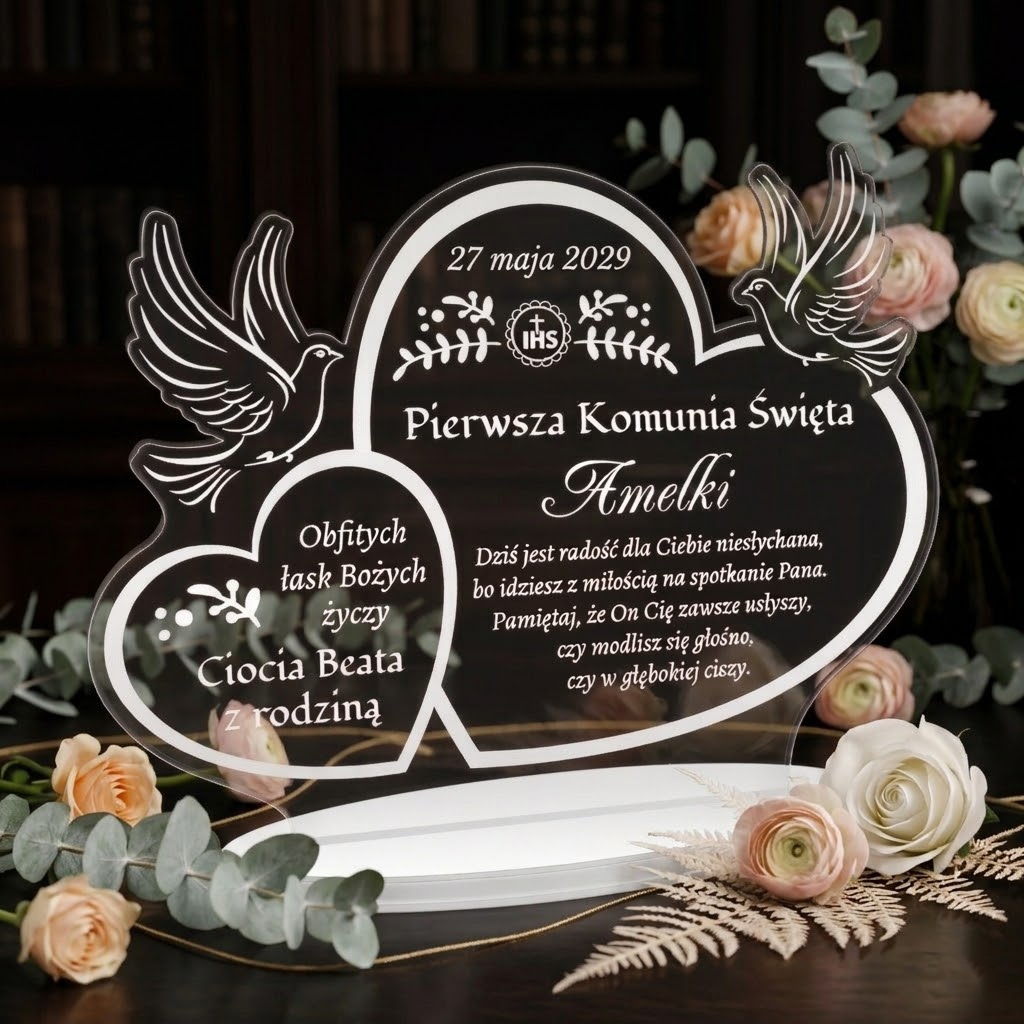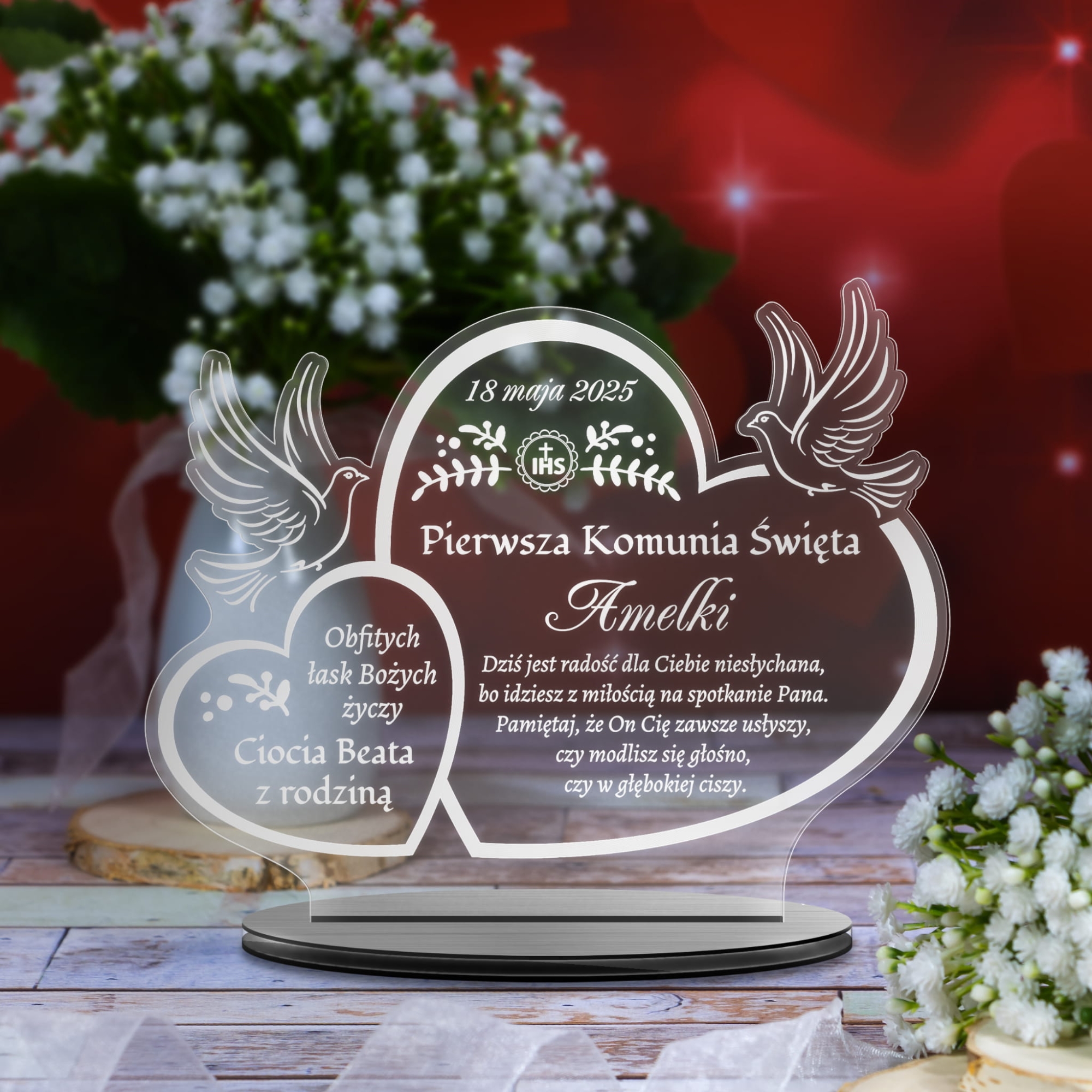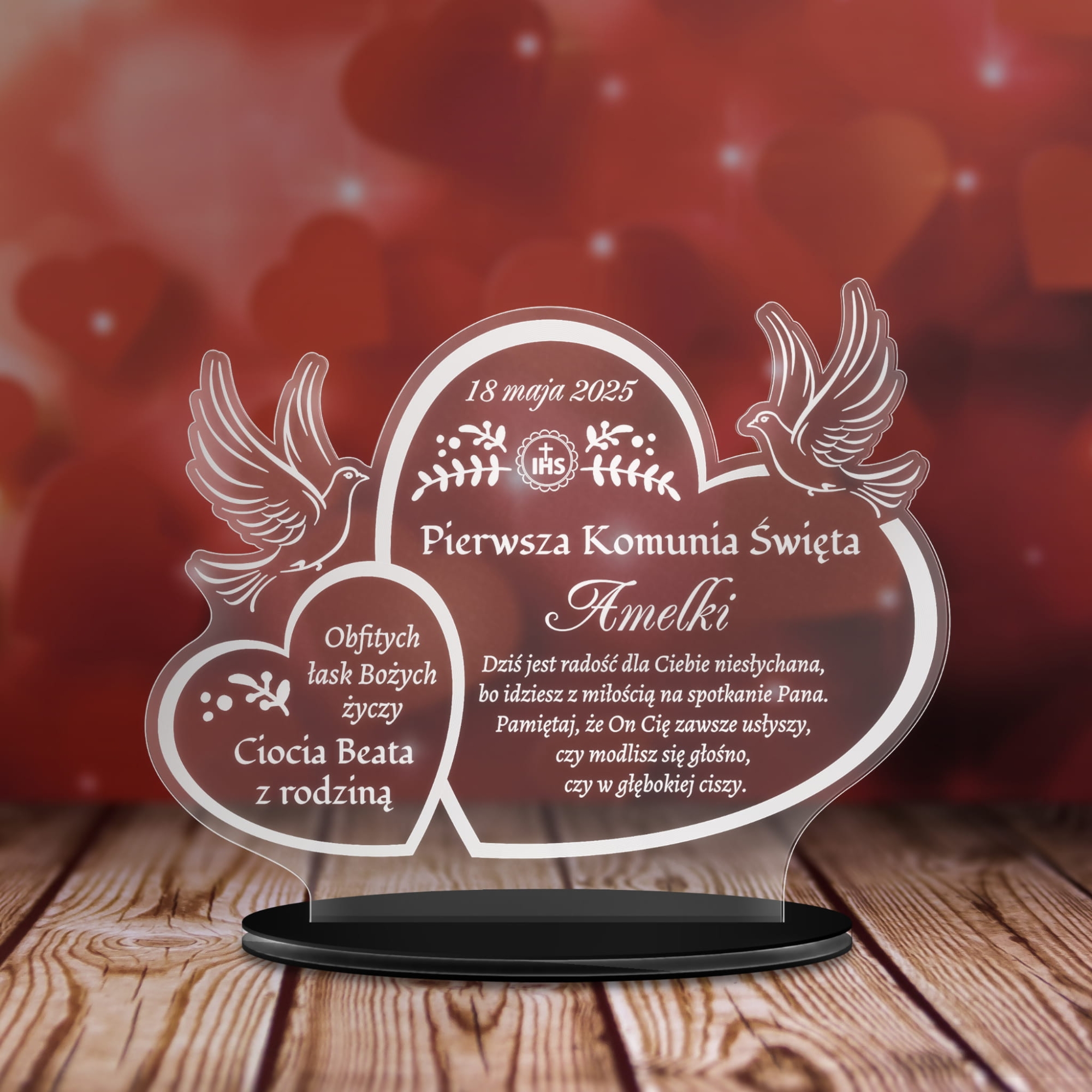 Statuetka akrylowa dwa serca z gołębiami prezent na komunię z dedykacją, pamiątka I Komunii Świętej