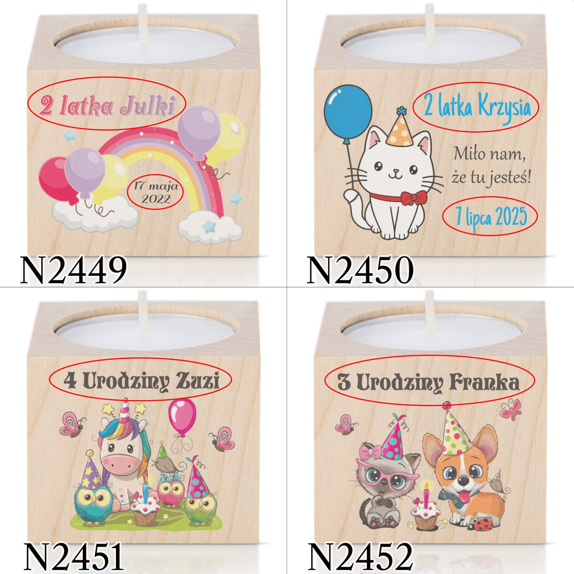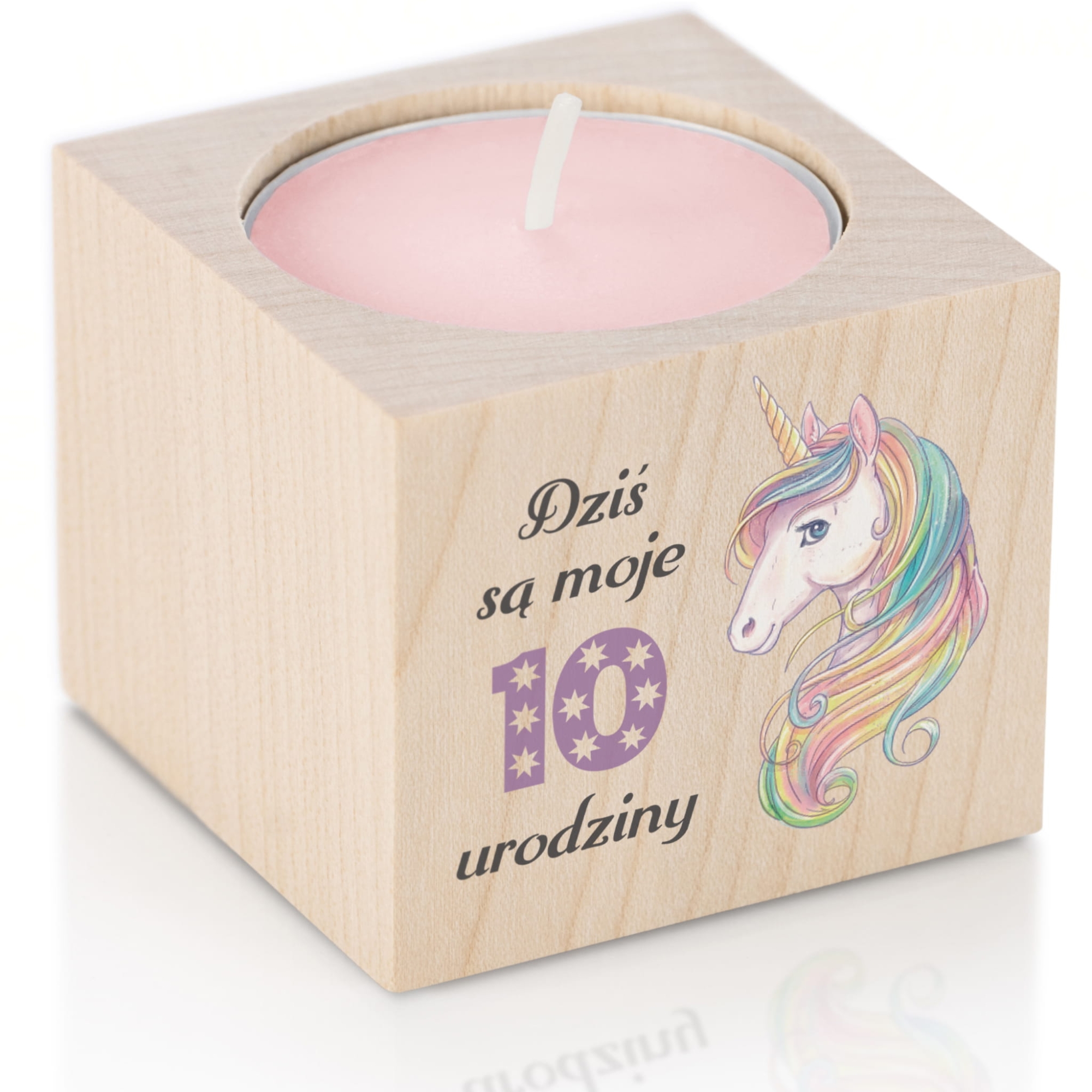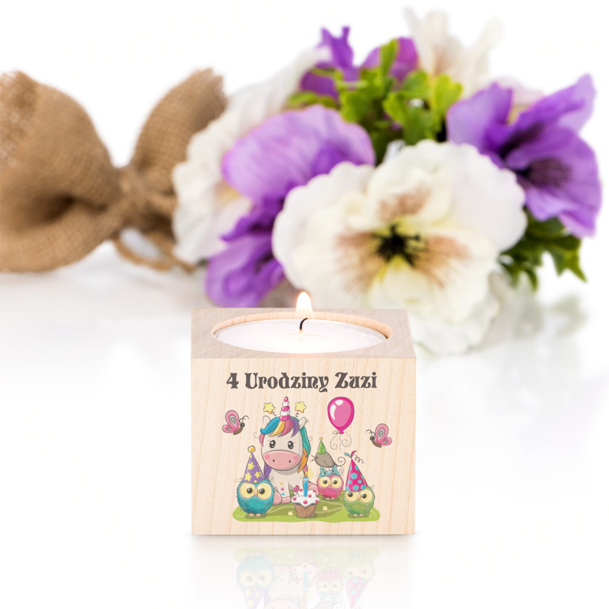 Drewniany świecznik na tealight upominki dla gości na urodziny z nadrukiem