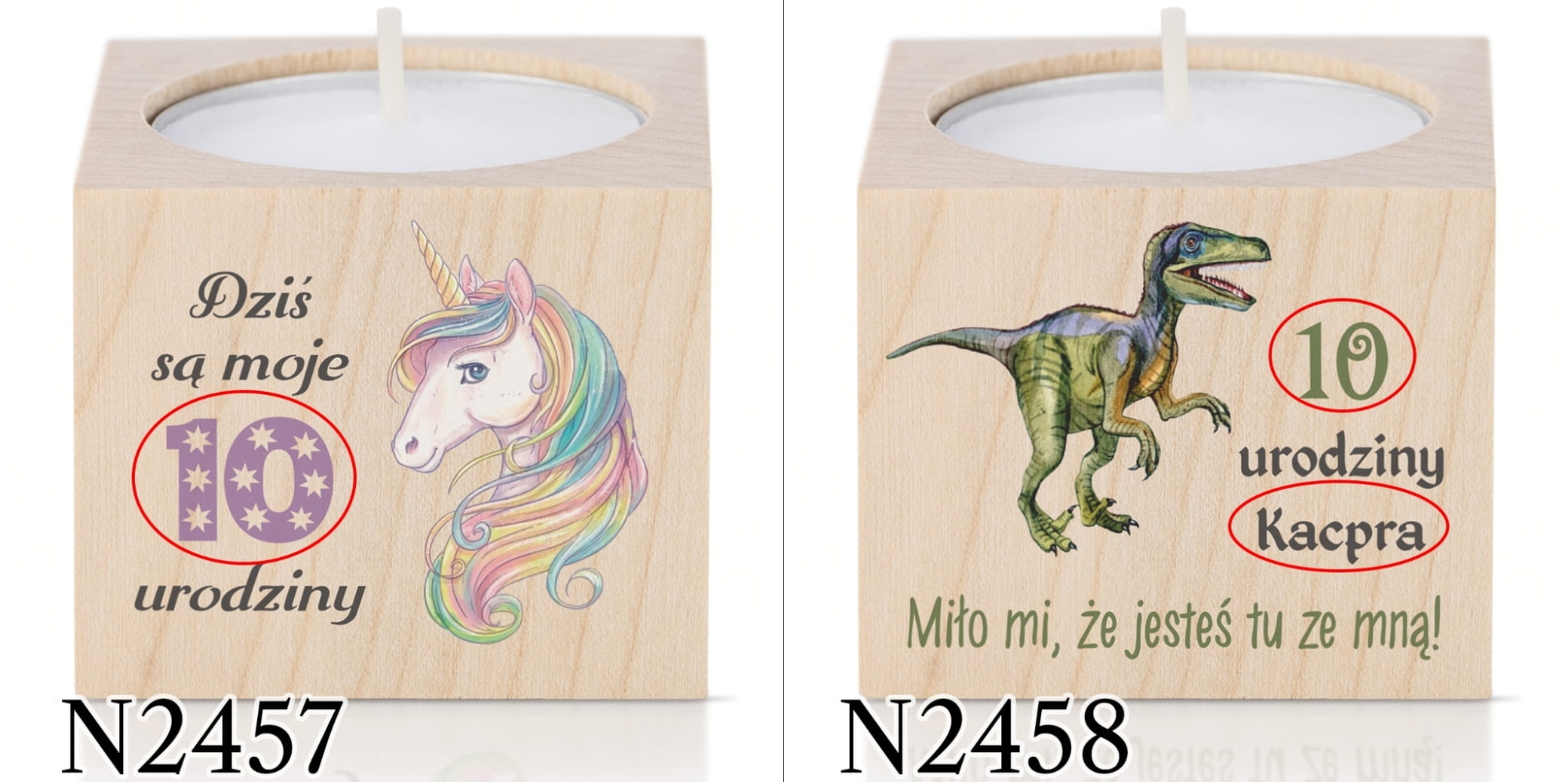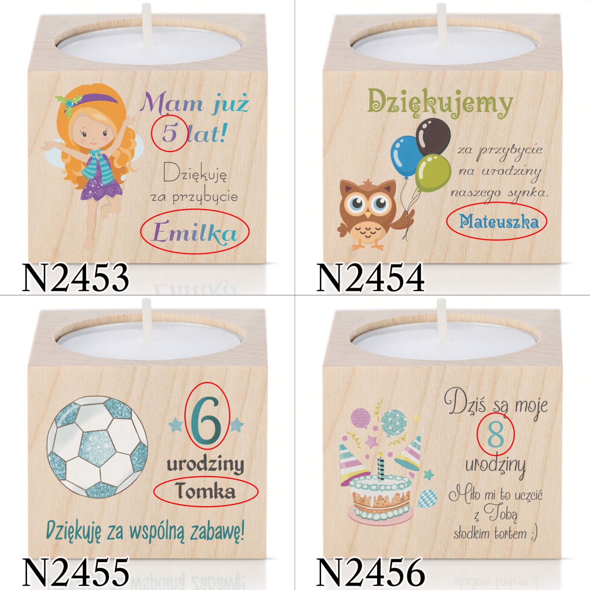 Jeśli organizujesz przyjęcie urodzinowe dziecka na roczek lub kolejne urodzinki już teraz kup podziękowania dla gości z naszej oferty. Nasza propozycja to drewniany świecznik z kolorowym nadrukiem. Takie upominki dla gości na urodziny to super pomysł zarówno na imprezie dla rodziny jak i na przyjęciu urodzinowym dla kolegów i koleżanek dziecka. Piękne wzory z grafikami pasującymi na urodziny dla dziewczynki i na urodziny dla chłopca. Podziękowanie dla gości świeczniki to super pamiątka, która będzie odpowiednia zarówno dla dorosłych jak i dzieci.